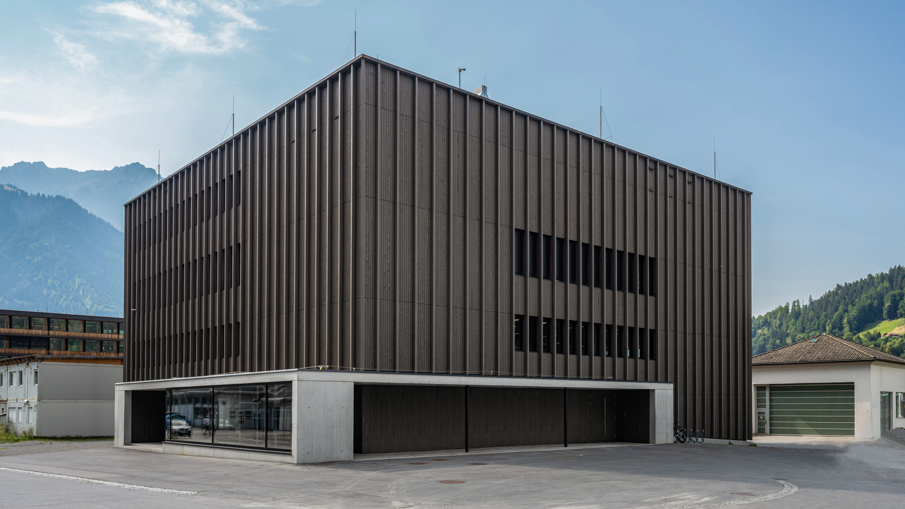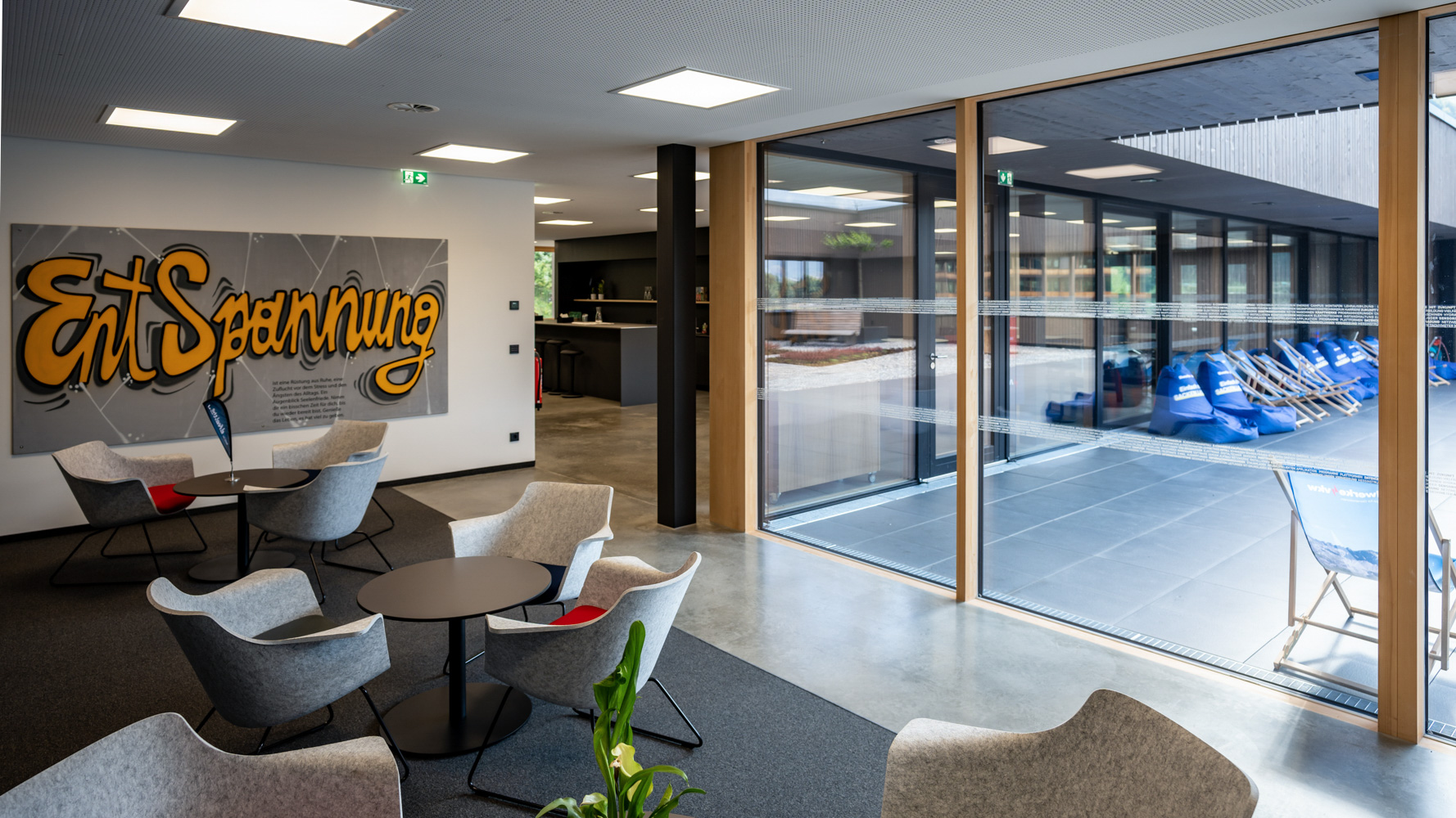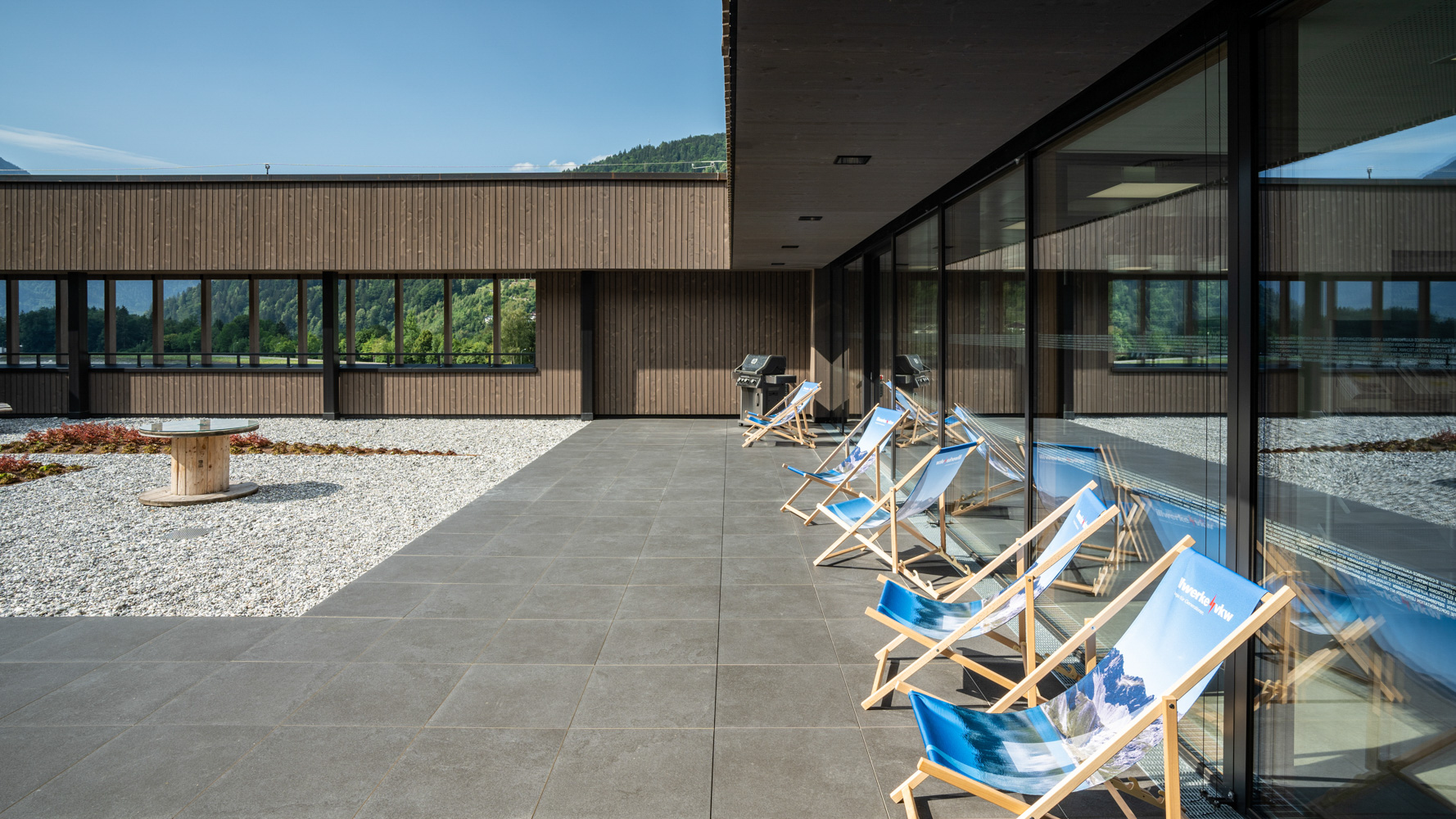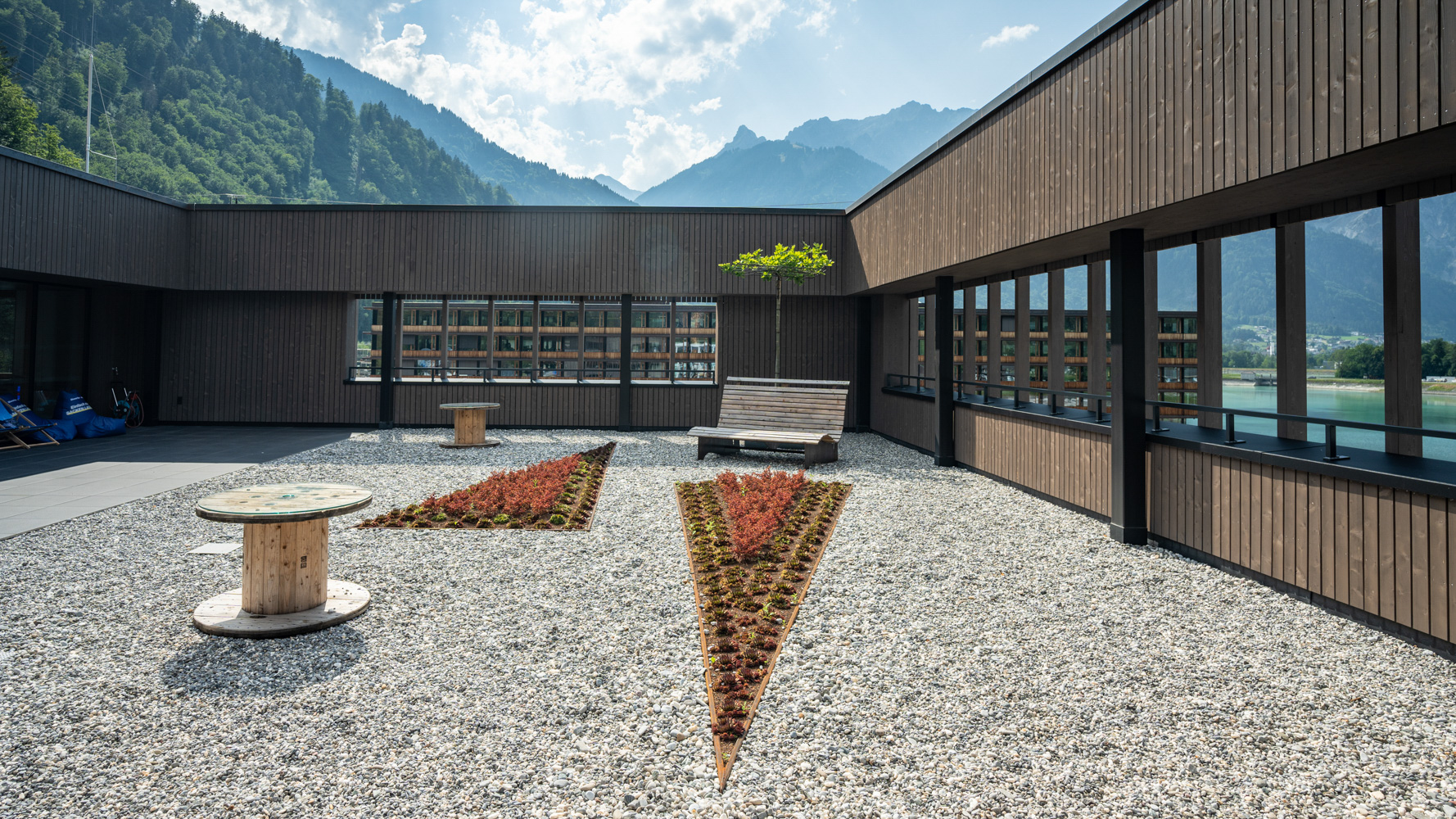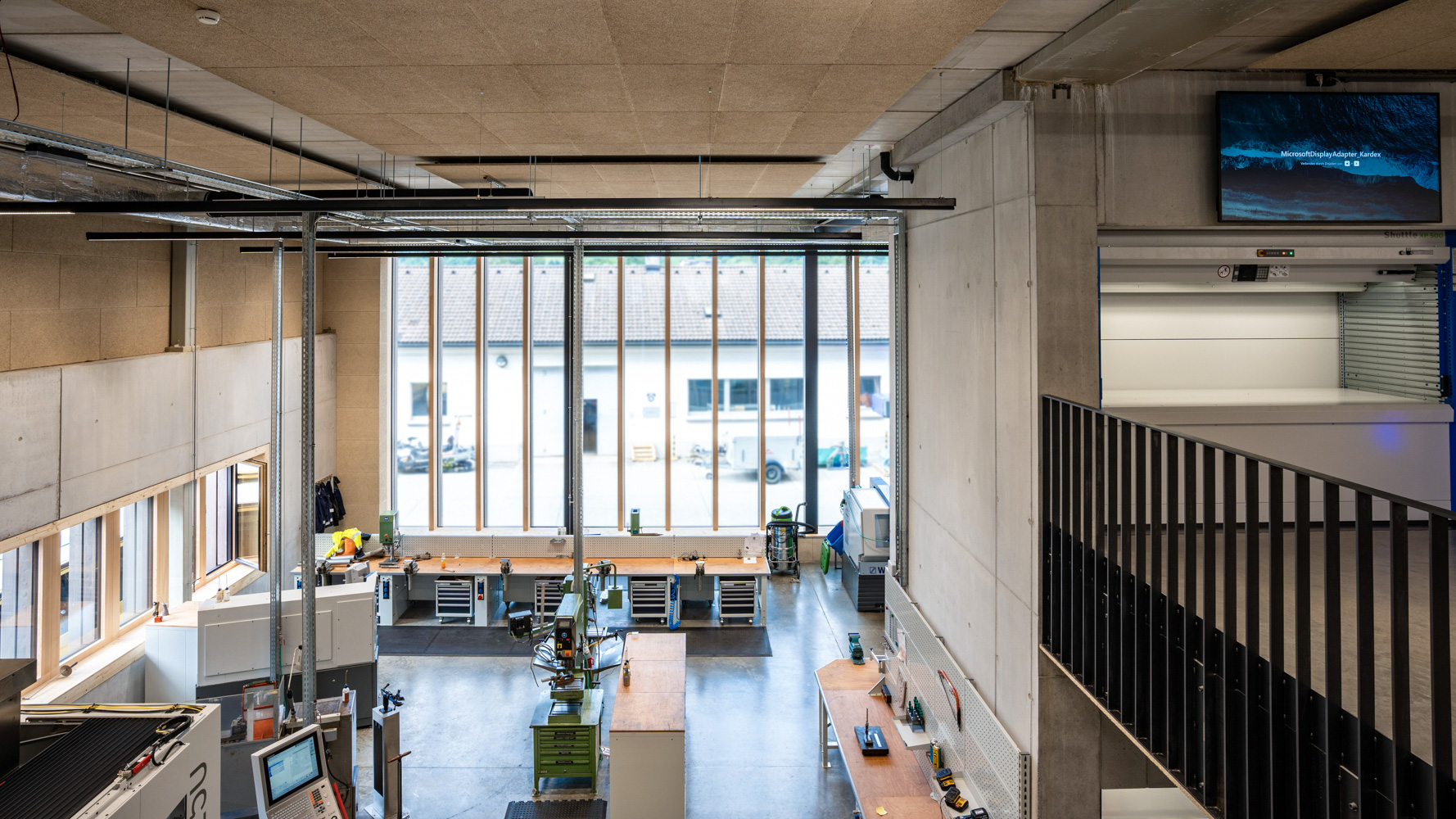 Auf dem massiven Untergeschoss mit Technik- und Servicezonen wurden vier Etagen in Stahl-Beton Verbundbauweise errichtet. In den zwei unteren Stockwerken befinden sich die Arbeitsräume des Ausbildungszweiges Metalltechnik. Ihr Herzstück bildet eine doppelgeschossige Maschinenhalle, welche sich großflächig nach Norden hin öffnet. Ausgedehnte Galeriebereiche schaffen Sichtverbindungen und Kommunikationsachsen. Darüber wurden die Schulungsräume der Fachgebiete Elektrotechnik, IT-Technik sowie der kaufmännischen Ausbildung angeordnet. Sie sind funktional gegliedert und übersichtlich organisiert. Im obersten Geschoss legen sich lichte Gemeinschaftsflächen um eine weitläufige Dachterrasse, die freie Blicke in die Berglandschaft erlaubt.