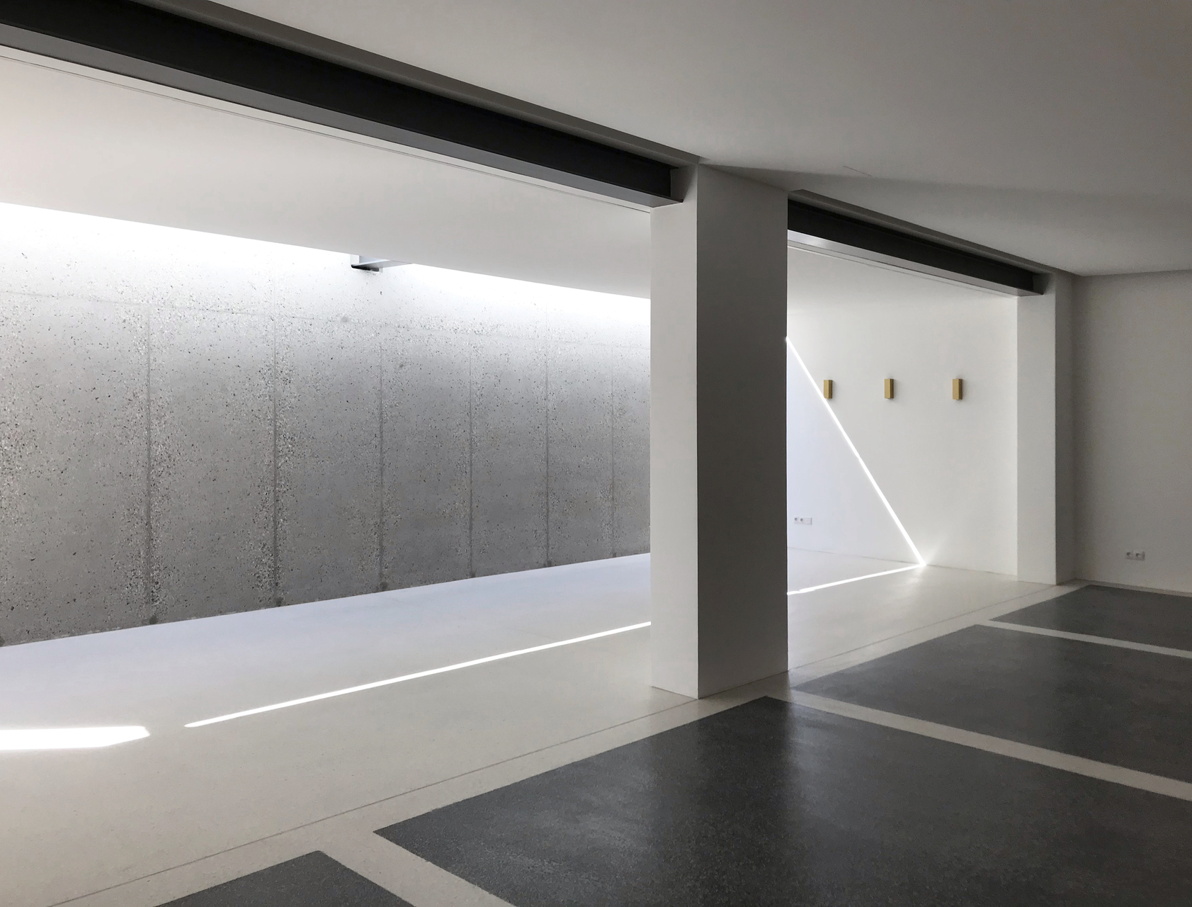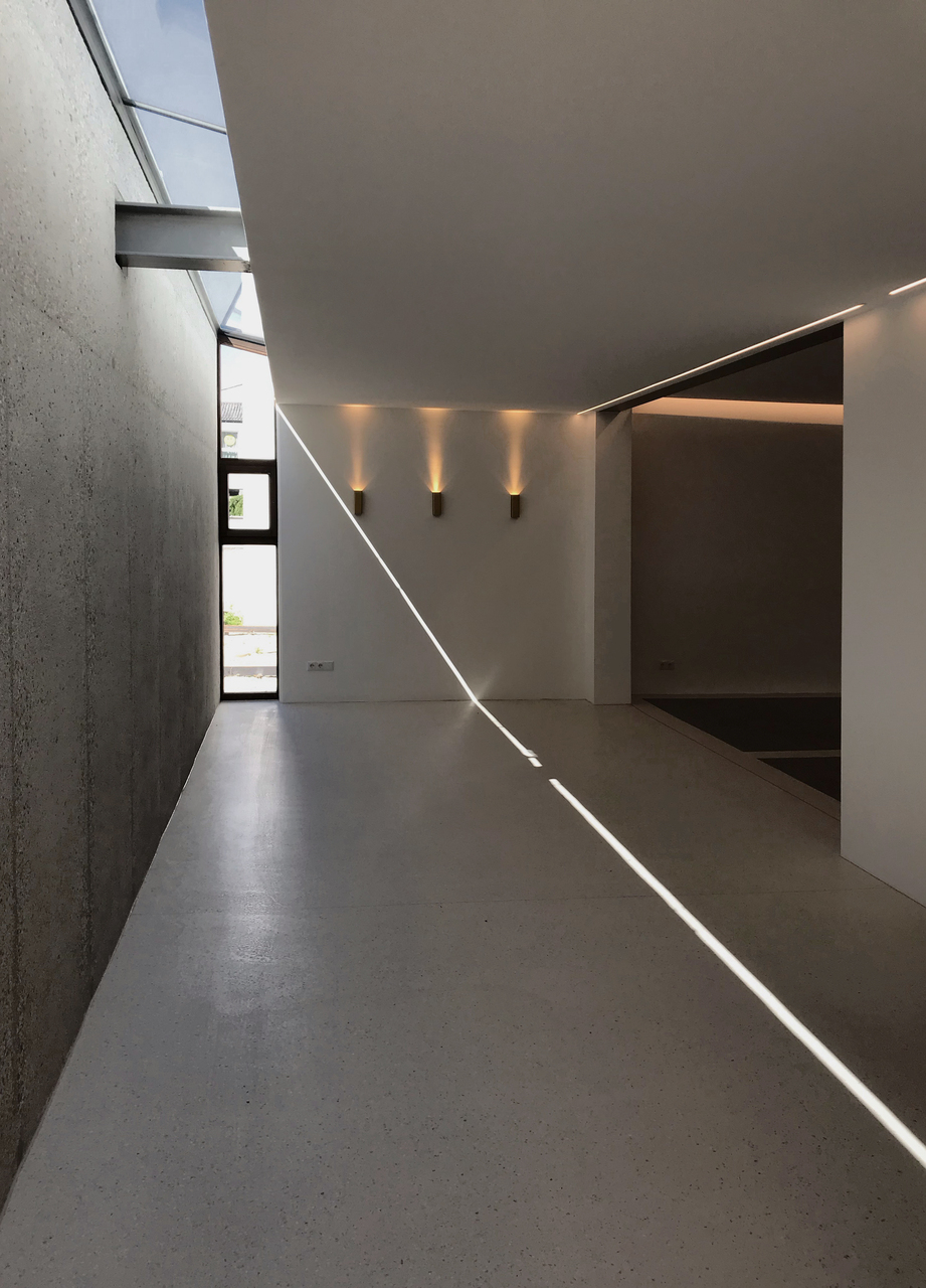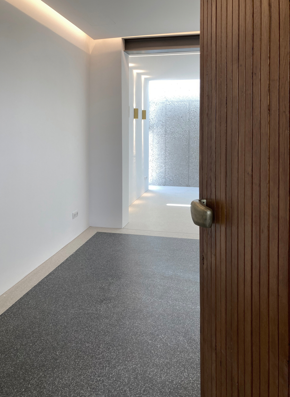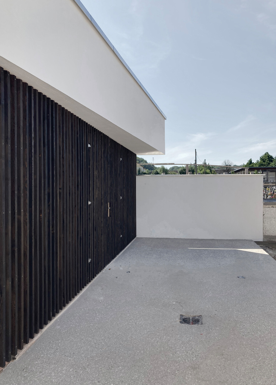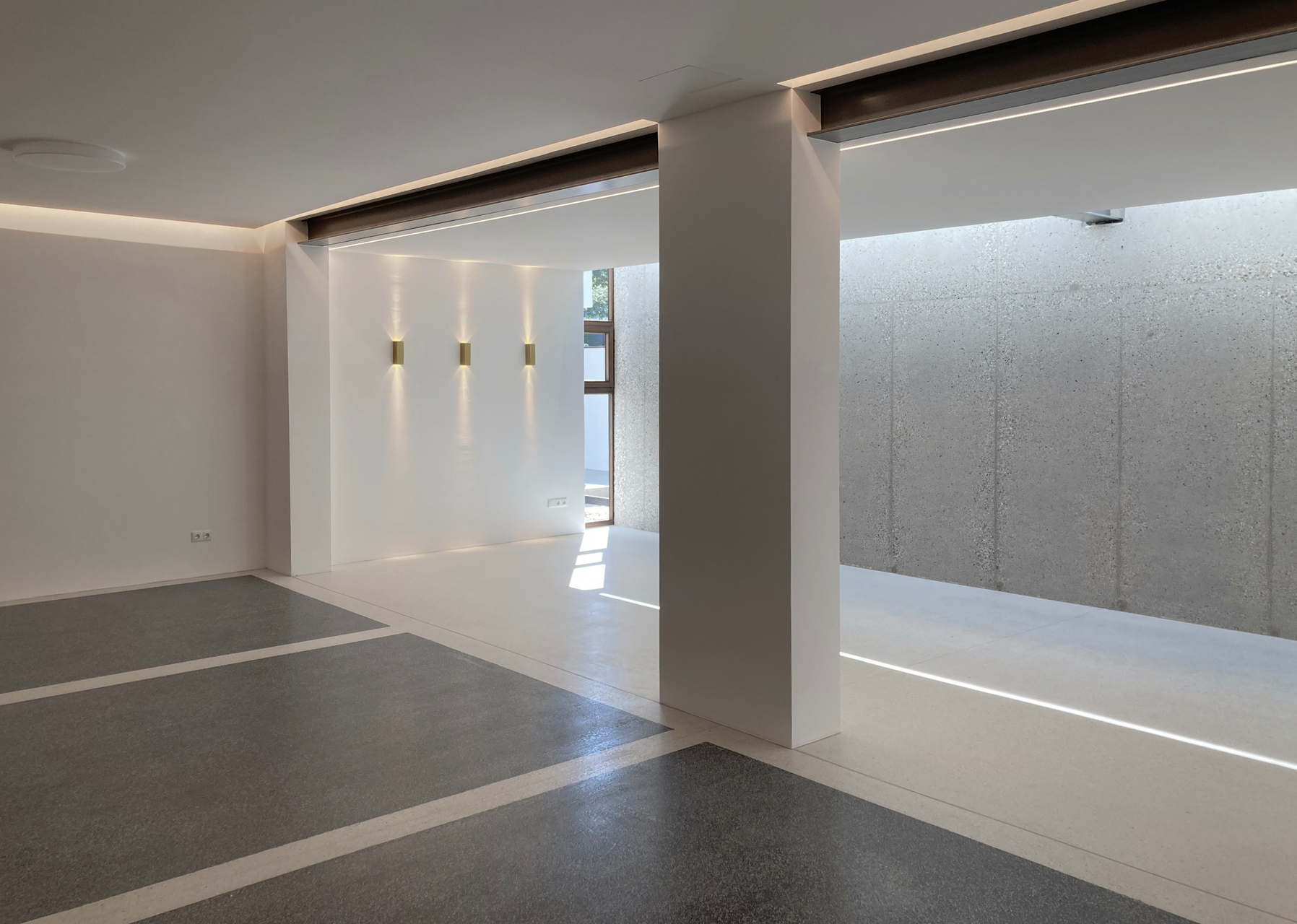 Der Betonkubus, der als Zubau mit Oberlichtverglasung in das Bestandsgebäude „gesteckt“ wurde, erweitert den Verabschiedungsbereich. Für die zwei neuen Aufbahrungskojen wurden die Trennwände der alten Kojen entfernt, die rückwärtige Außenwand wurde durchbrochen und unterfangen. In Abstimmung mit dem Bundesdenkmalamt wurde der neue Terrazzobelag analog zum entfernten Originalboden hergestellt. Die vormals kleinteilige Struktur der Kojen bleibt durch eingearbeitete Bodenfriese ablesbar. Neue Sanitäranlagen wurden integriert, der Sakristeibereich wurde um ein WC erweitert.
