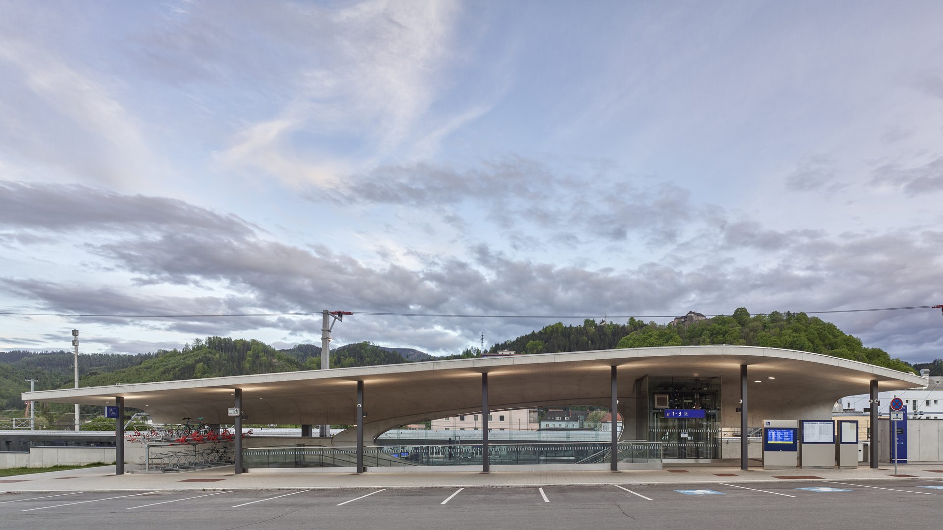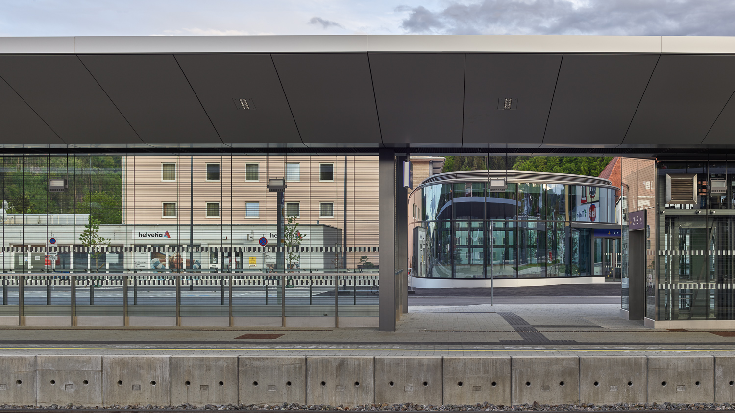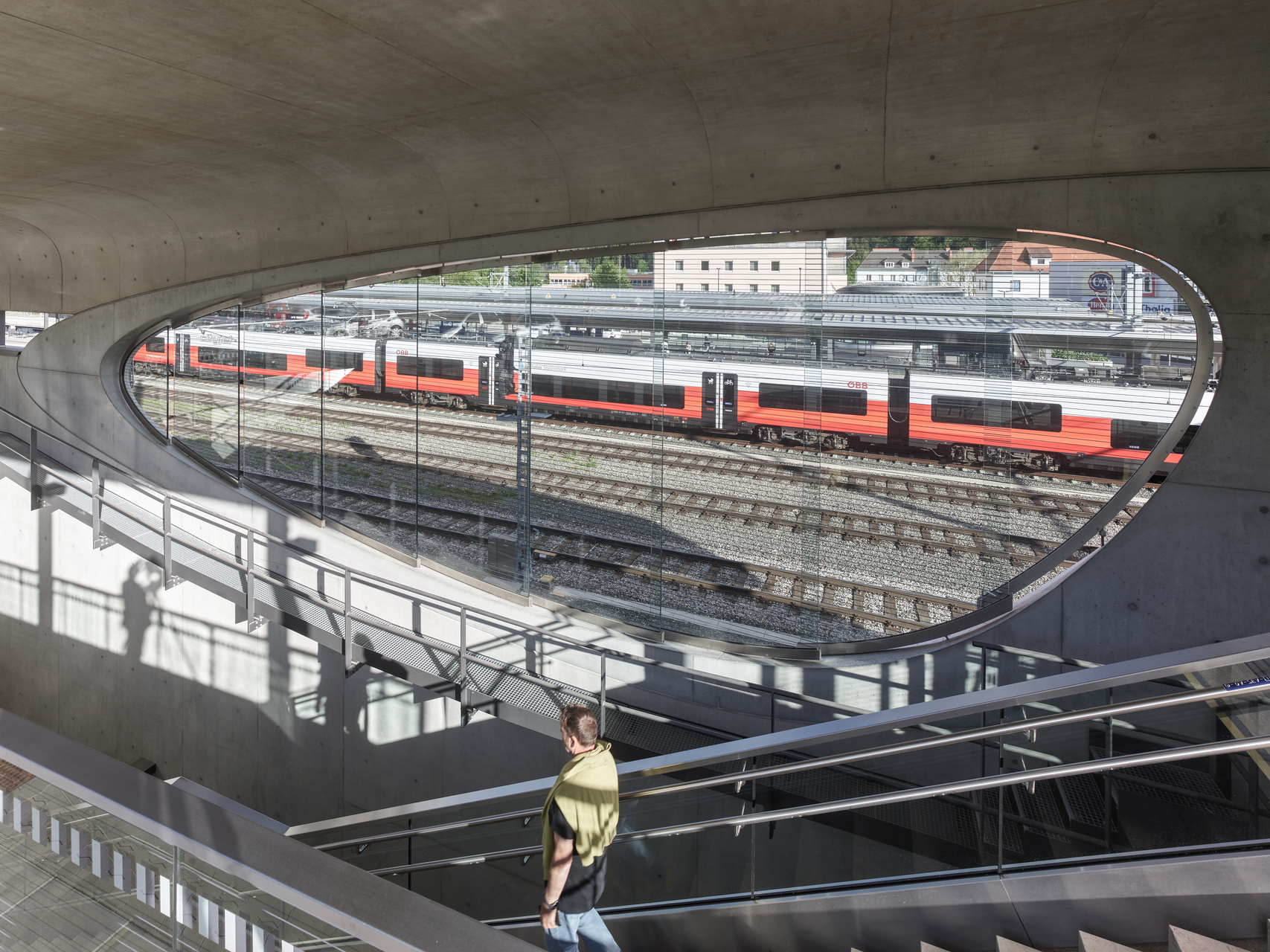 Entstanden ist eine räumliche Situation luftig fließender Innen- und Außenbegrenzungen, deren Plastizität durch den Kontrast von Beton und Glas verstärkt wird. Ein von Stützen getragenes Dach schwebt über dem aus Stahllamellen konstruierten, kugelsegmentischen Glaskörper, der den Innenraum des Aufnahmegebäudes nach außen öffnet. Die Dachoberseite spiegelt die doppelte Krümmung wider, während das Sonnenschutzglas je nach Tageszeit und Lichteinfall seine Durchlässigkeit wechselt und abends weite Ein- und Ausblicke schafft. Im Inneren verbindet ein geschwungener Aufgang die Zugangsebene mit der Galerie auf Gleisebene. Die Treppen in homogenem Sichtbeton verlaufen entlang der fließenden Gebäudekonturen.