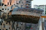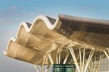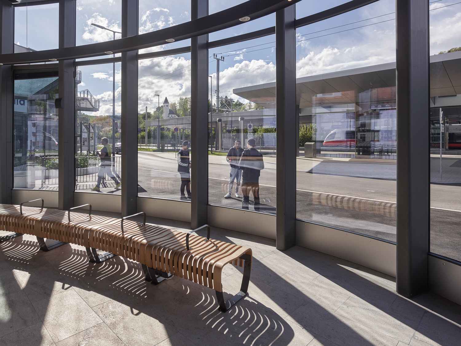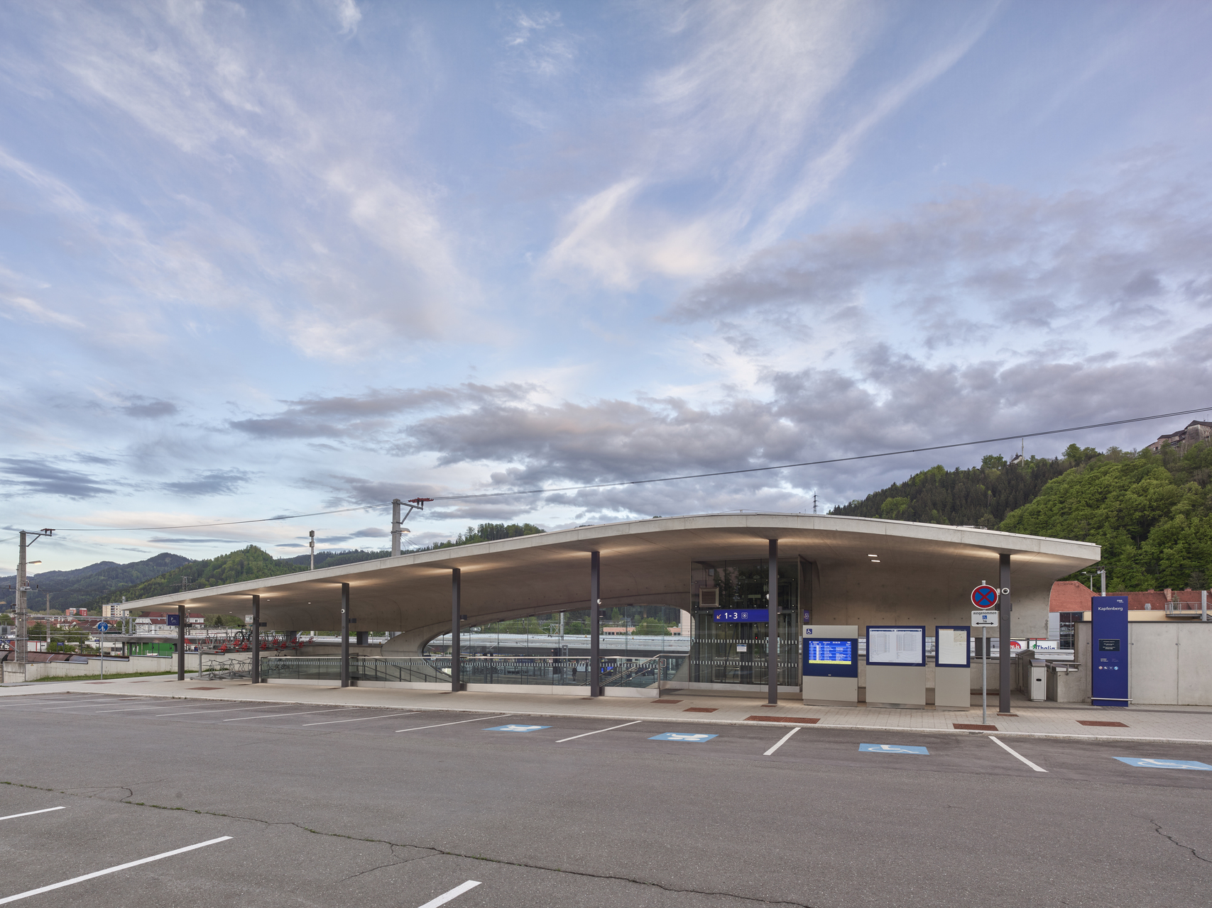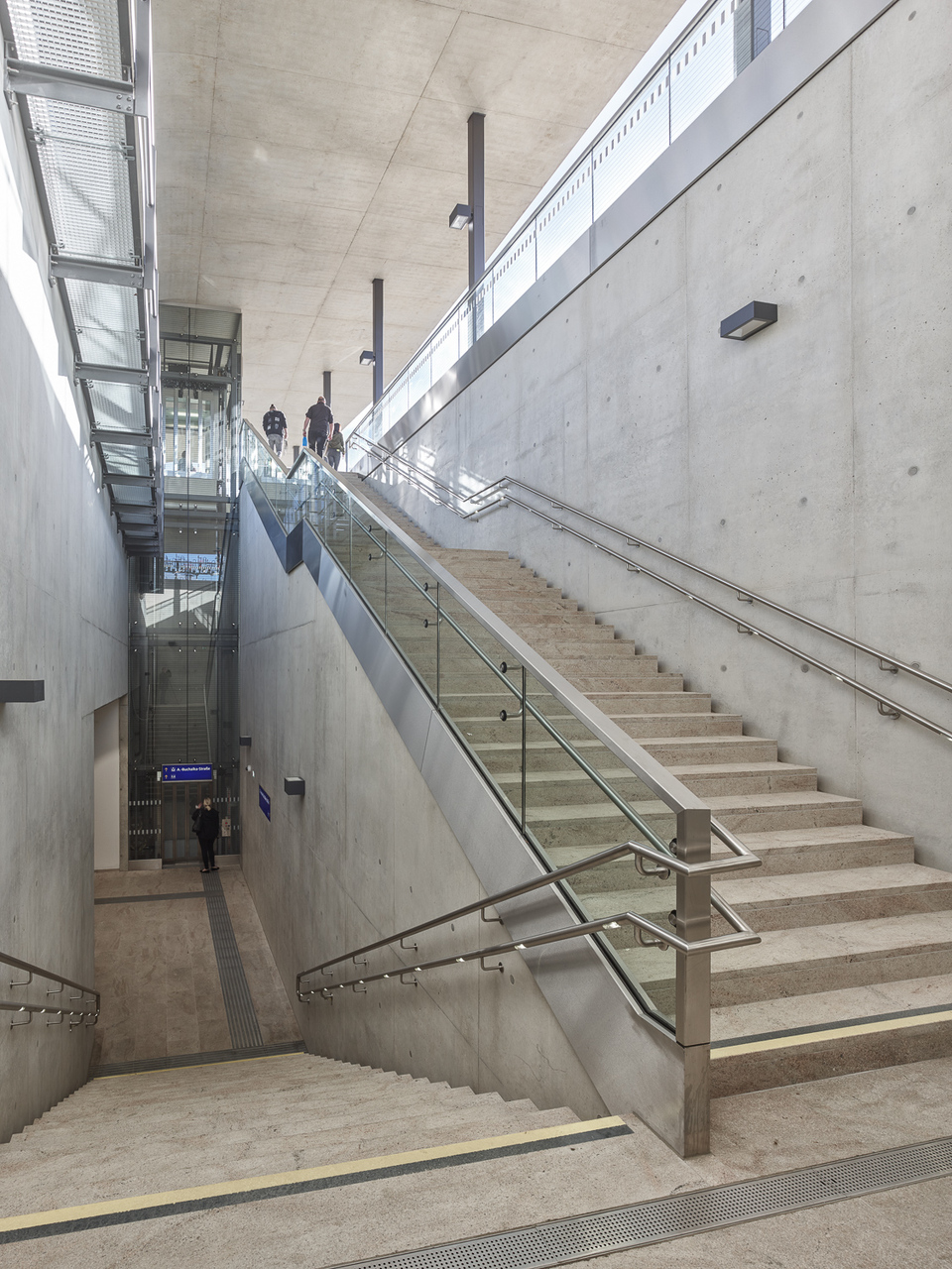 Entstanden ist eine räumliche Situation luftig fließender Innen- und Außenbegrenzungen, deren Plastizität durch den Kontrast von Beton und Glas verstärkt wird. Ein von Stützen getragenes Dach schwebt über dem aus Stahllamellen konstruierten, kugelsegmentischen Glaskörper, der den Innenraum des Aufnahmegebäudes nach außen öffnet. Die Dachoberseite spiegelt die doppelte Krümmung wider, während das Sonnenschutzglas je nach Tageszeit und Lichteinfall seine Durchlässigkeit wechselt und abends weite Ein- und Ausblicke schafft. Im Inneren verbindet ein geschwungener Aufgang die Zugangsebene mit der Galerie auf Gleisebene. Die Treppen in homogenem Sichtbeton verlaufen entlang der fließenden Gebäudekonturen.