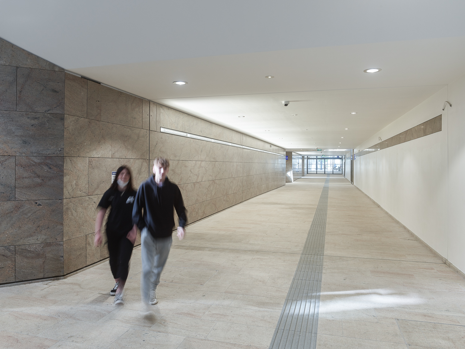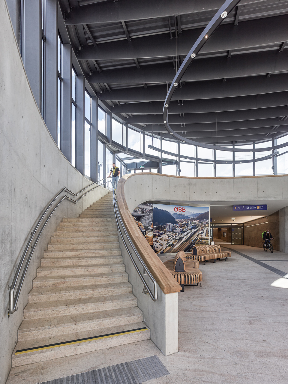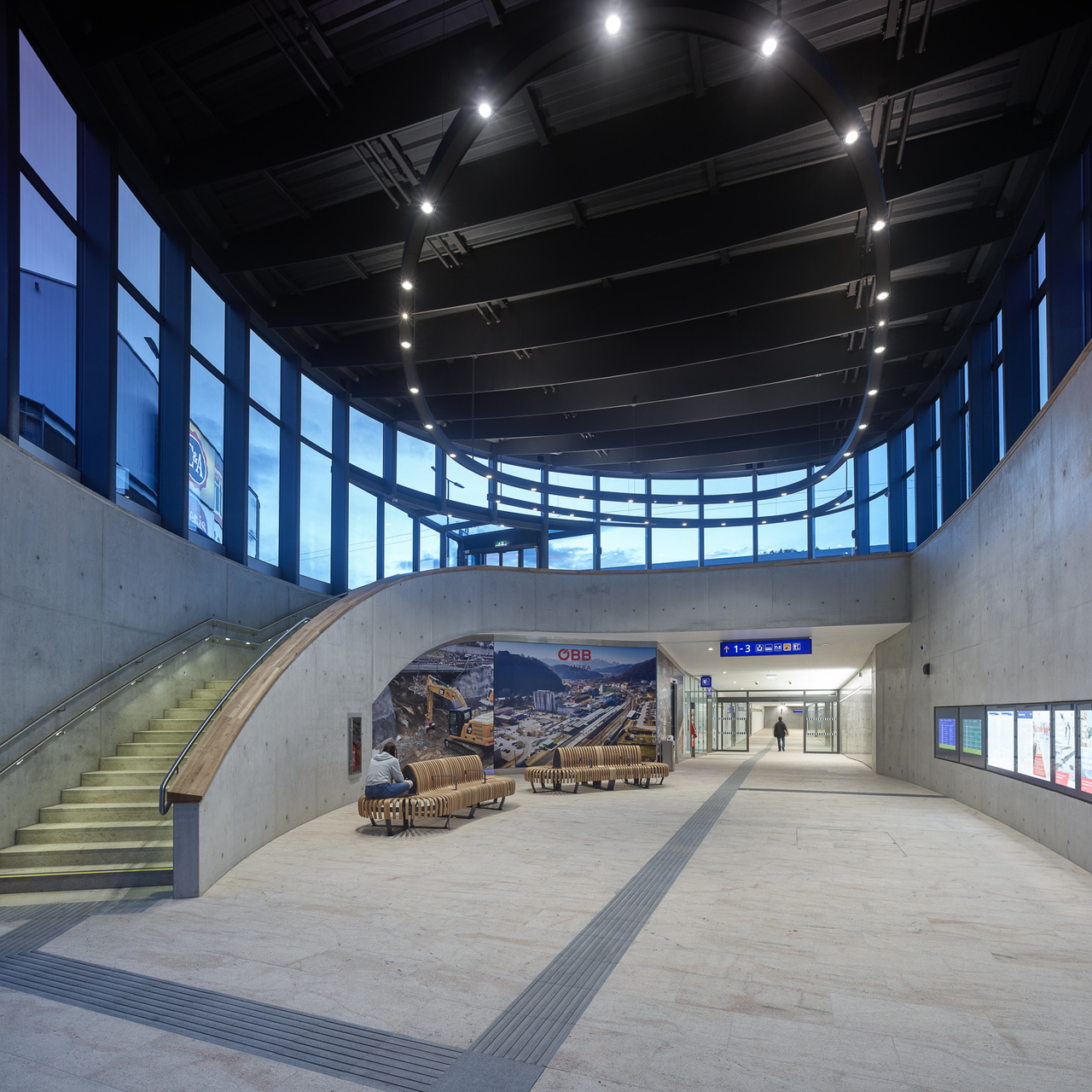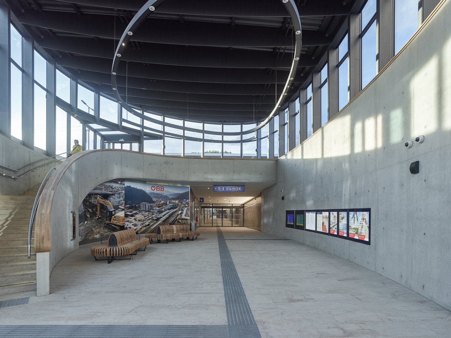 Im Erdgeschoss lädt der offene Raum zum Verweilen und als Treffpunkt ein. Im Galerieraum darüber schwebt ein „Lichtring“, welcher die räumlichen Dimensionen dieses Ortes akzentuiert und vergrößert. Die stadtteilverbindende Unterführung ermöglicht von hier aus, direkten Zugang zu den Bahnsteigen und dem Zugang Nord zur „Hochschwabsiedlung“.