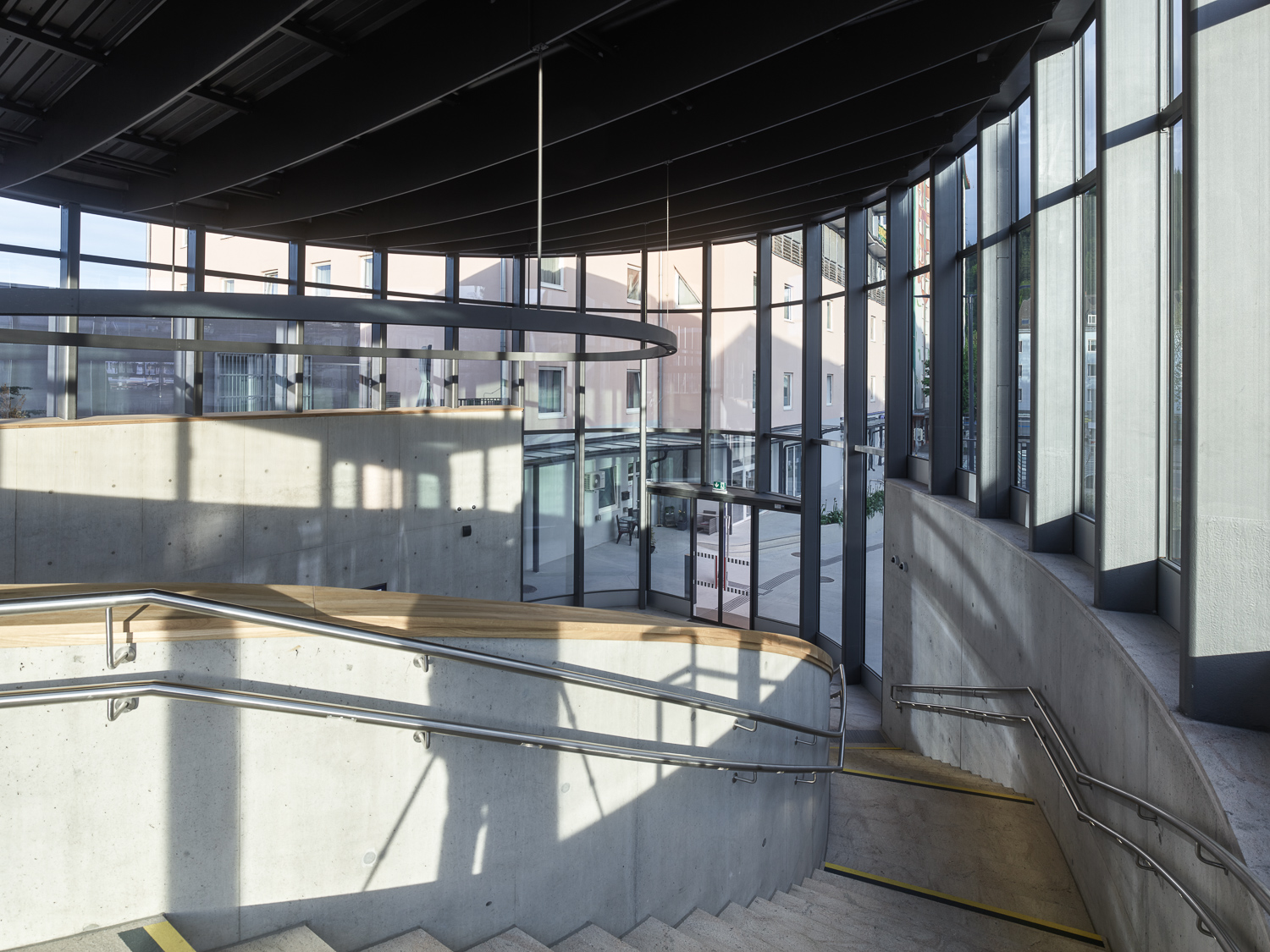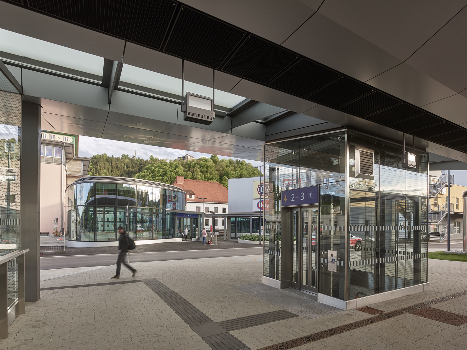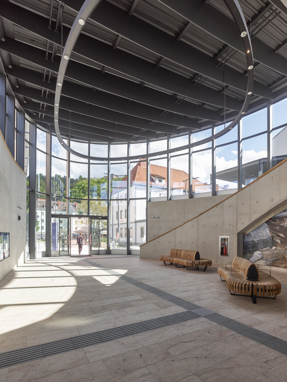 Vom Hauptplatz kommend, gelangt man über den Vorplatz zum neuen Aufnahmegebäude und Hauptzugangsbereich. Der freistehende Baukörper ist im engen Zwischenraum dicht gereihter Bestandsgebäude im Zentrum der Stadt positioniert. Integration und Lesbarkeit waren richtungsweisende Planungsparameter.