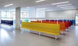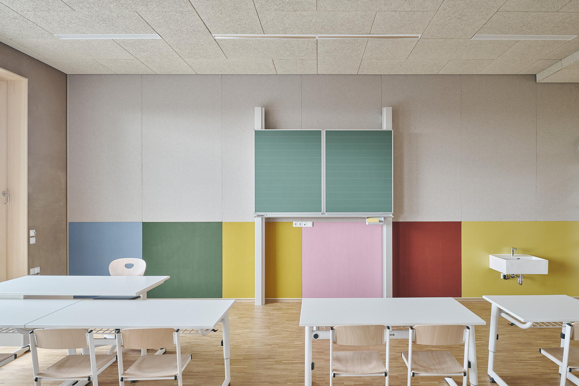 Die Klassen selbst halten sich in ihrer Materialität zurück. Lehmverputzte Wände treffen auf große Fensterfronten und Stoffpinnwände, ein buntes Band aus Pinnwandtafeln verleiht Farbigkeit.