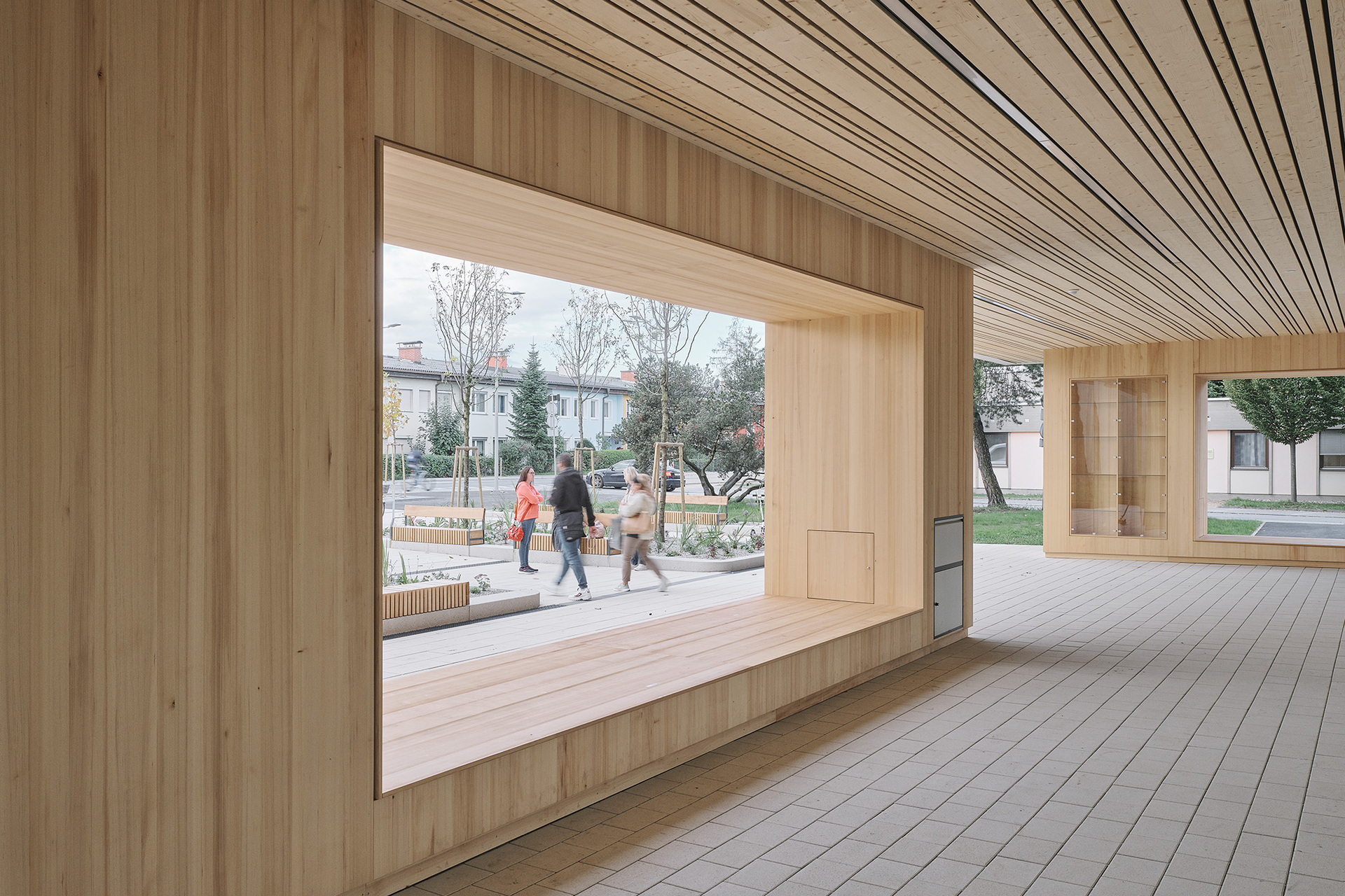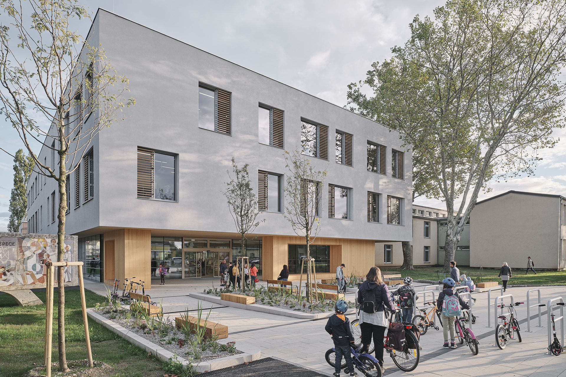 Um einen einladenden Eingangsbereich zu schaffen und durch ein kompaktes Gebäude mehr Platz für einen großen Schulgarten zu erlangen, wurde der Bestandsbau durch einen dreigeschossigen Neubau ersetzt. So entstand ein zeitgemäßer kooperativer Bildungscampus mit viel Raum für Bildung, Bewegung und Freizeit. Den Ankunftsbereich an der Ecke Gradnerstraße/Nippelgasse bauten die Architekt:innen zu einem repräsentativen Vorplatz aus, um der gemeinsamen Schuladresse von Volksschule und zukünftiger Neuer Mittelschule ein Gesicht zu geben. Die Auskragung in Ziegelbauweise benötigte Stützen, die mit Holz verkleidet und mit überdachten Sitznischen ausgestattet wurden.