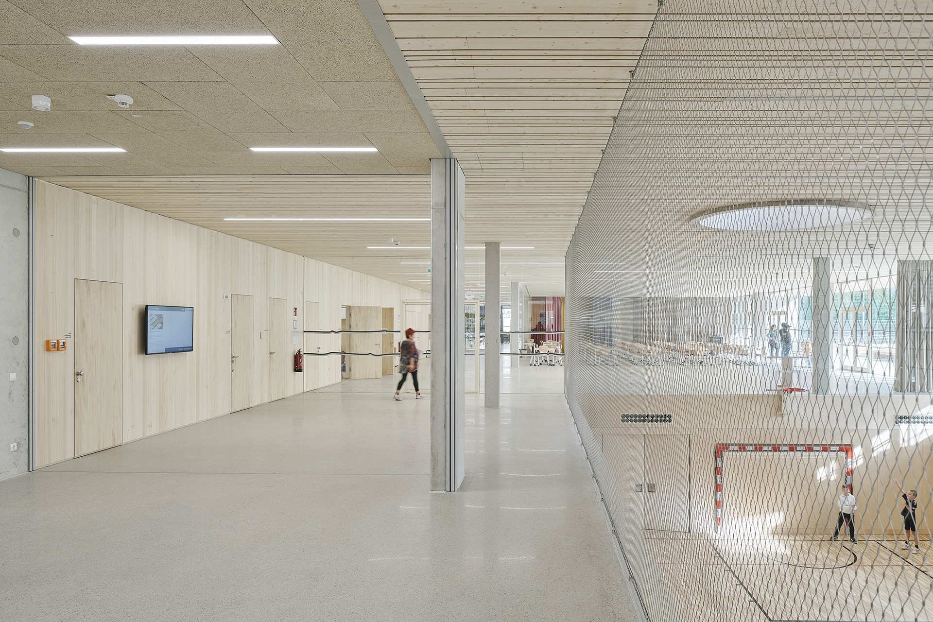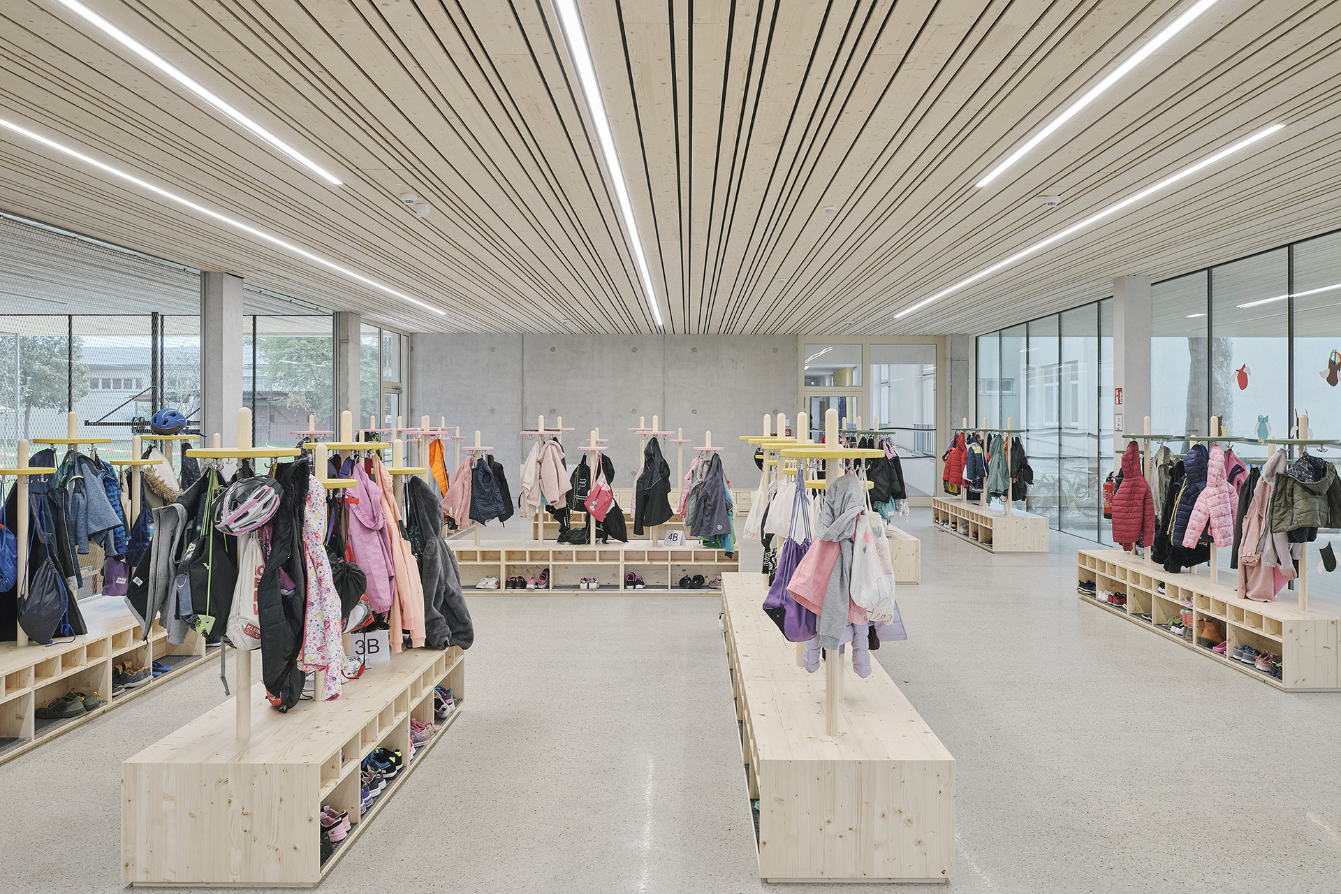 Vom Vorplatz kommend gelangen die Schüler:innen in die offene Zentralgarderobe, einem zweigeschossigen Raum, von dem man bis ans hintere Ende des Gebäudes sieht. Anschließend öffnet sich ein großzügiger Raumverbund aus Aula und Speisesaal, der wiederum an den Schulhof anknüpft. Aula und Speisesaal sind nur durch einen mobilen Vorhang voneinander getrennt – bei Veranstaltungen kann auf diese Weise eine große, offene Halle mit Bühnensituationen entstehen. Auch der Turnsaal mit Fensterfronten ins Grüne ist in dieses Gefüge eingebettet, wobei die Kinder beim Turnen ins Grüne sehen und ein Oberlicht für zusätzliches Tageslicht sorgt.