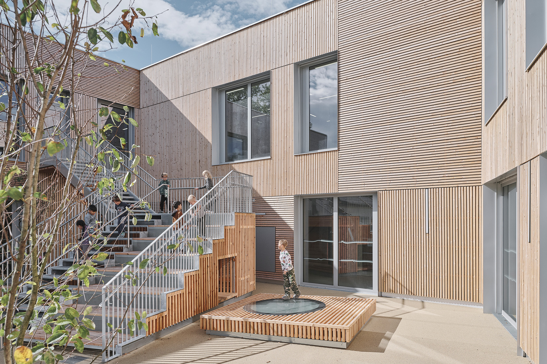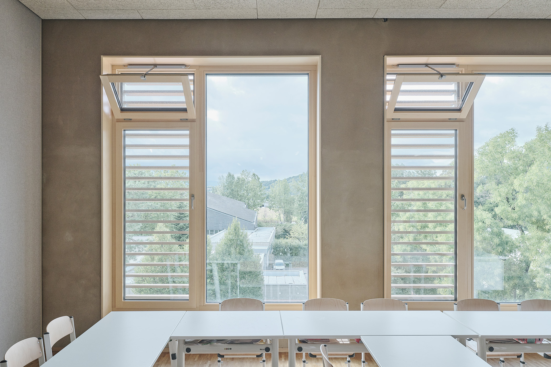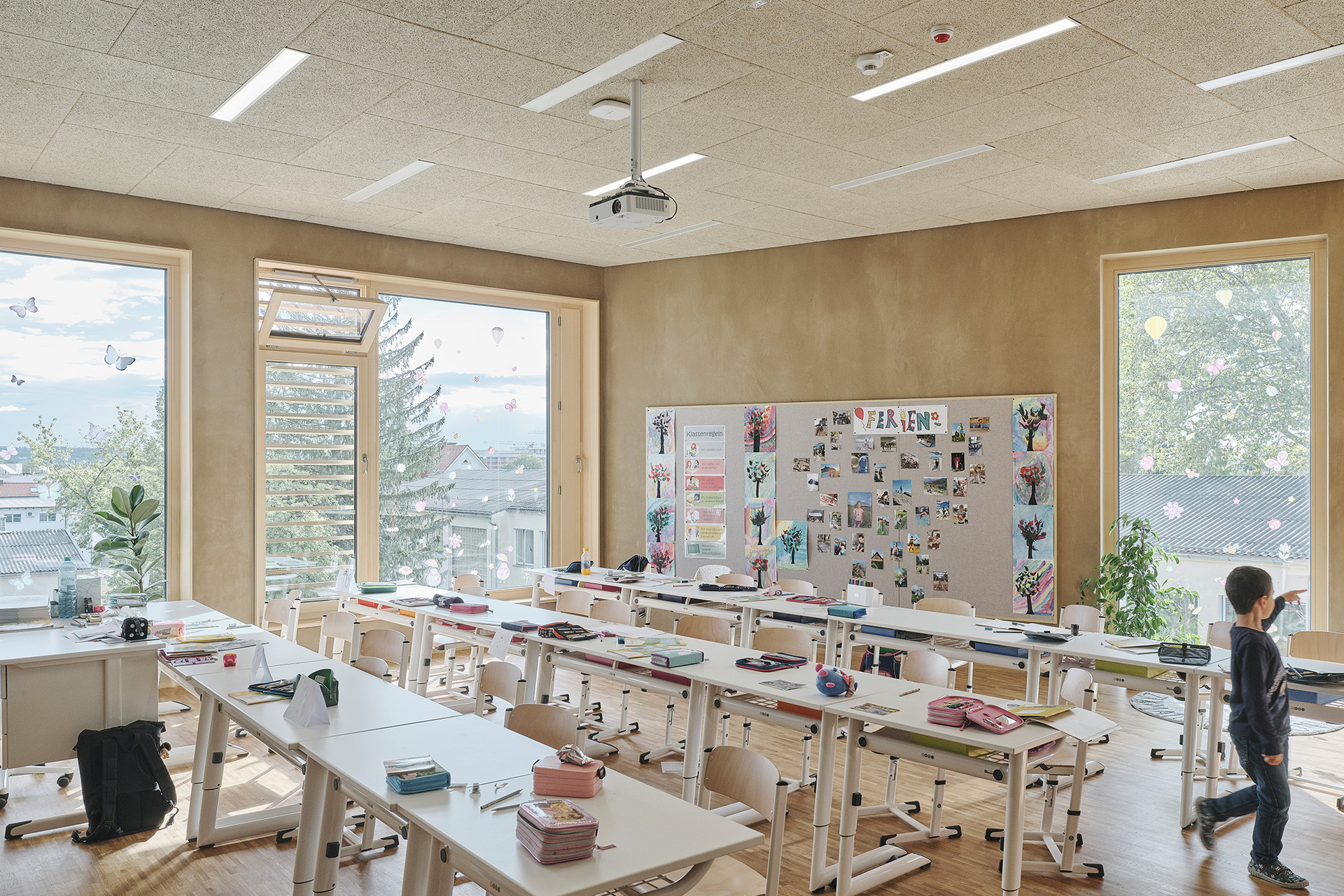 Mit einem Heiz- und Kühlsystem über Tiefbrunnen und einer Fotovoltaikanlage wird erneuerbare Energie ohne Verbrennungsprozesse gewonnen. Die automatisierte Fensterspaltlüftung, Grüninseln und zusätzliche Bäume wirken gegen Überhitzung und helfen, Wasser zurückzuhalten. Zusätzlich wird mit Baustoffen aus erneuerbaren Rohstoffen graue Energie gespart und Schad- und Störstoffe vermieden. Materialien wie Lehm und Holz sorgen für gutes Raumklima und letztendlich eine einfache Entsorgung. Unter dem Estrich kamen lehmummantelte Holzspäne sowie Holzweichfaserplatten zum Einsatz. Der Einsatz von Bauprodukten mit geringer Herstellungsenergie, guter Auswirkung auf die Raumluftqualität und hervorragendem Entsorgungspotenzial verbessert die CO2-Bilanz des Gebäudes. Eine durch und durch nachhaltige Konstruktion, die vielen Generationen an Kindern Freude beim Lernen bereiten wird. (Text: Architekt:innen)