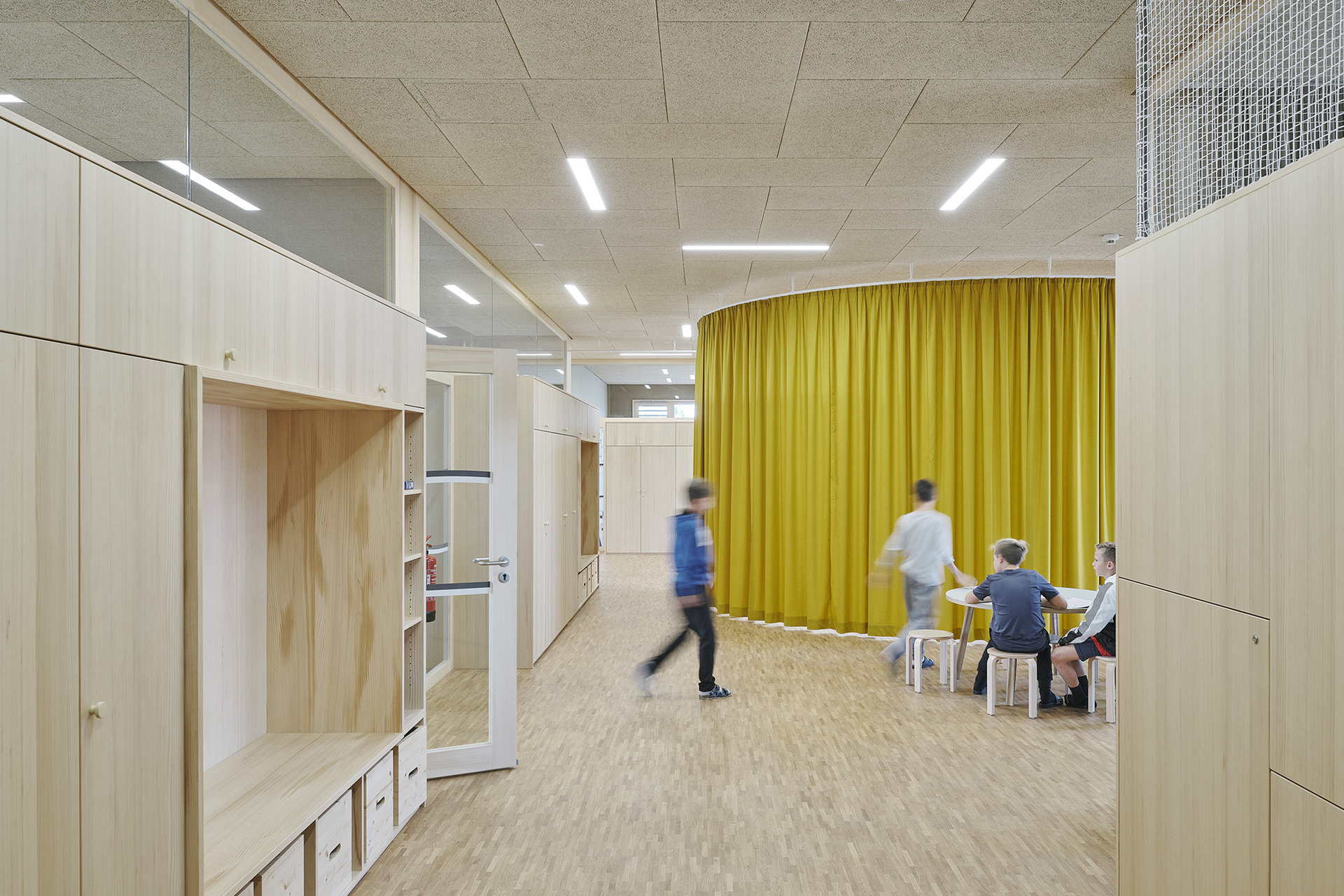 Nach dem regulären Unterricht können die Schüler:innen in die Ganztagesschule wechseln, die aus Räumen zum Werken, Musizieren, Bewegen und für weitere Freizeitbeschäftigungen bestehen. Um zusätzliche Möglichkeiten zum Spielen, für Rückzug, aber auch für Stauraum zu gewinnen, wird die Mitte der Ganztagesschule mit Holzboxen bespielt. Hier finden sich etwa die Bücherregale oder Rückzugsnischen mit Vorhängen, ein Tunnel oder eine Burg.