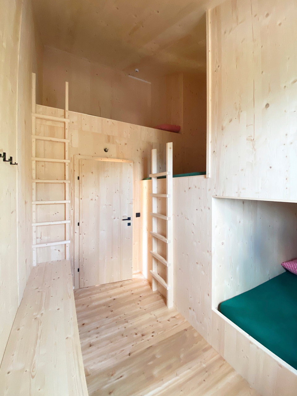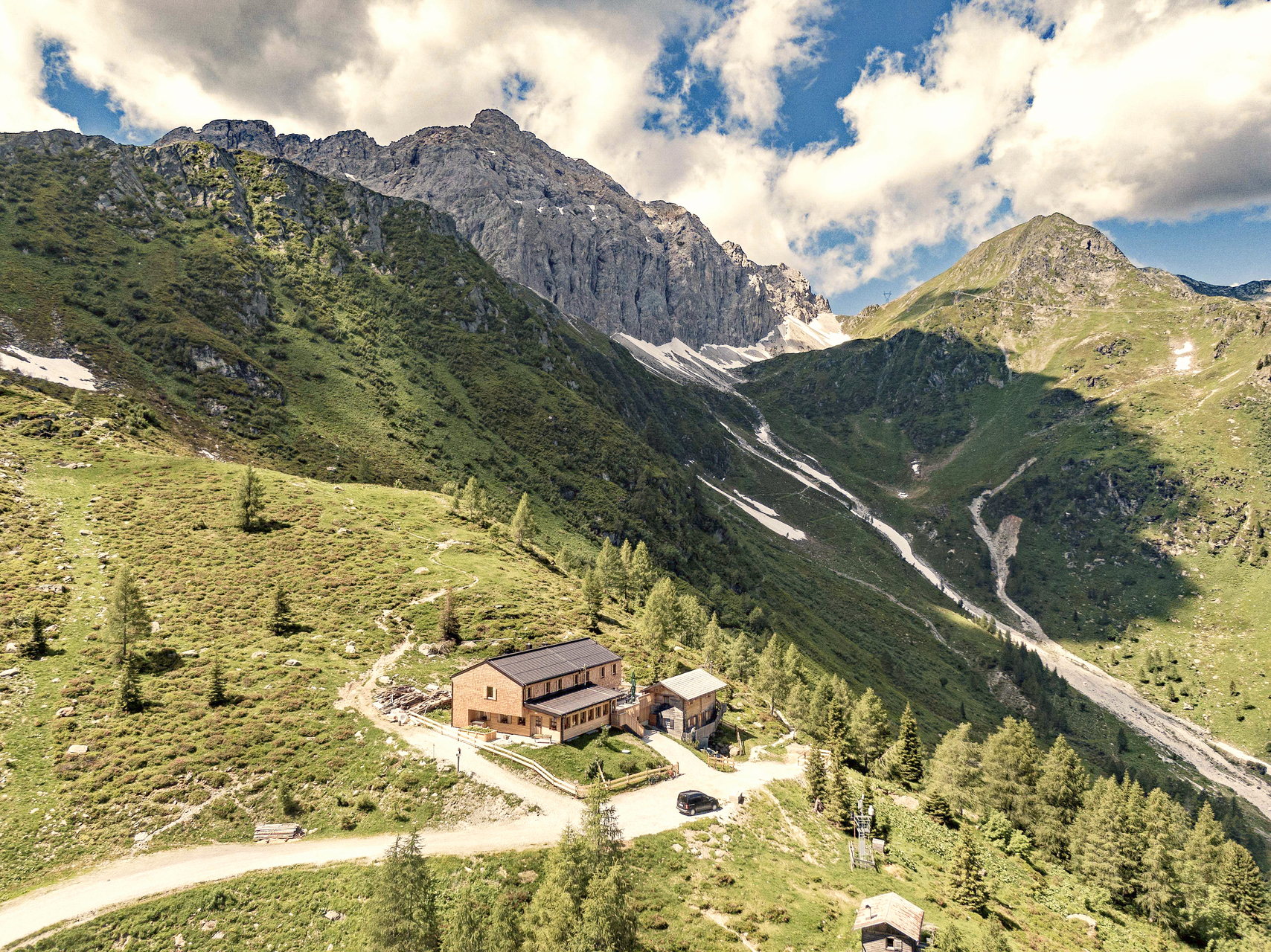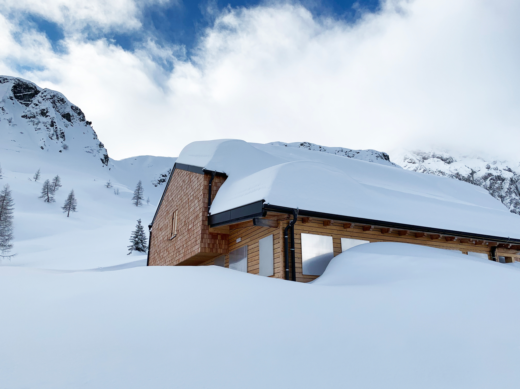 Entsprechend den Anforderungen an eine Schutzhütte wurde mit so wenig Aufwand wie nötig und mit Materialien aus der Region ein funktionaler, nachhaltiger Zweckbau realisiert. In nur 7 Wochen Bauzeit wurde ein reiner Holzbau mit einer Konstruktion in Brettsperrholzbauweise umgesetzt, wodurch die Hütte auch den ortsüblichen Schneelasten standhält. Fassaden und Dach wurden mit Lärchenschindeln verkleidet, Lärchenfenster und Lärchendielenböden runden das Gesamtbild ab. Um den Übernachtungsgästen auf kleinsten Raum ein Höchstmaß an Komfort zu bieten wurde für die Schlafbereiche ein neues Raumkonzept entwickelt, eine in sich verschränkte raumbildende Brettsperrholzkonstruktion, die gleich viel Platz wie ein Stockbettenlager benötigt, jedoch in intimen Zweierkojen wesentlich mehr Privatsphäre bietet. (Text: Architekt:innen, bearbeitet)