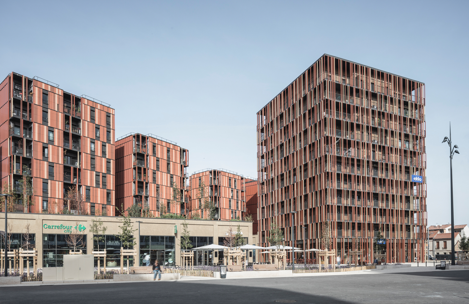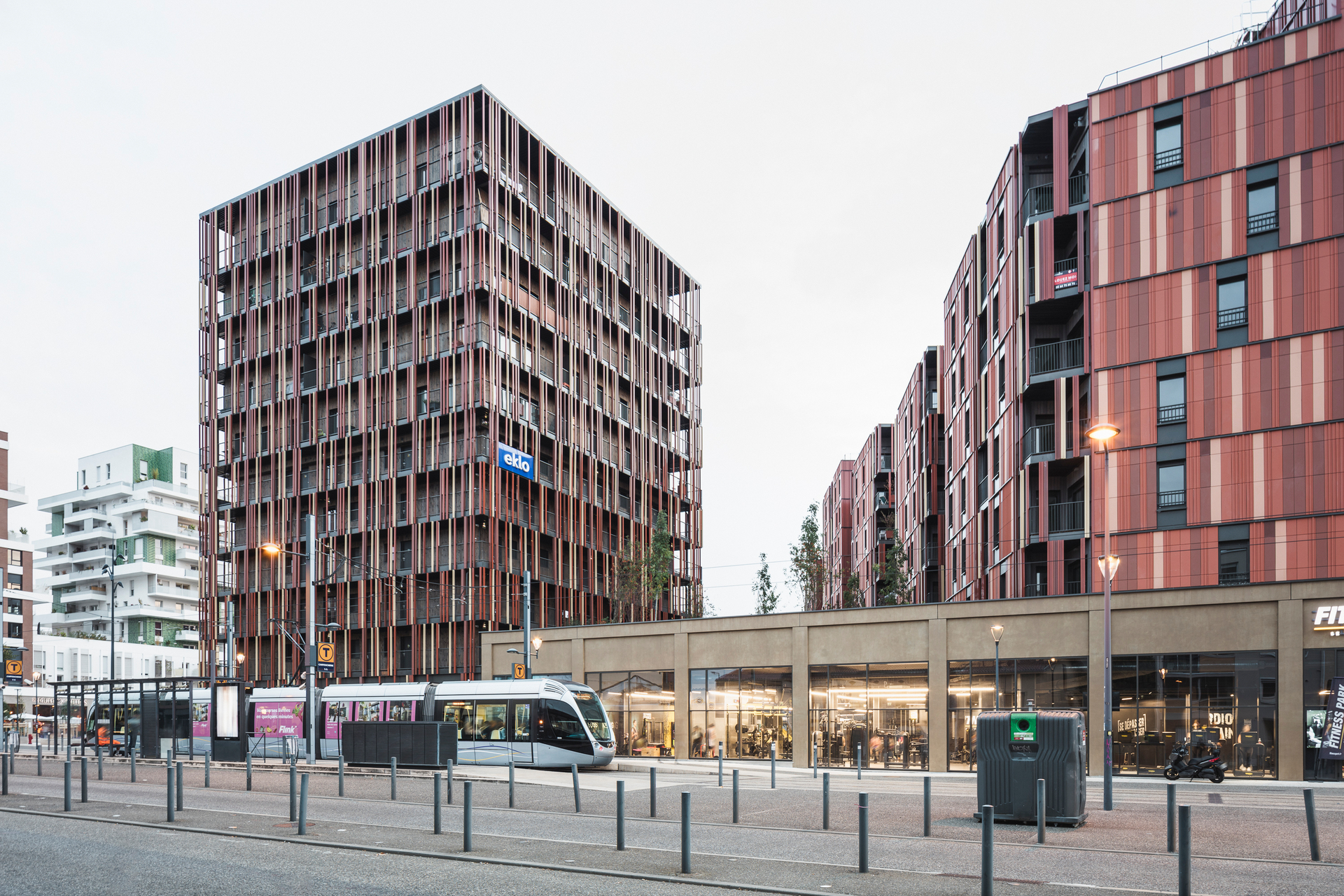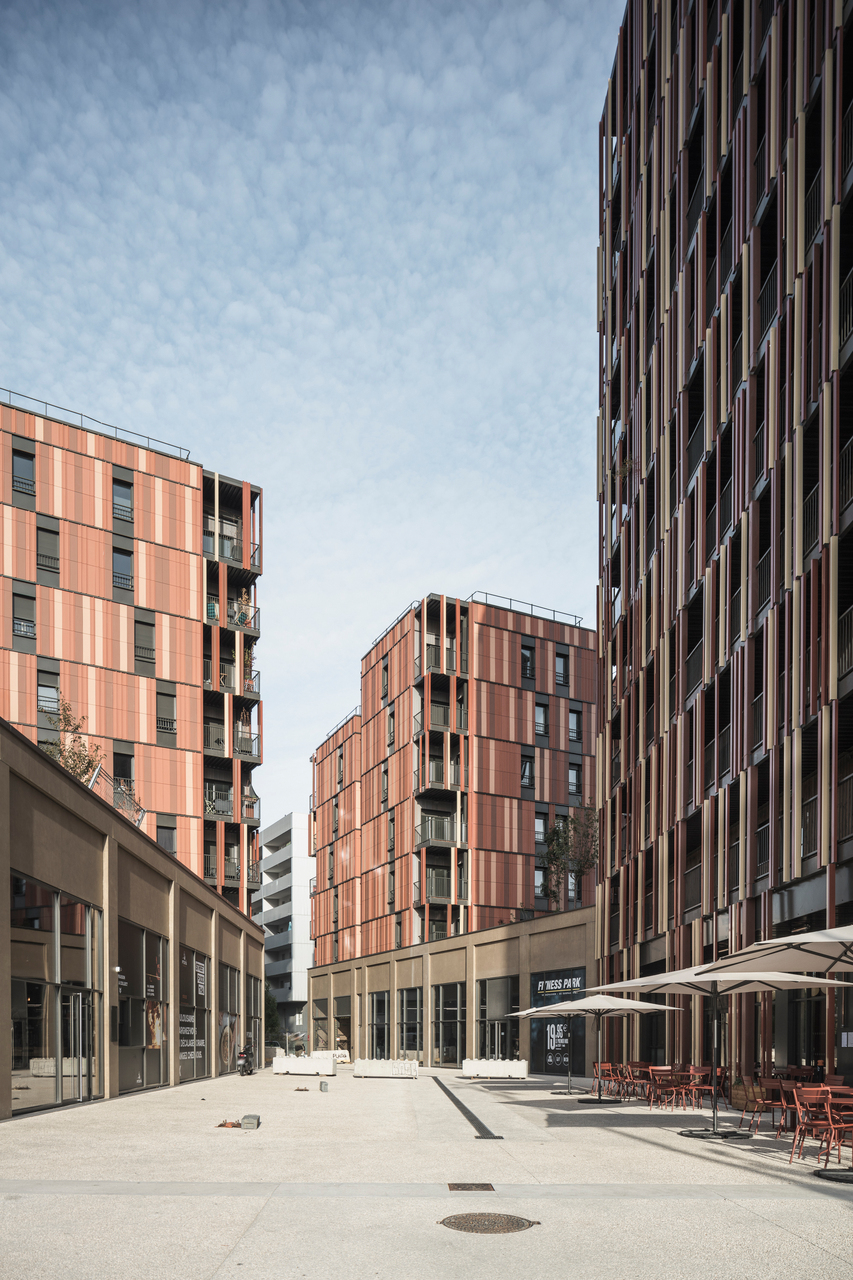 Terrakotta-Tafeln, die an die lokale Farbtradition der „ville rose“ anknüpfen, bilden eine zweite Fassadenhaut entlang der Wege und Passagen des Turms und vor den Loggien der Wohnungen und bilden einen markanten Bezugspunkt für das Viertel. Die Vielfalt der öffentlichen Räume, die Durchlässigkeit der Blöcke und die soziale und funktionale Mischung der Gebäude bieten die Grundlage für eine lebendige Umgebung.