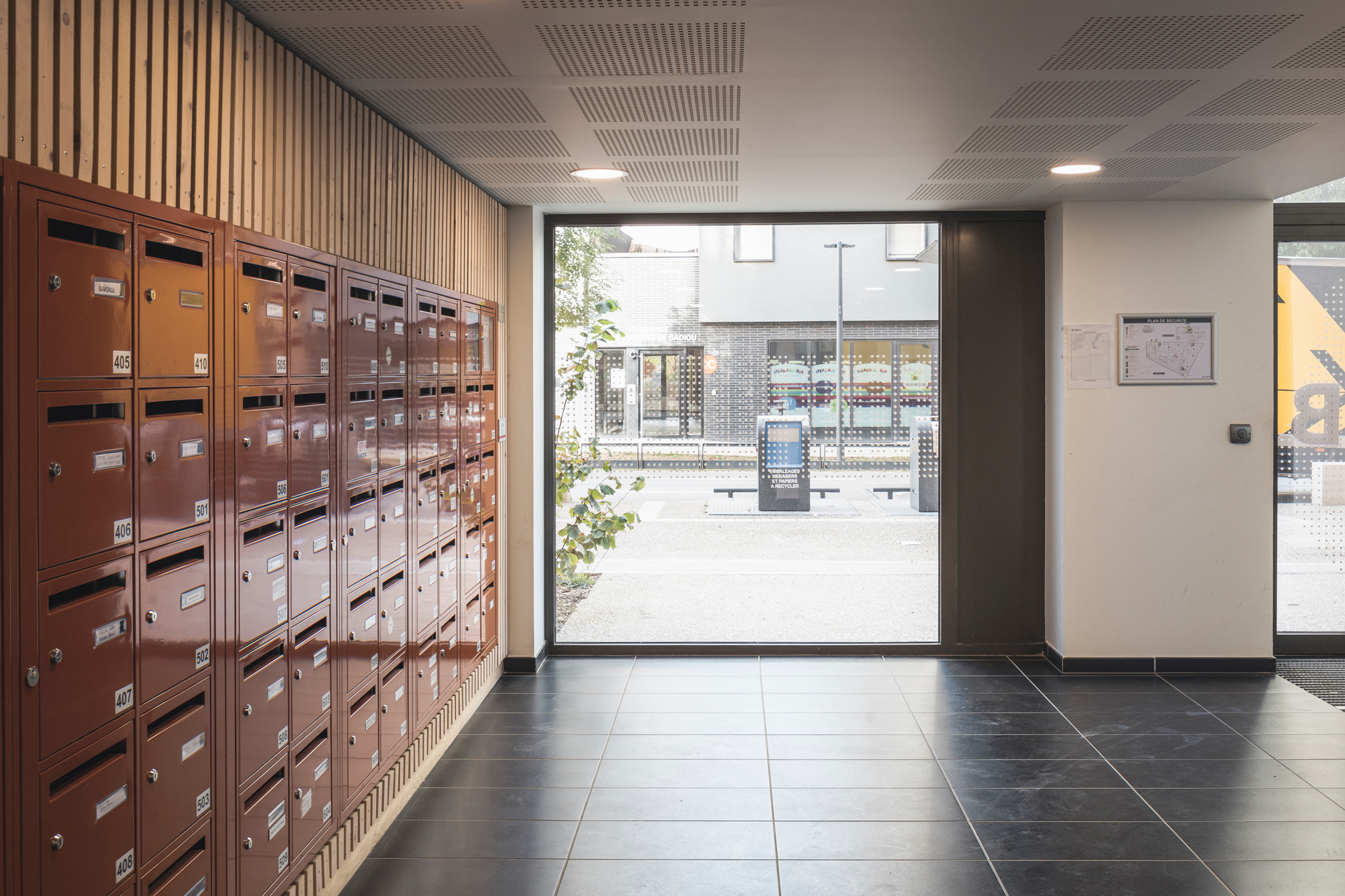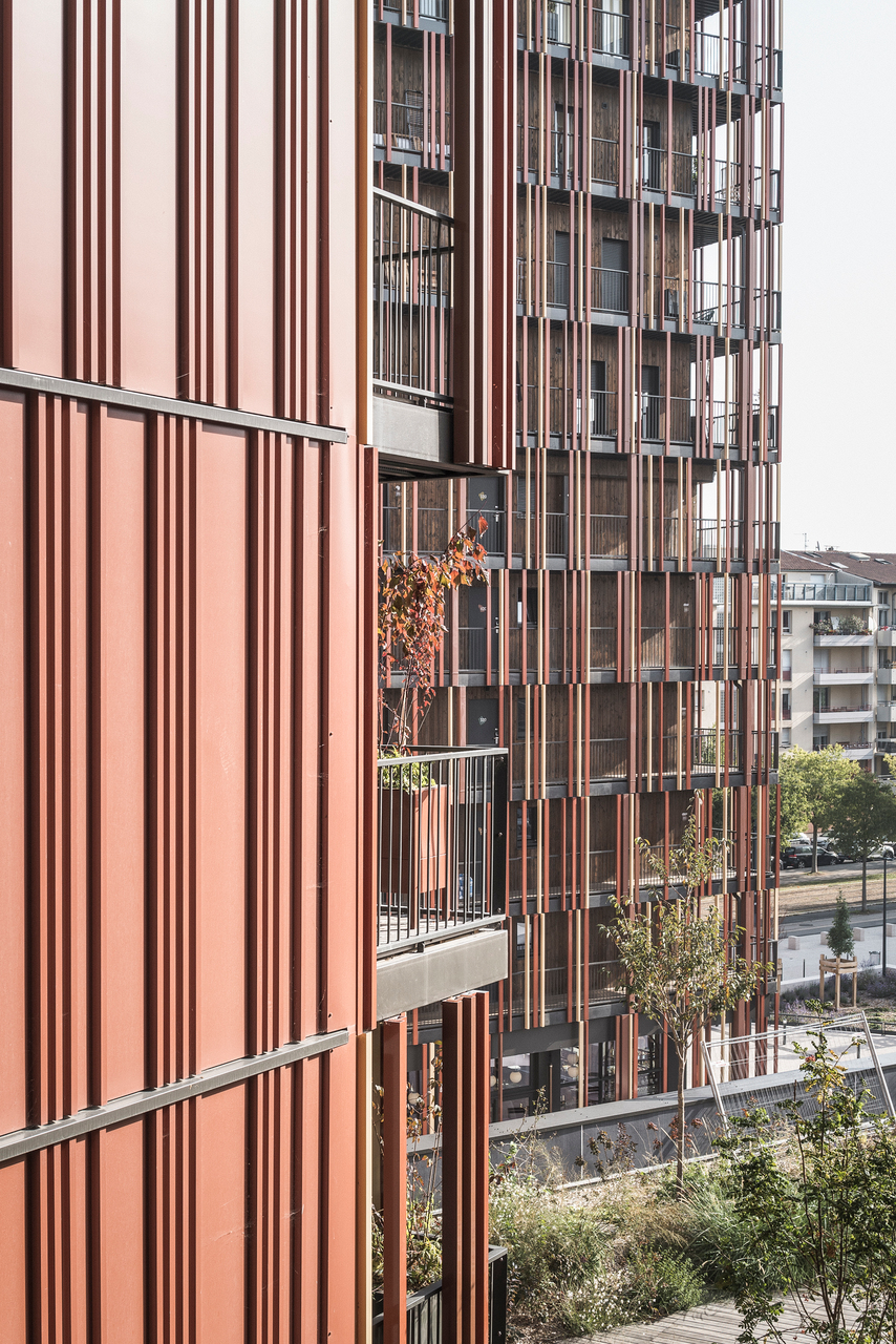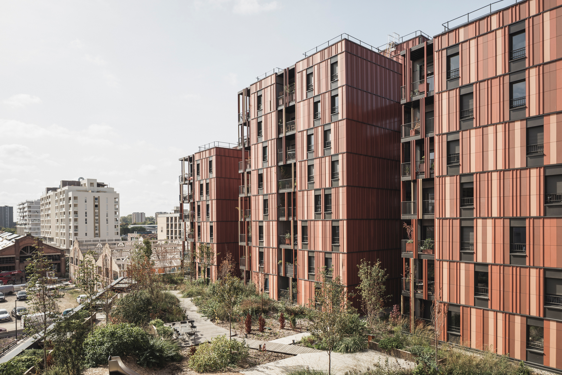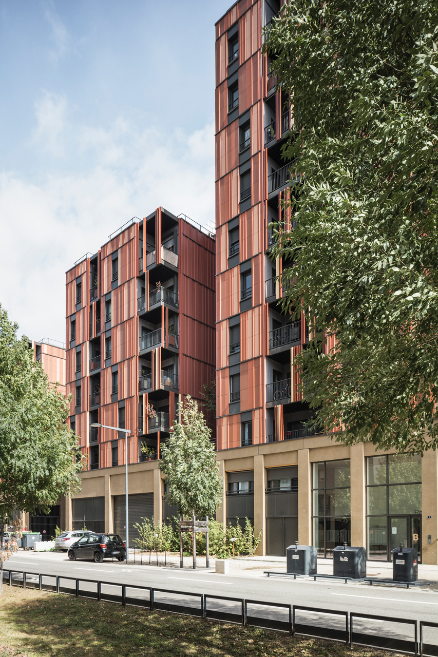 Terrakotta-Tafeln, die an die lokale Farbtradition der „ville rose“ anknüpfen, bilden eine zweite Fassadenhaut entlang der Wege und Passagen des Turms und vor den Loggien der Wohnungen und bilden einen markanten Bezugspunkt für das Viertel. Die Vielfalt der öffentlichen Räume, die Durchlässigkeit der Blöcke und die soziale und funktionale Mischung der Gebäude bieten die Grundlage für eine lebendige Umgebung.