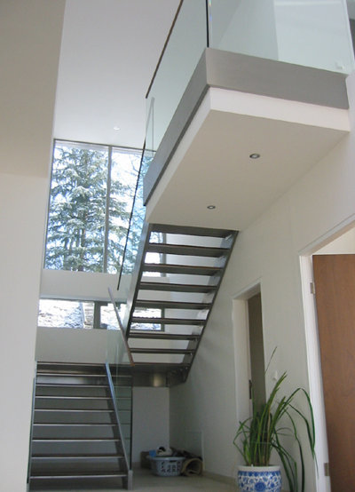 In der Materialsprache des Neubaus teilen sich Funktionszusammenhänge mit: die Schlafräume im Obergeschoss sind in einem massiven holzbekleideten Quader untergebracht, der durch ein umlaufendes Lichtband an Leichtigkeit gewinnt, zum Garten hin löst sich die Struktur in Stahl und Glas auf, wobei der Dachknick mit dem Verlauf des Tageslichts korrespondiert. (Text: Gabriele Kaiser, 05.12.2003)