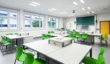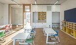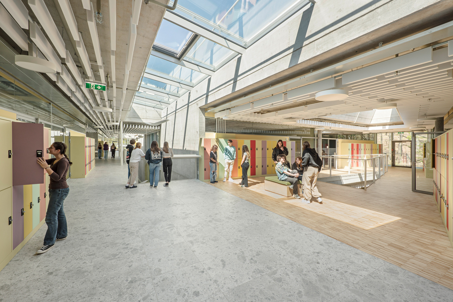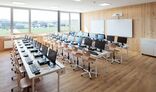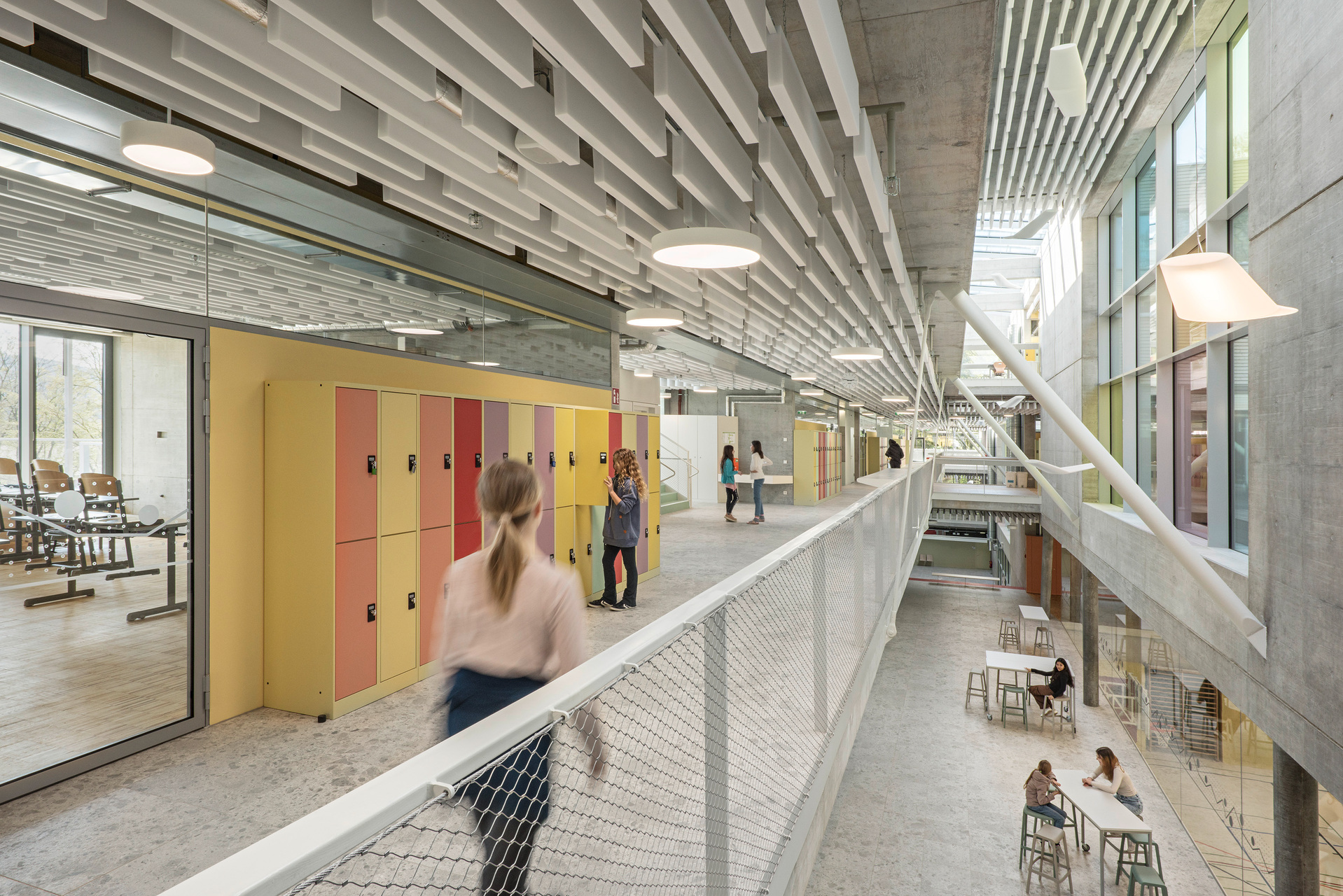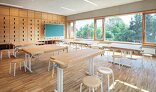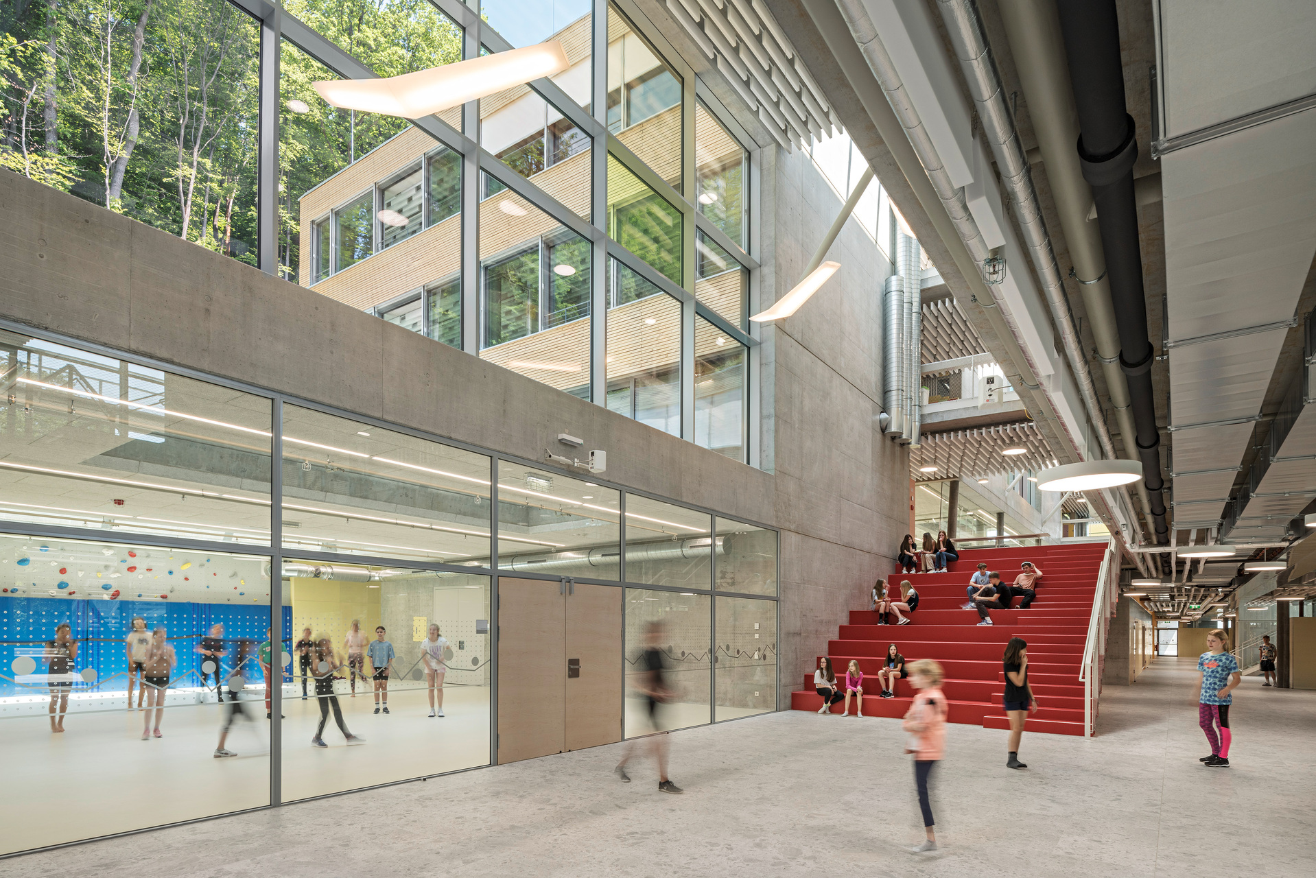 Typologisch verbindet das Projekt einen Terrassentyp mit einem hangseitigen Kammtyp, bei dem jeweils vier Klassenräume einen offenen Hof begrenzen. Durch verschiebbare Wände eignet sich der Grundriss sowohl für ein konventionelles Stammklassensystem, wie es derzeit betrieben wird, als auch für ein Departmentsystem.