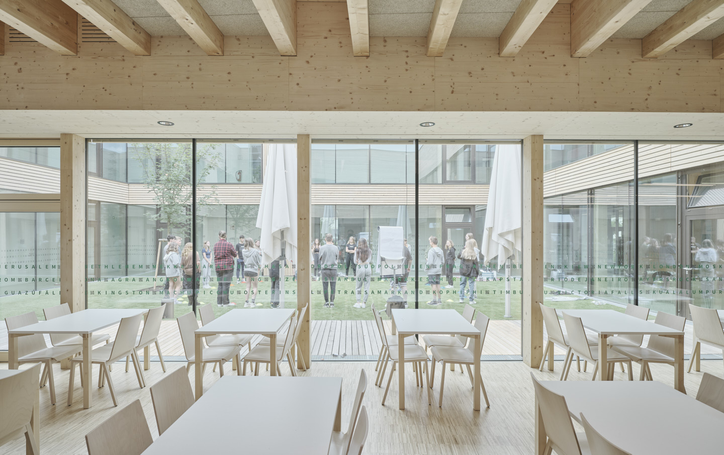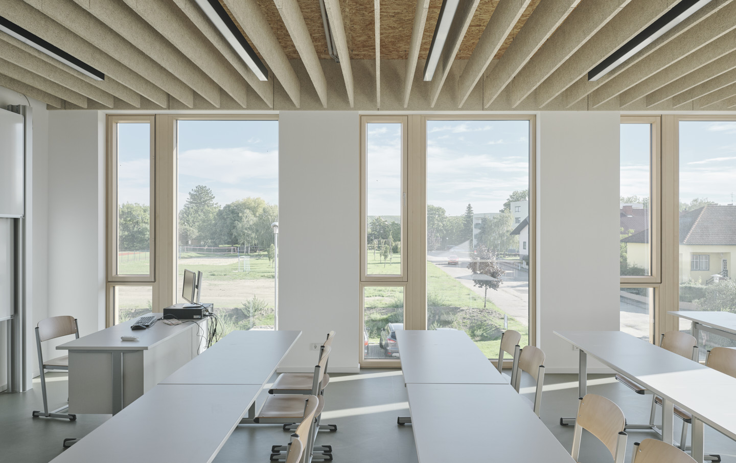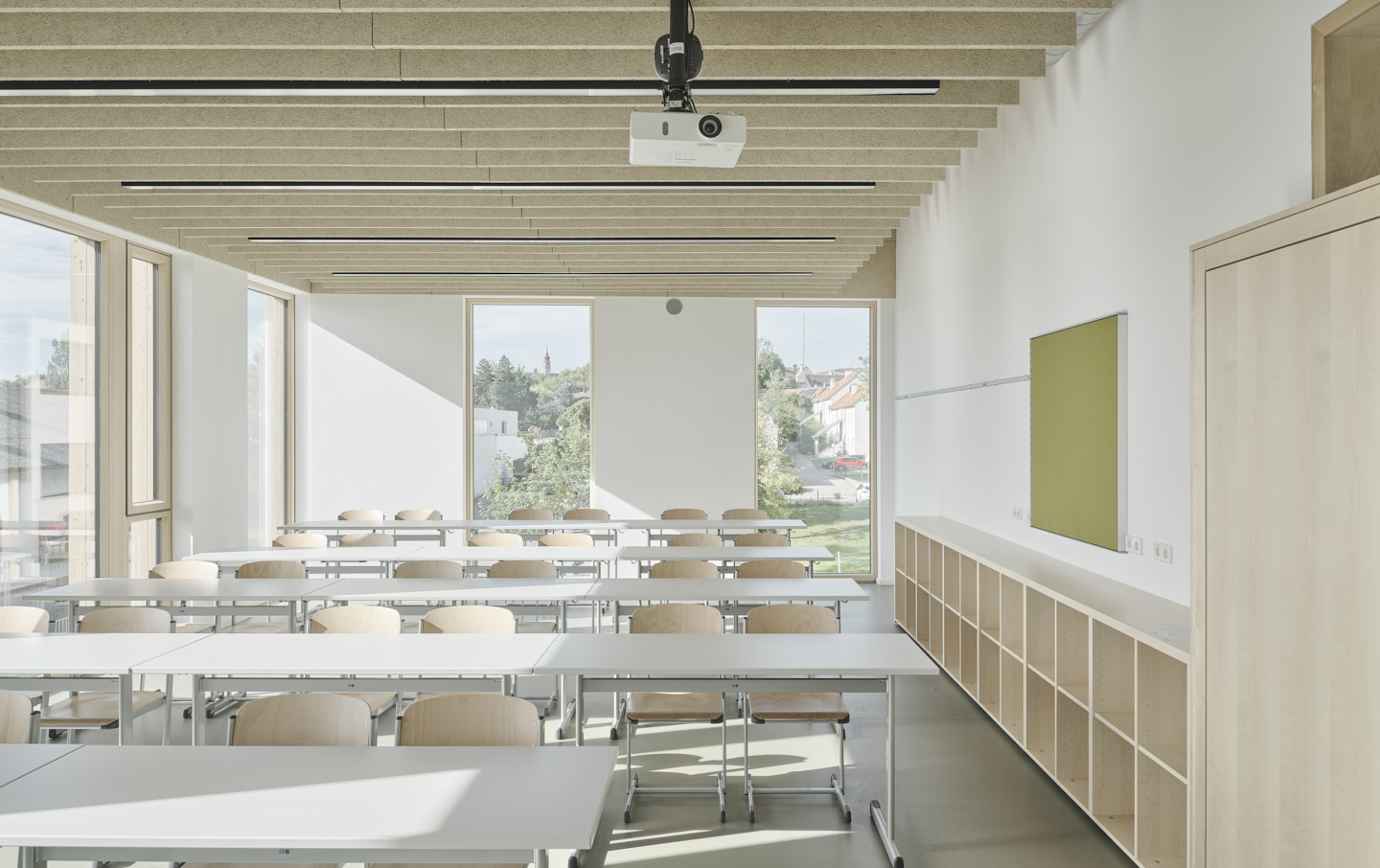 Im Erdgeschoss des Neubaus nebst dem Hauptzugang finden sich die Lehr-Bar sowie die Rezeption wieder. Diese erweitern sich über eine Freiterrasse zum Schulvorplatz - dem Rupert-Rockenbauer Platz - hin. Die angrenzenden Gruppenräume können nun mit einer mobilen Trennwand zusammengeschalten und mit dem vis-a-vis liegenden Schulrestaurant verbunden werden.