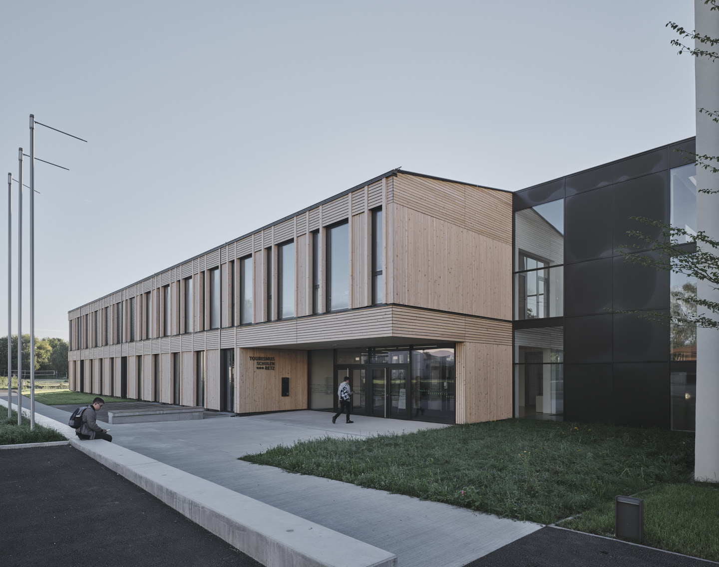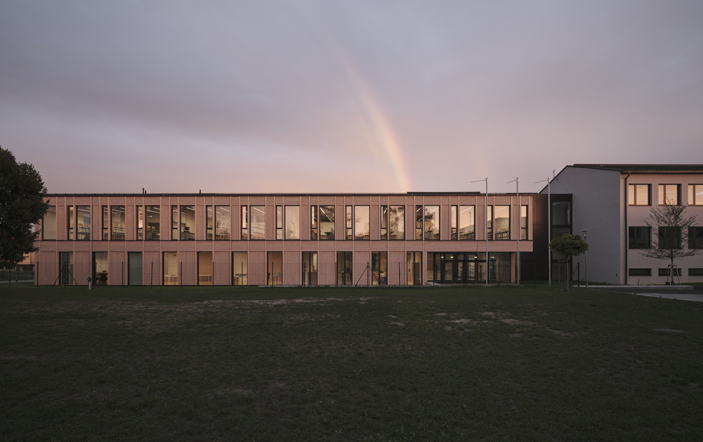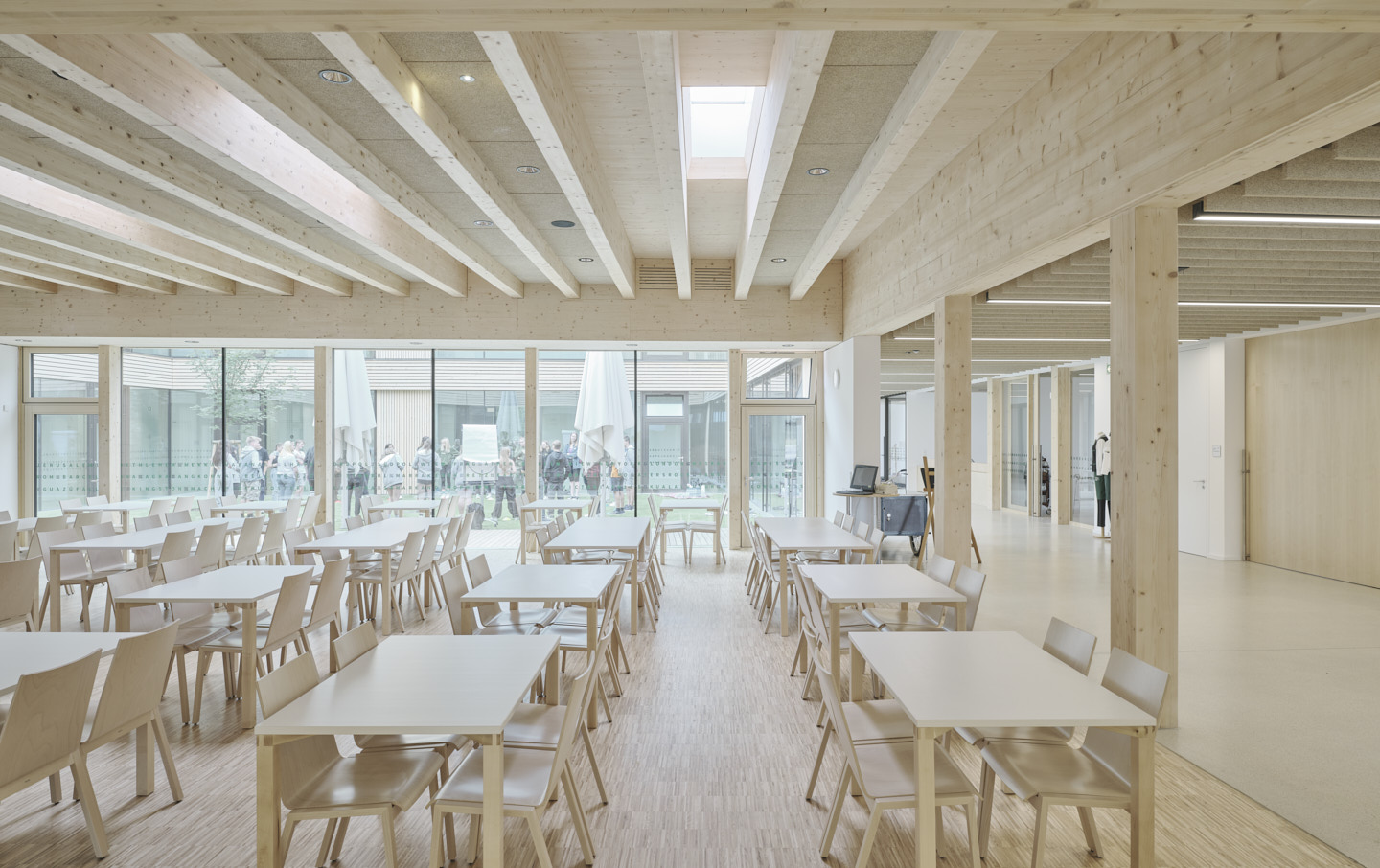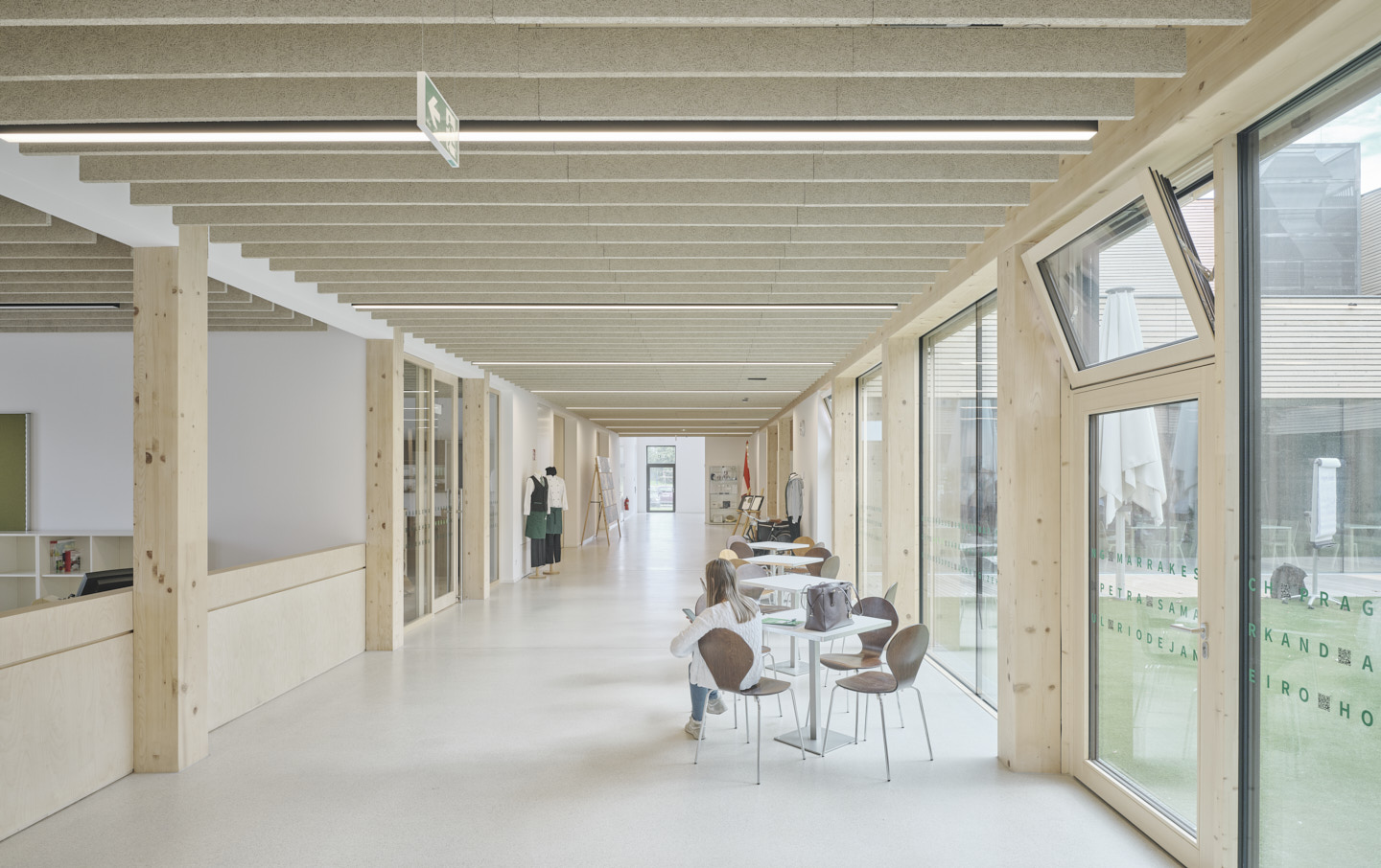 Im Erdgeschoss des Neubaus nebst dem Hauptzugang finden sich die Lehr-Bar sowie die Rezeption wieder. Diese erweitern sich über eine Freiterrasse zum Schulvorplatz - dem Rupert-Rockenbauer Platz - hin. Die angrenzenden Gruppenräume können nun mit einer mobilen Trennwand zusammengeschalten und mit dem vis-a-vis liegenden Schulrestaurant verbunden werden.
