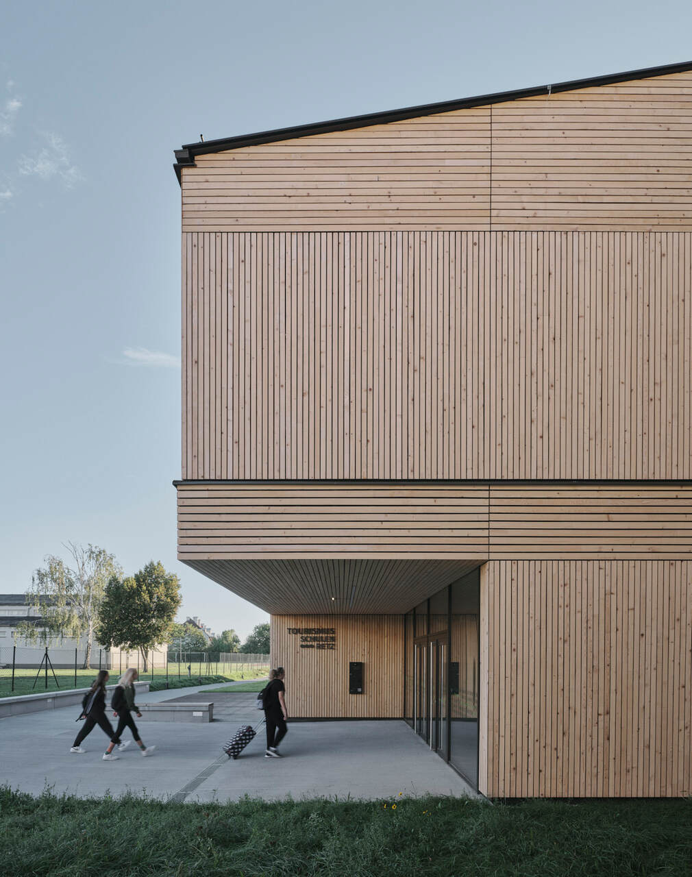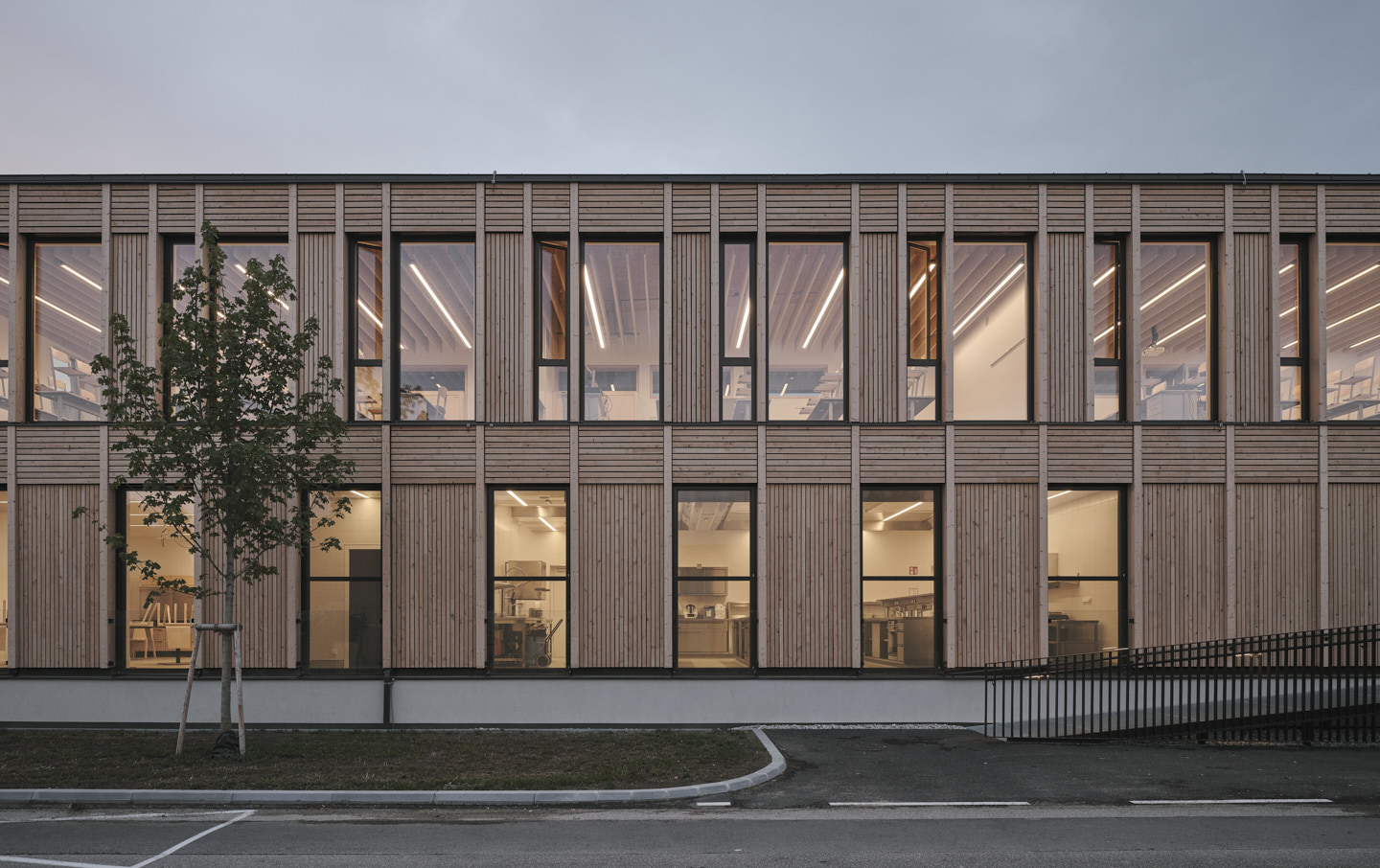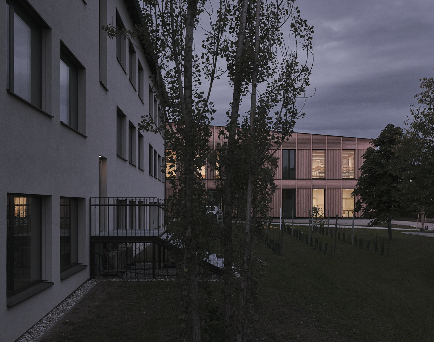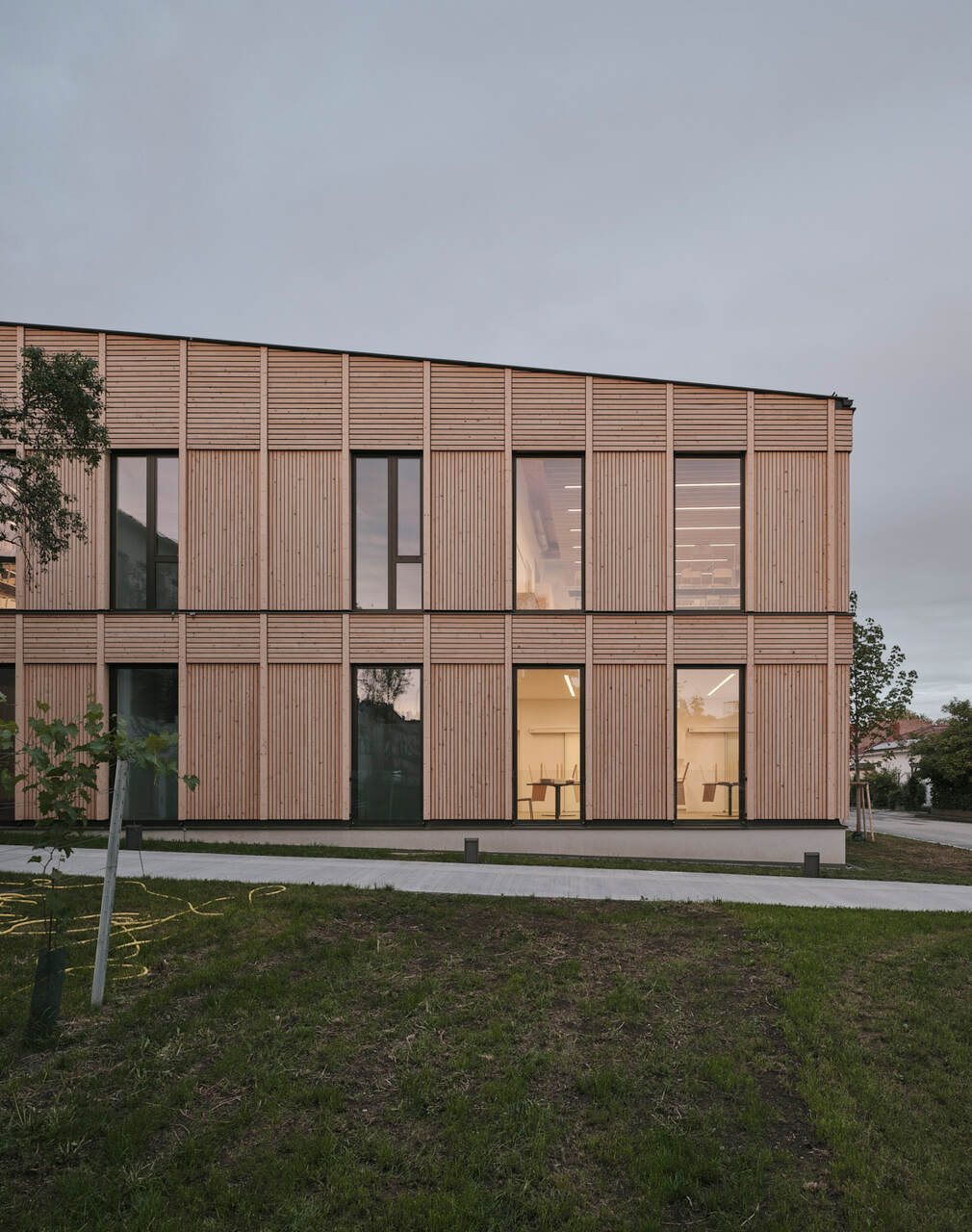 In der äußeren Formensprache wird klar zwischen dem in Holzbauweise errichteten