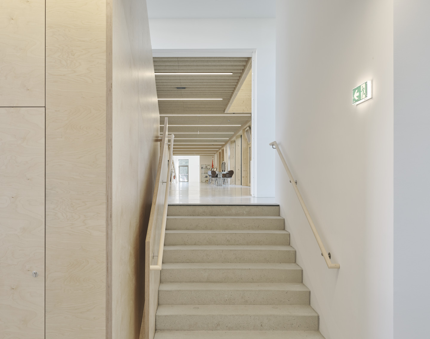 Das Obergeschoss beheimatet 11 Klassenräume in unterschiedlichsten Raumgrößen. Die konzipierten Dachneigungen bleiben auf Grund offener Abhangdecken, wie der konstruktive Holzbau für die Nutzer:innen auch im Inneren erlebbar.