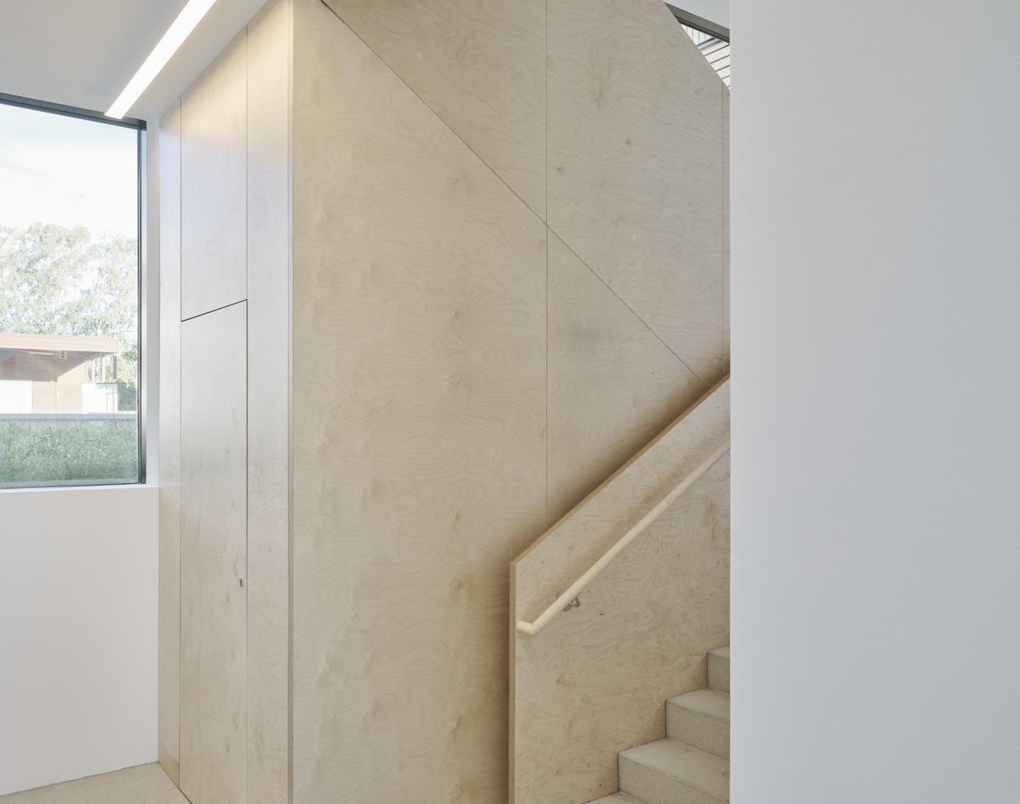 Halbgeschossig versetzt werden über das neu geschaffene, offene Stiegenhaus die einzelnen Ebenen von Bestand und Neubau mit Blick in die zentrale Halle verbunden.