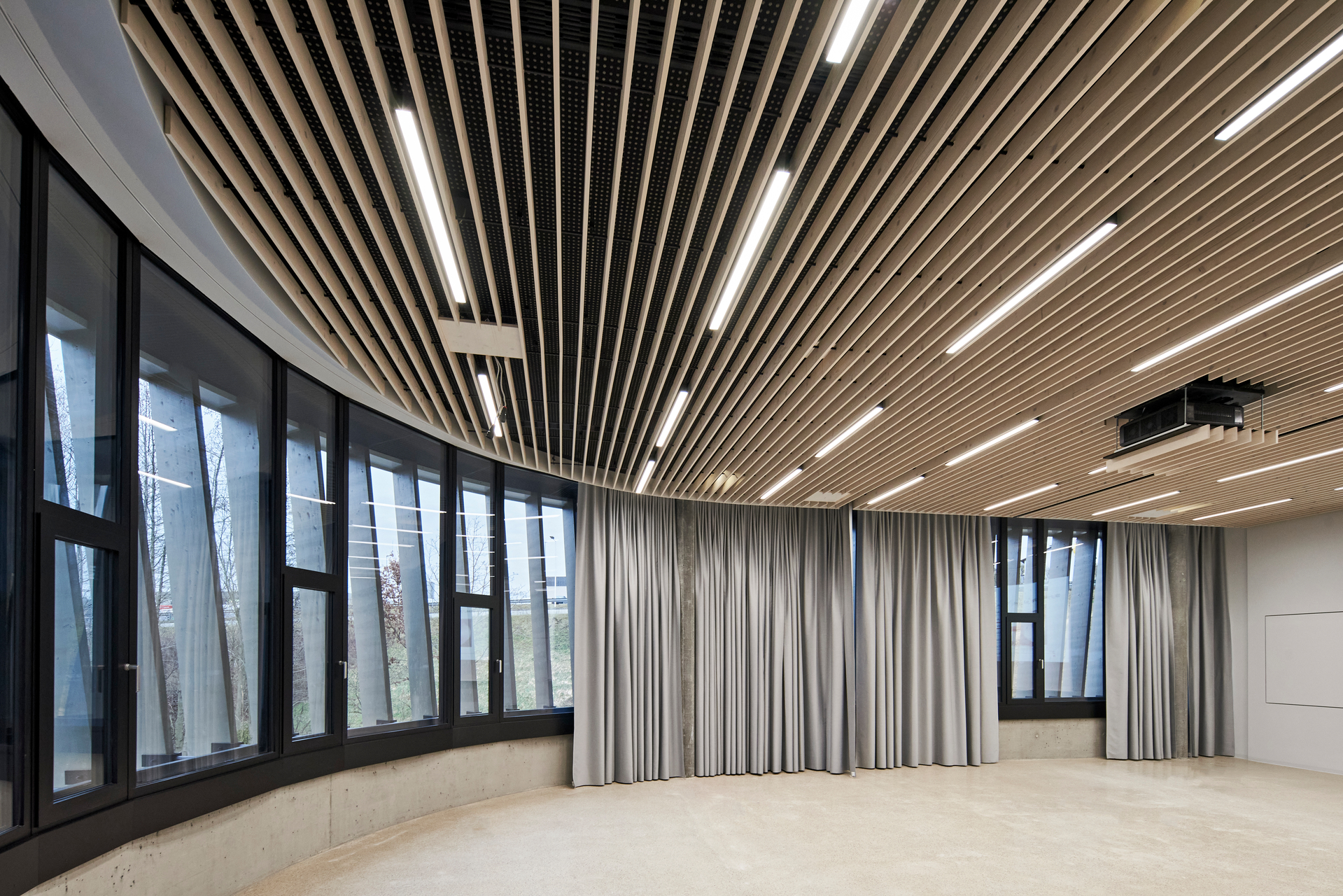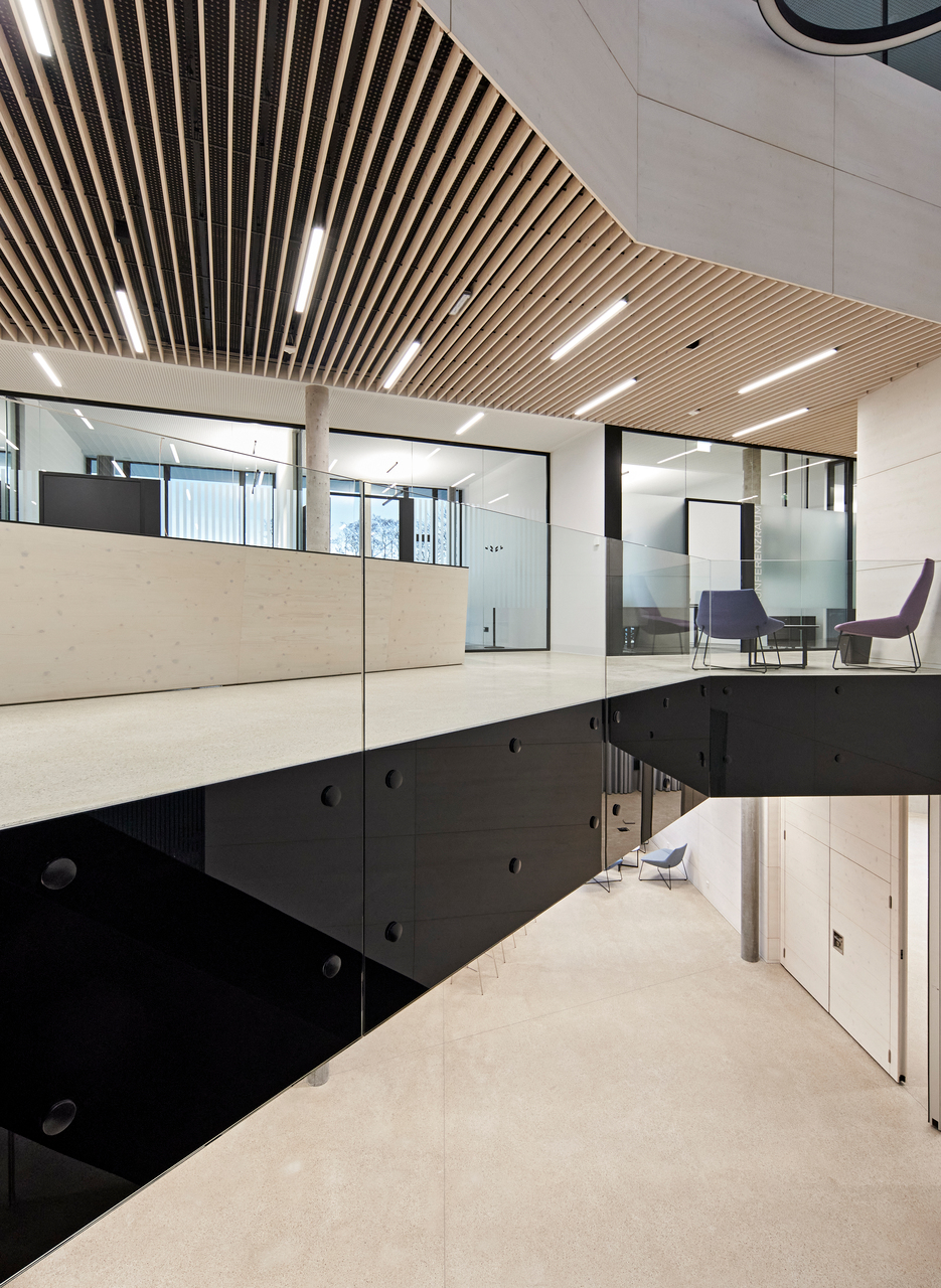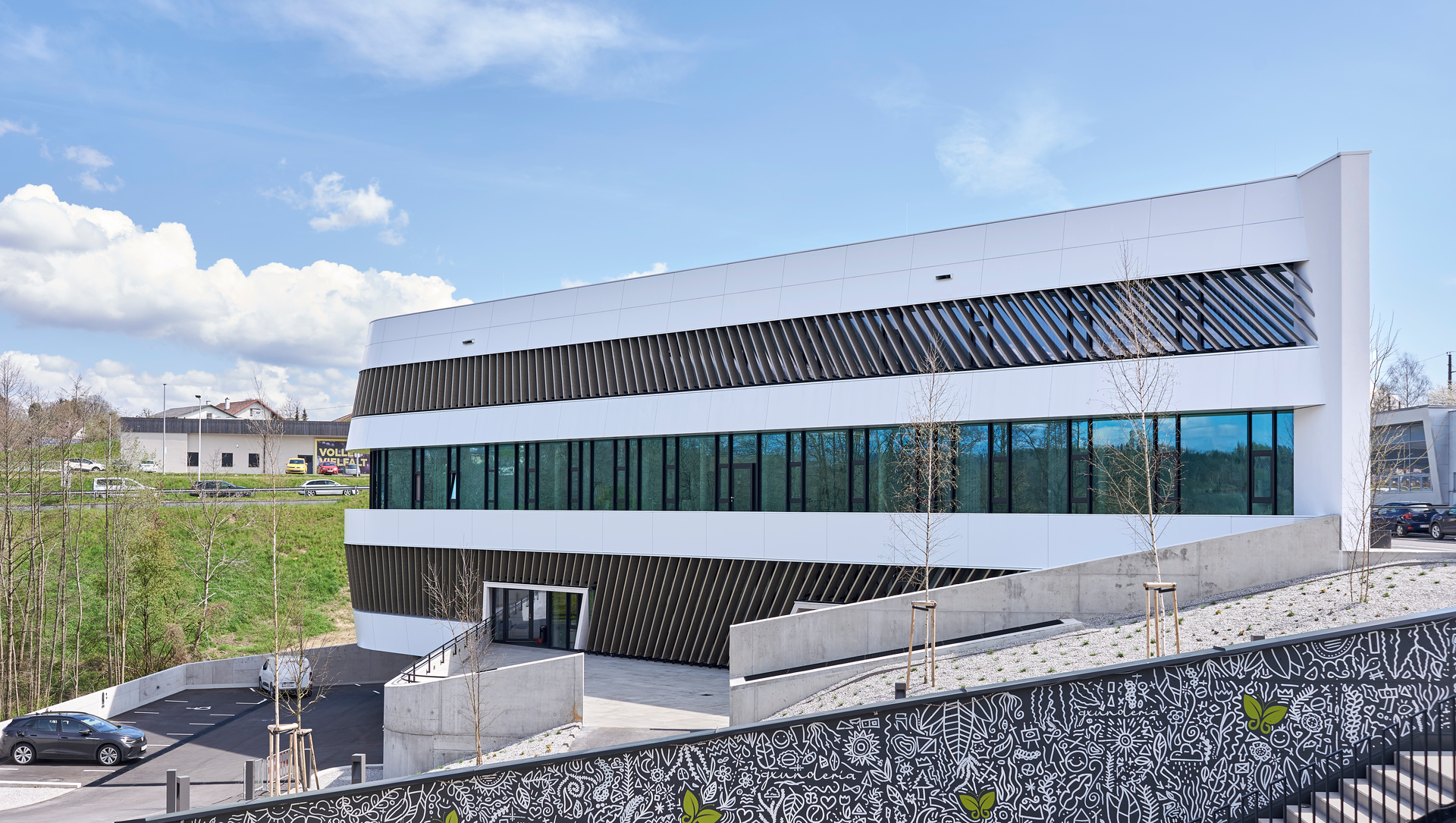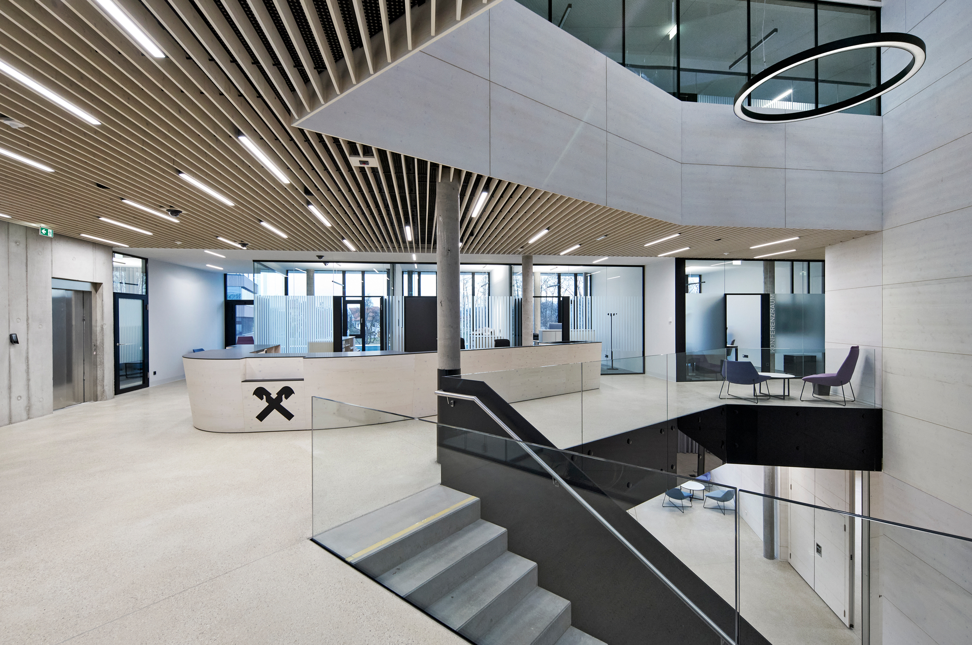Das zentrale Atrium wirkt durch seine offene Gestaltung als „Kommunikationsgenerator“, ermöglicht Blickbeziehungen und Interaktion. Die geschwungene Bürostruktur mit integriertem Funktionskern sorgt für Flexibilität und ermöglicht eine mühelose Anpassung der Einheiten. Holz spielt eine zentrale Rolle bei der Ausstattung – Natur, Landwirtschaft und Nachhaltigkeit als historische Kernwerte des Unternehmens sollen mit dieser Materialwahl metaphorisch repräsentiert werden. Holzlamellen an den verglasten Fassaden vermitteln zwischen innen und außen. Die horizontal gegliederte Außenerscheinung ist ansonsten geprägt von den robusten Fassadenteilen aus weiß-gelb changierendem Alucobond. (Text: Tobias Hagleitner, nach einem Text der Architekten)