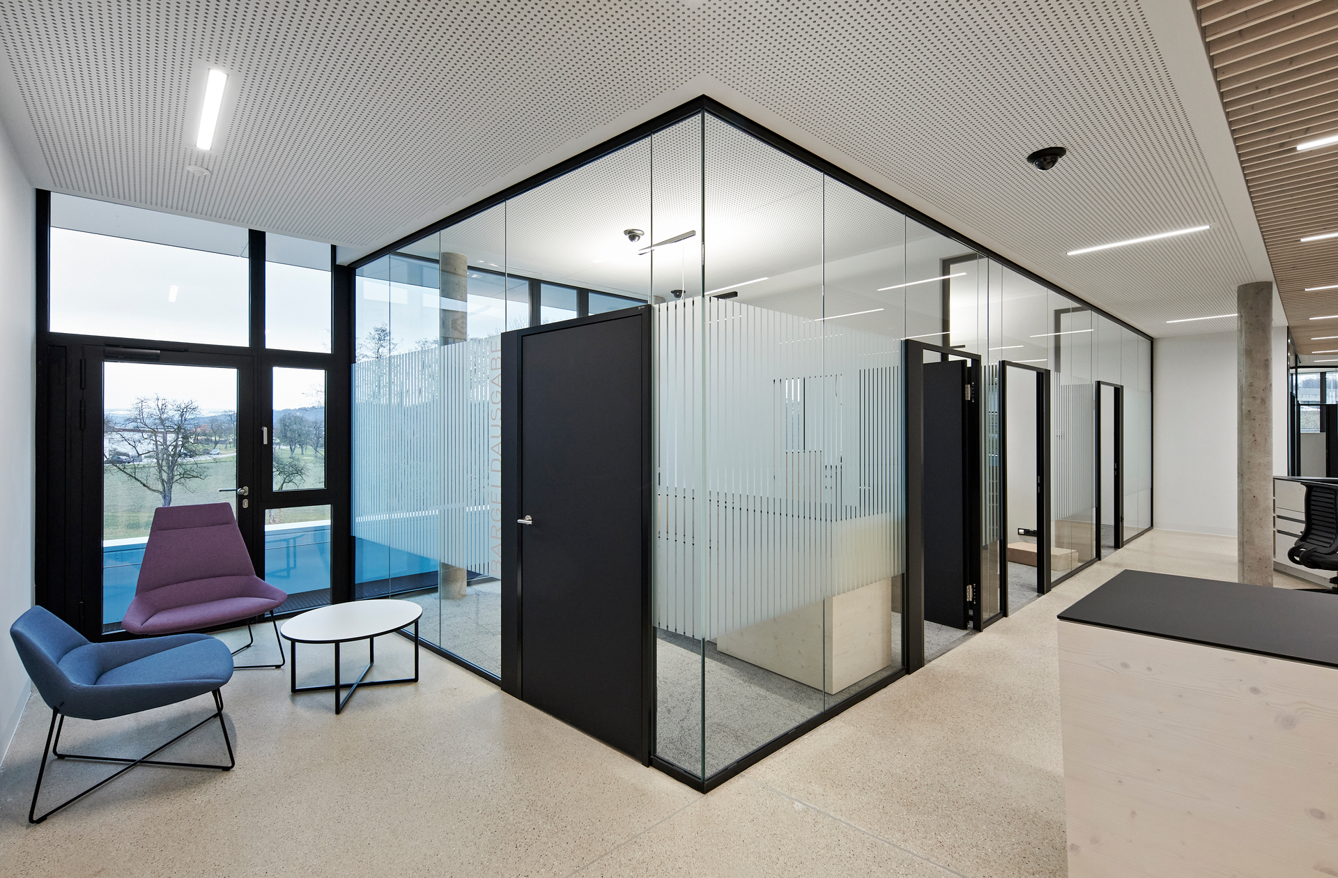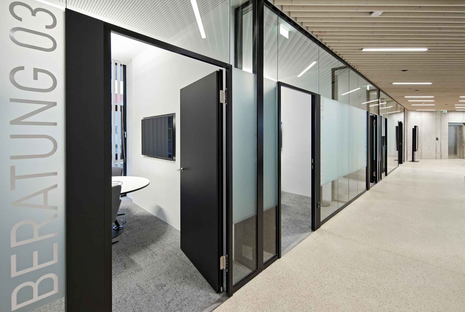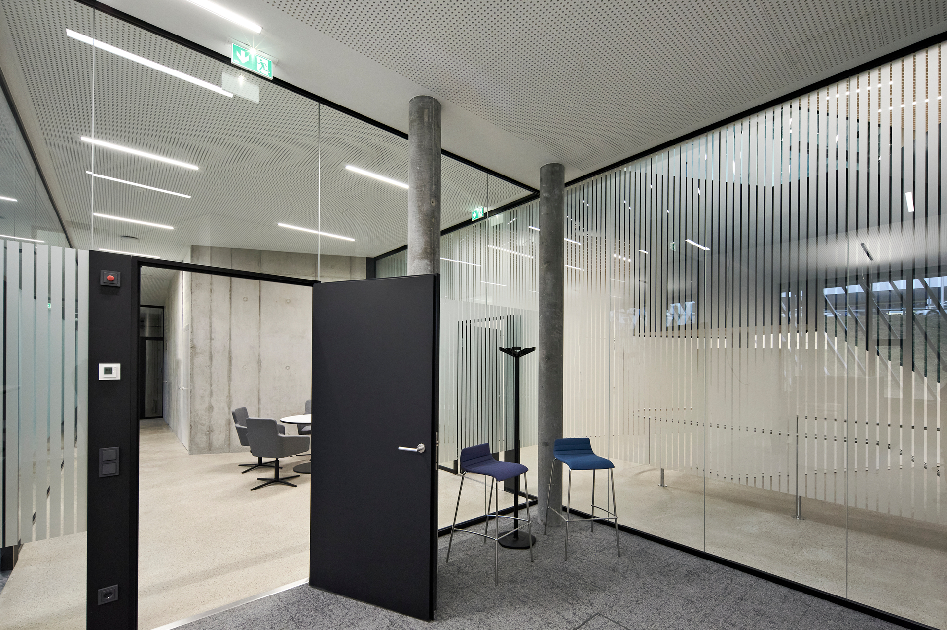 Das zentrale Atrium wirkt durch seine offene Gestaltung als „Kommunikationsgenerator“, ermöglicht Blickbeziehungen und Interaktion. Die geschwungene Bürostruktur mit integriertem Funktionskern sorgt für Flexibilität und ermöglicht eine mühelose Anpassung der Einheiten. Holz spielt eine zentrale Rolle bei der Ausstattung – Natur, Landwirtschaft und Nachhaltigkeit als historische Kernwerte des Unternehmens sollen mit dieser Materialwahl metaphorisch repräsentiert werden. Holzlamellen an den verglasten Fassaden vermitteln zwischen innen und außen. Die horizontal gegliederte Außenerscheinung ist ansonsten geprägt von den robusten Fassadenteilen aus weiß-gelb changierendem Alucobond. (Text: Tobias Hagleitner, nach einem Text der Architekten)