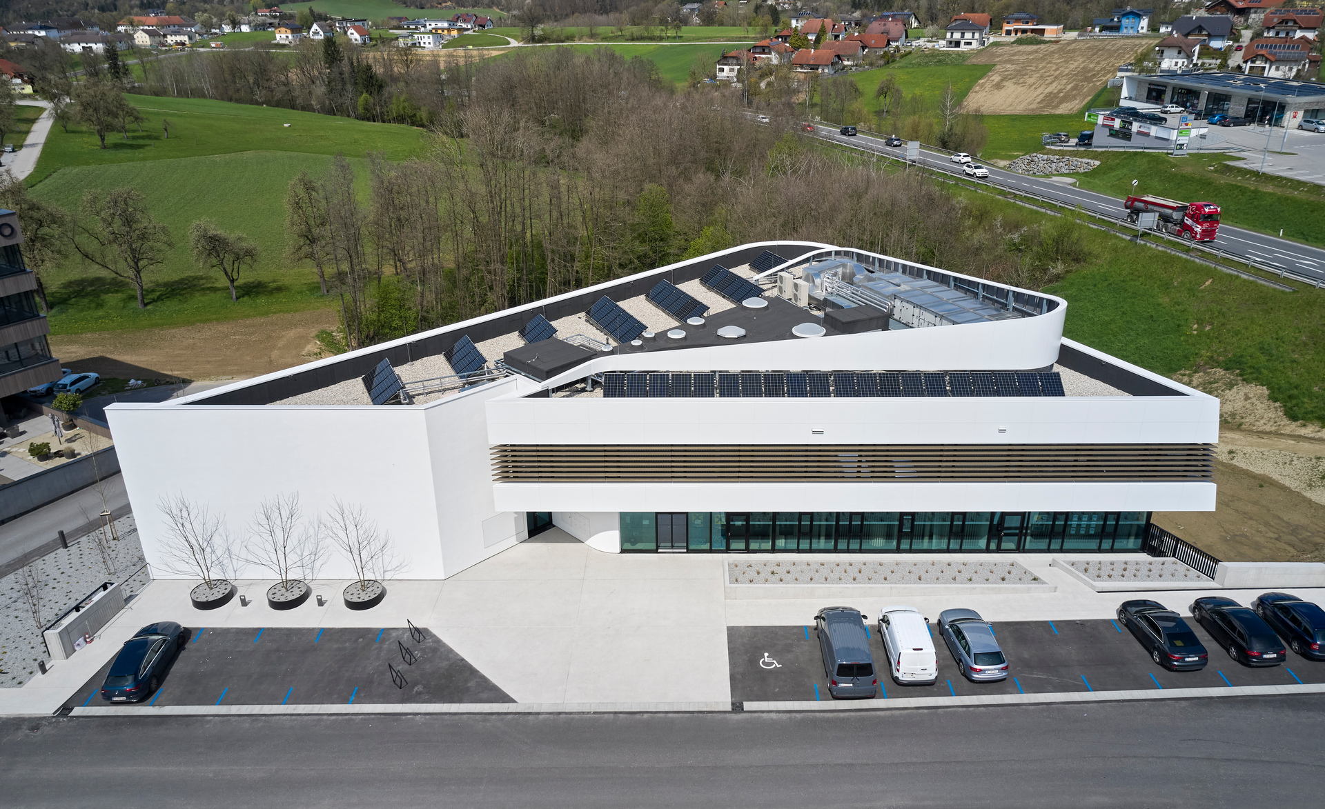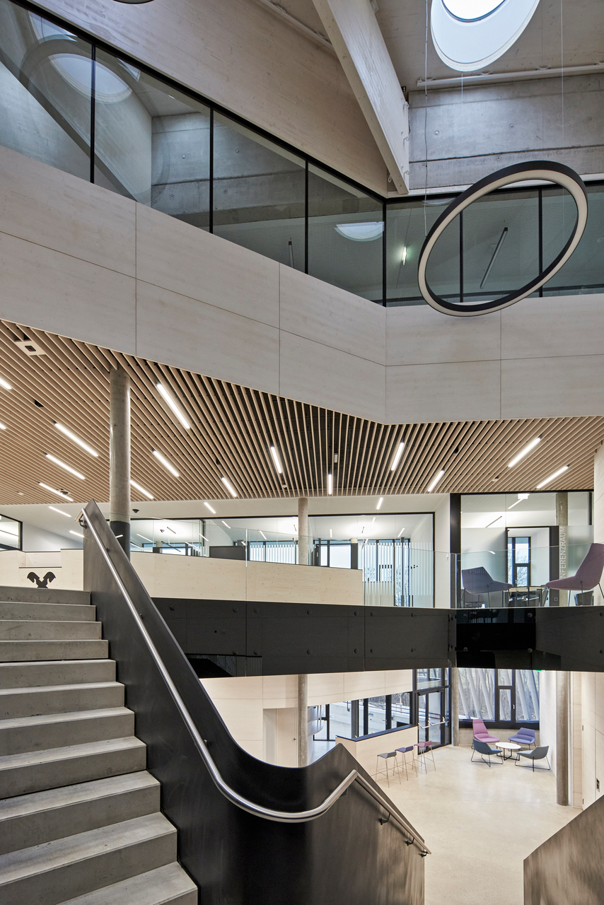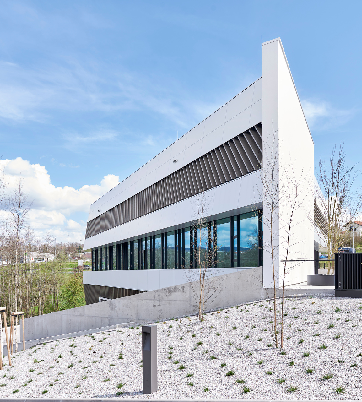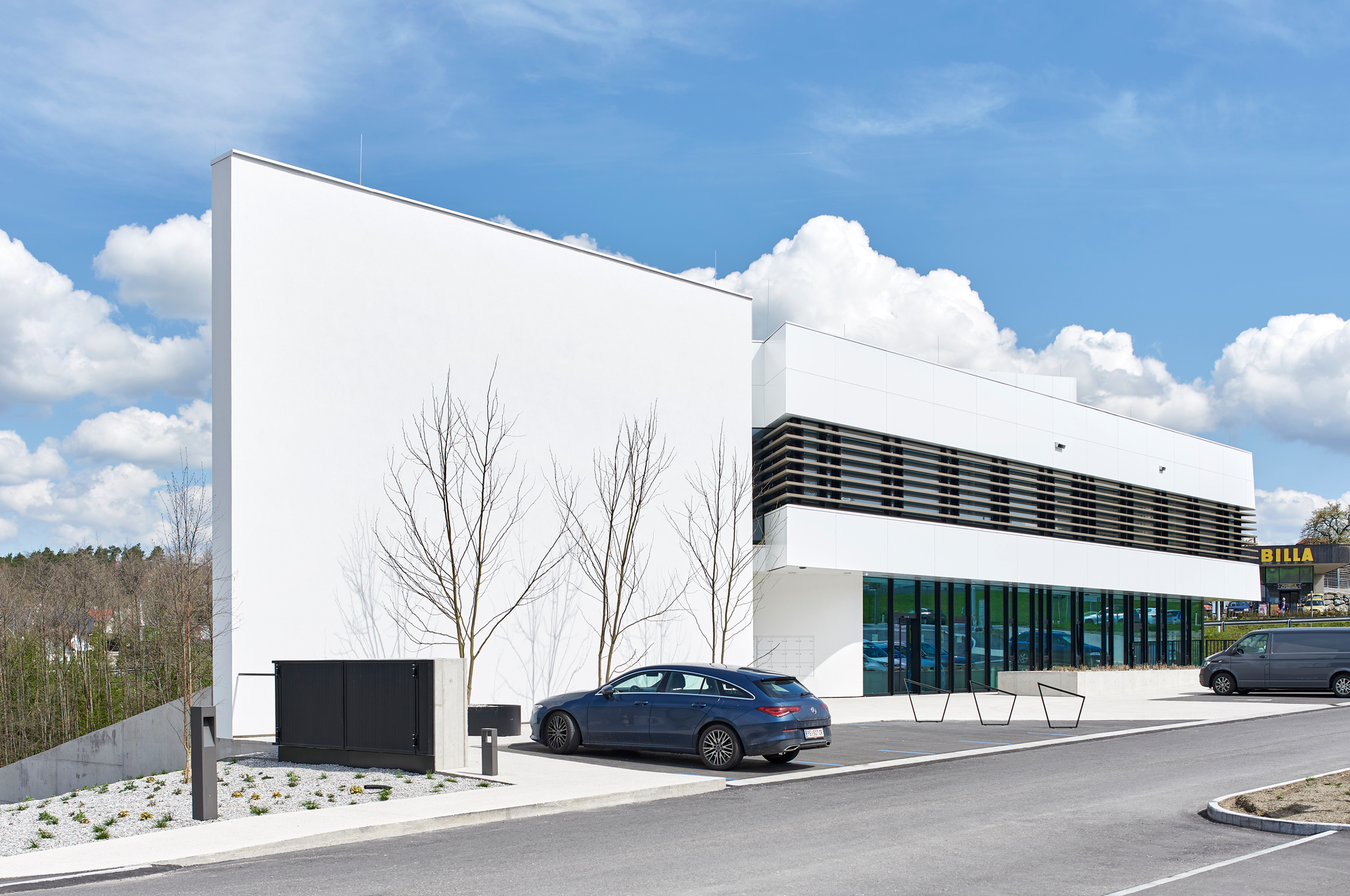 Das zentrale Atrium wirkt durch seine offene Gestaltung als „Kommunikationsgenerator“, ermöglicht Blickbeziehungen und Interaktion. Die geschwungene Bürostruktur mit integriertem Funktionskern sorgt für Flexibilität und ermöglicht eine mühelose Anpassung der Einheiten. Holz spielt eine zentrale Rolle bei der Ausstattung – Natur, Landwirtschaft und Nachhaltigkeit als historische Kernwerte des Unternehmens sollen mit dieser Materialwahl metaphorisch repräsentiert werden. Holzlamellen an den verglasten Fassaden vermitteln zwischen innen und außen. Die horizontal gegliederte Außenerscheinung ist ansonsten geprägt von den robusten Fassadenteilen aus weiß-gelb changierendem Alucobond. (Text: Tobias Hagleitner, nach einem Text der Architekten)
