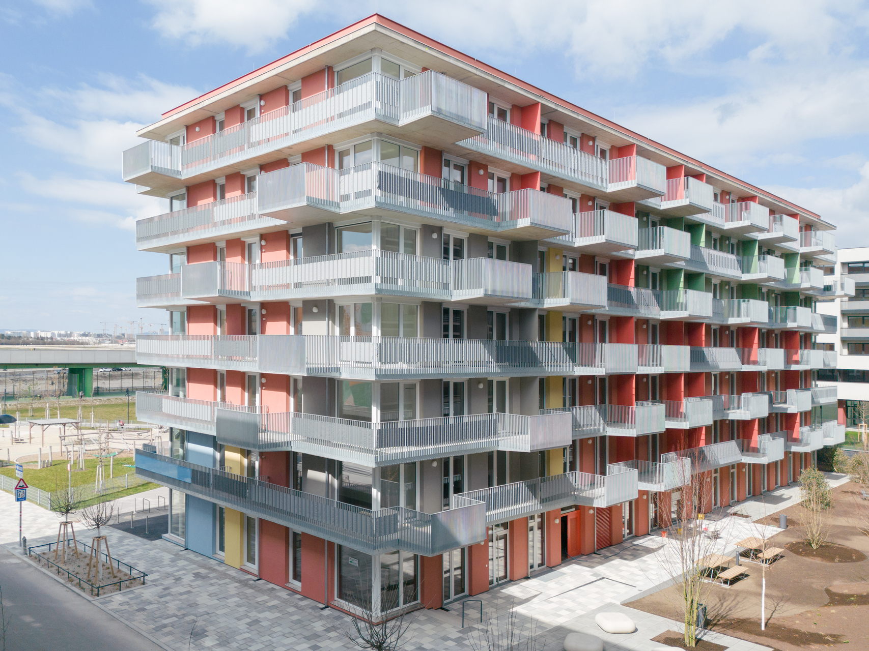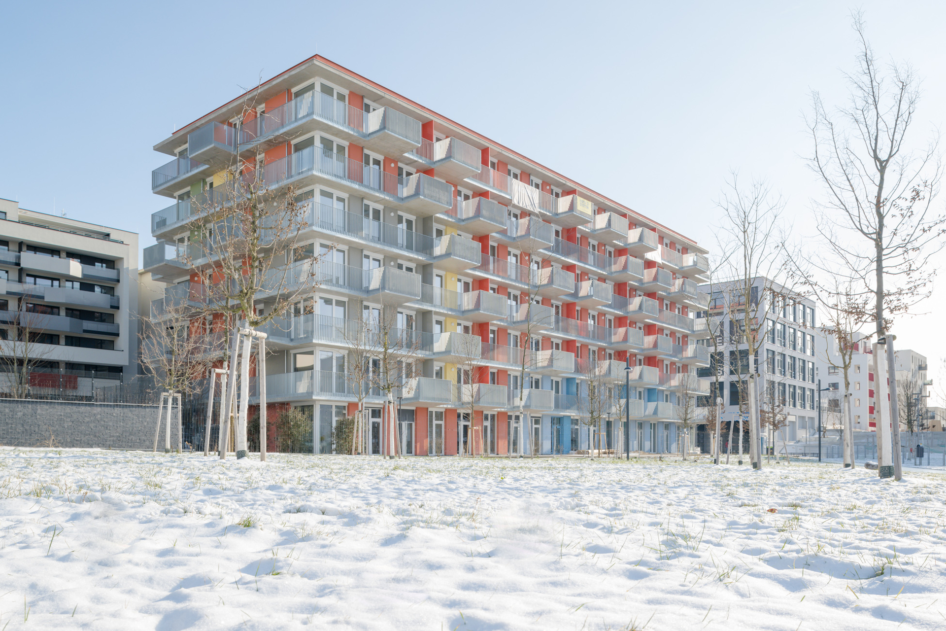Die einen denken an Großmutters 48-teiliges Lilienporzellan, eine pastellfarbene Erbschaft aus den 1950er Jahren, die anderen an frisch angemischtes Vanille-, Erdbeer- und Pistazieneis. Fragt man die planenden Architekt:innen, so bezeichnen sie die in Gelb, Grün, Grau, Hellblau und Ziegelrot gestrichene Fassade als Reminiszenz an historische, längst denkmalgeschützte Gemeindebauten, konkret als Zitat auf Karl-Marx-Hof (von Architekt Karl Ehn, eröffnet 1930), George-Washington-Hof (von den Architekten Karl Krist und Robert Oerley, fertiggestellt1930) und den prächtigen, weithin sichtbaren Reumannhof (von Architekt Hubert Gessner, fertiggestellt 1926) – an jene Zeiten also, als die Vermählung von wenig Geld und viel Schönheit noch kein Widerspruch war, sondern als hohe Tugend gemeinnützigen Wohnens angesehen wurde.