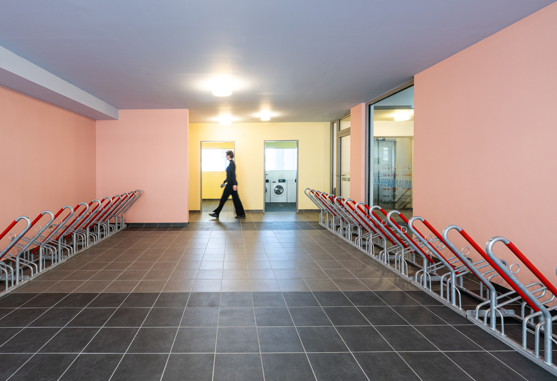 Damit erklären sich auch die große Tiefe der Wohnungen und die schmalen, aber langen Schlafzimmer mit jeweils zwei Zugängen und zwei getrennten elektrischen Schaltkreisen: Falls gewünscht, können die Zimmer mit Vorhängen, Raumteilern oder raumhohen Schrankwänden abgetrennt werden und schaffen auf diese Weise Platz zum Arbeiten im Homeoffice oder für das Patchworkkind, das am Wochenende zu Besuch kommt. In den schematischen Grundrissen und Nutzungsszenarien, mit denen sich WUP architektur in einem zweistufigen Konkurrenzverfahren gegen die Mitstreiter:innen durchsetzen konnte, lässt sich die soziale Kenntnis der Planer:innen, die über das traditionelle Vater-Mutter-Kind-Modell weit hinausreicht, mit einiger Gender-Ironie ablesen – samt Bügelbrettern, Kraftkammern und Modelleisenbahnen.