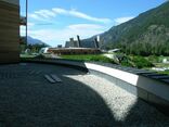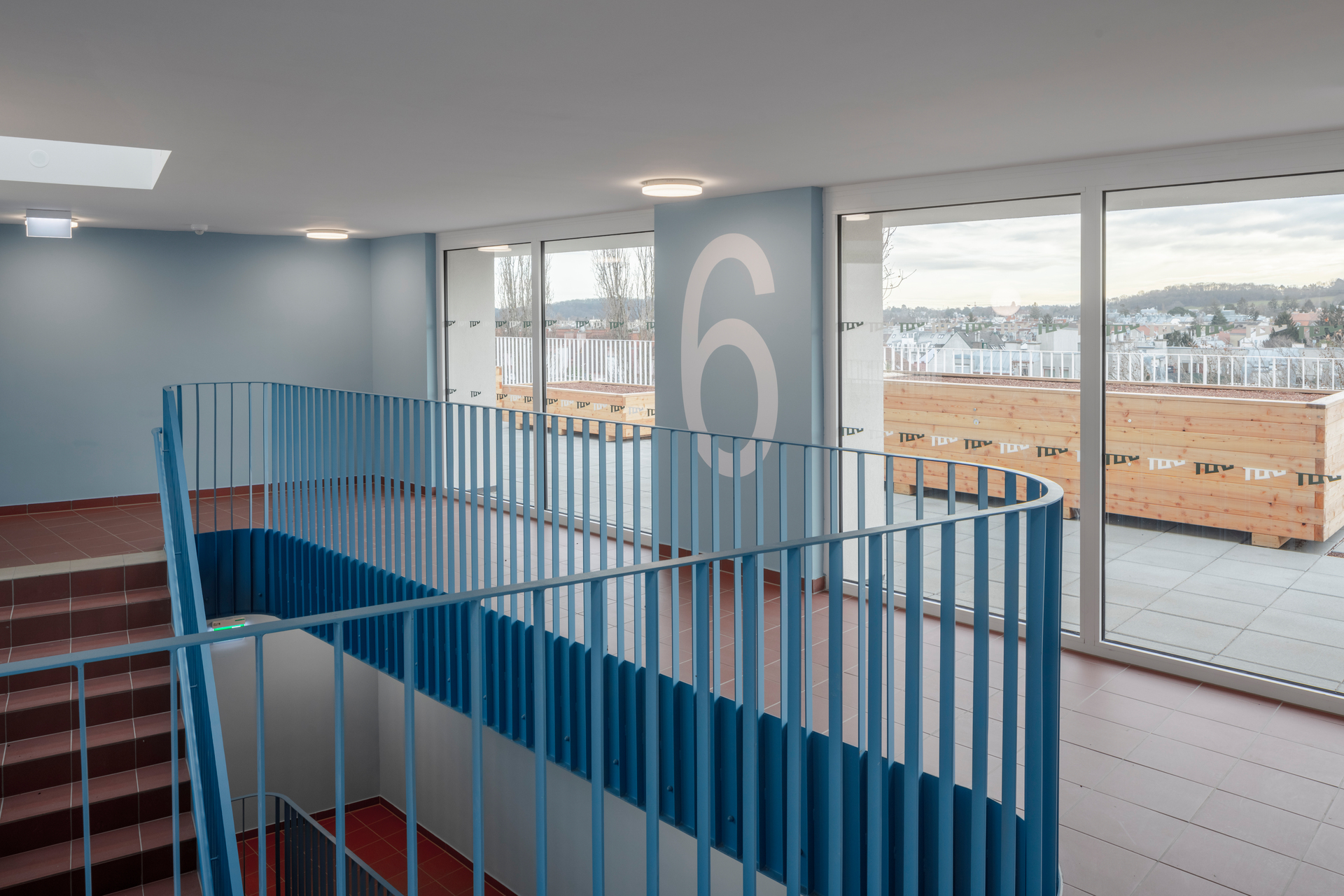 Am meisten fällt der Dachgarten mit Terrasse ins Auge, der eine urbane Oase und einen Panoramablick auf die Stadt bietet. Als „Umweltpuffer“ trägt er dazu bei, den städtischen Wärmeinseleffekt zu reduzieren. Die Terrasse ist als öffentlicher Raum für die Gemeinschaft konzipiert und fördert Aktivitäten im Freien und soziale Interaktionen. Die übrigen Dächer sind begrünt und mit Sonnenkollektoren bestückt. (Autor: Achim Geissinger, nach einem Text der Architekten)