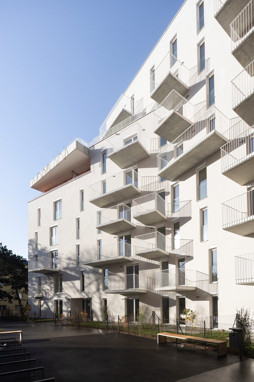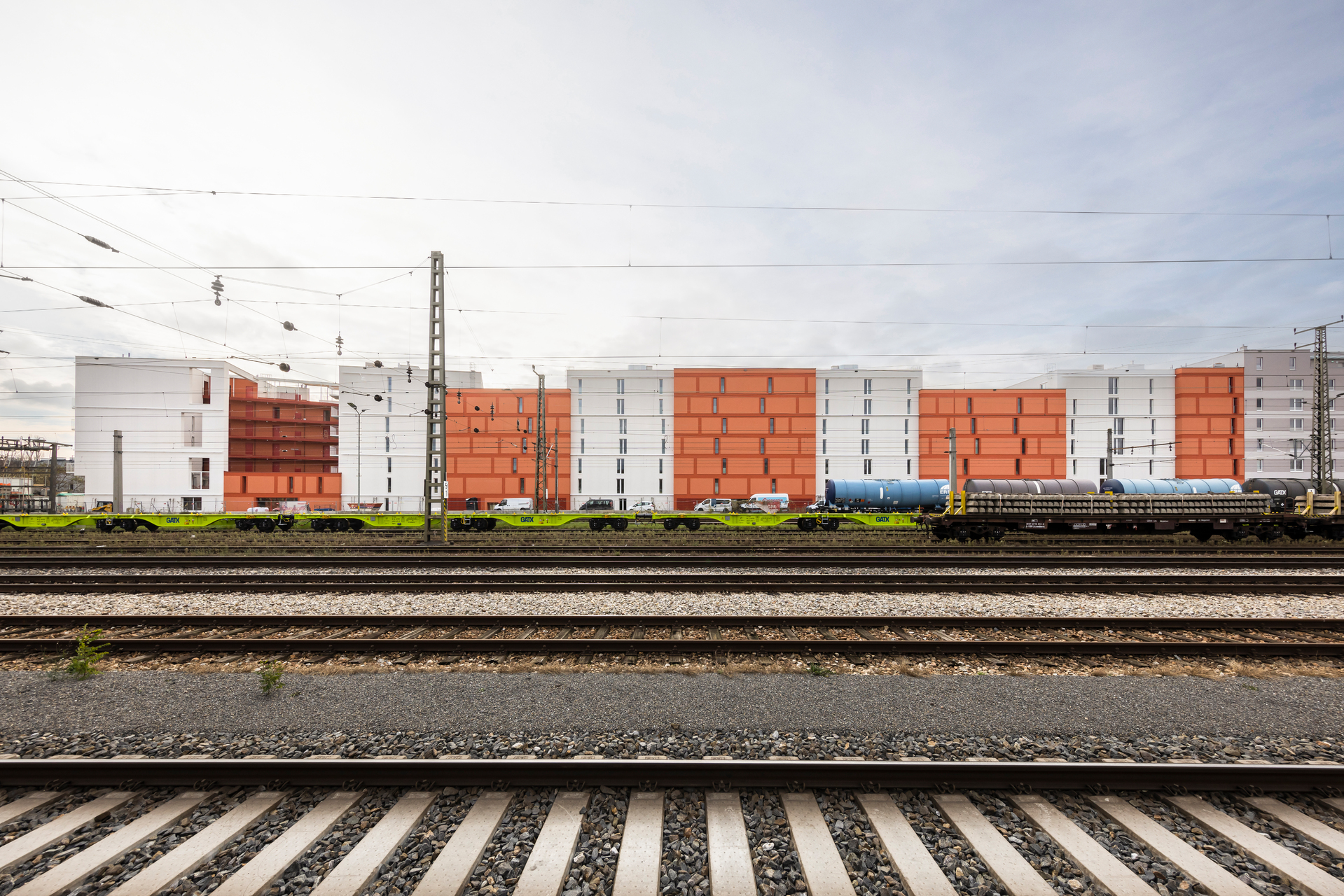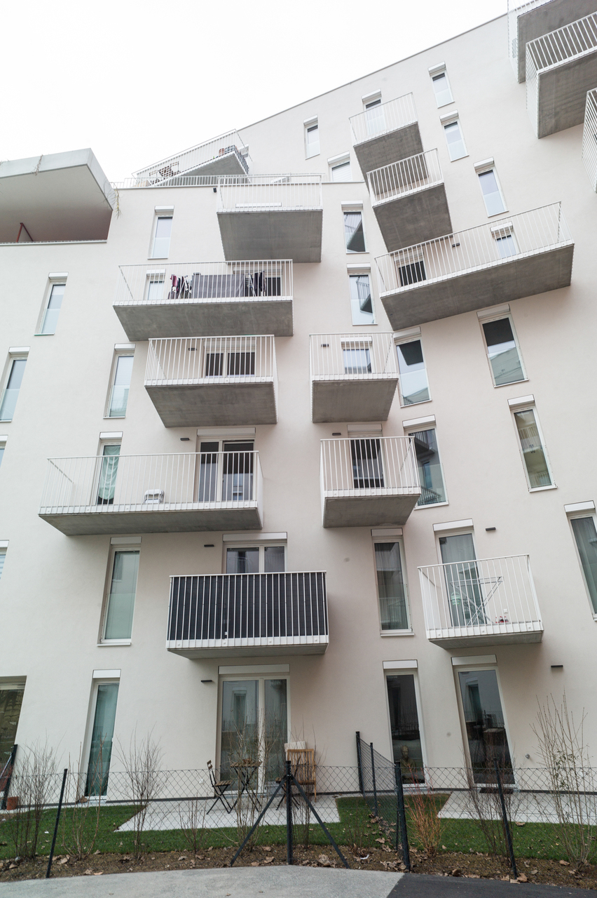 Die wenig bezaubernde Lage am westlichen Stadtrand ist von Schienensträngen der Bahn geprägt, und auch der nahegelegene Wienfluss entfaltet, eingezwängt zwischen Straßen und dem Gleiskörper der offen geführten U-Bahn nicht viel Charme. Das Ensemble besteht aus einer Abfolge von fünf Häusern quer zu Fluss und Verkehrswegen, sowie verbindenden Bauteilen längs des Tals. Die Nordseite zur Bahn zeigt sich als langer, rhythmisierter „Rücken“, mit einzelnen verglasten Öffnungen zu den Innenhöfen hin. Die teils offenen, teils geschlossenen Höfe eignen sich als Herzstück der Anlage für Kommunikation und Interaktion im Freien. Dem leicht abfallenden Gelände folgend sind die Baukörper vom höheren Bahnniveau ausgehend nach Süden und zur bestehenden Wohnbebauung hin abgestuft. Es gibt keine Wohnungen mit Nordausrichtung.