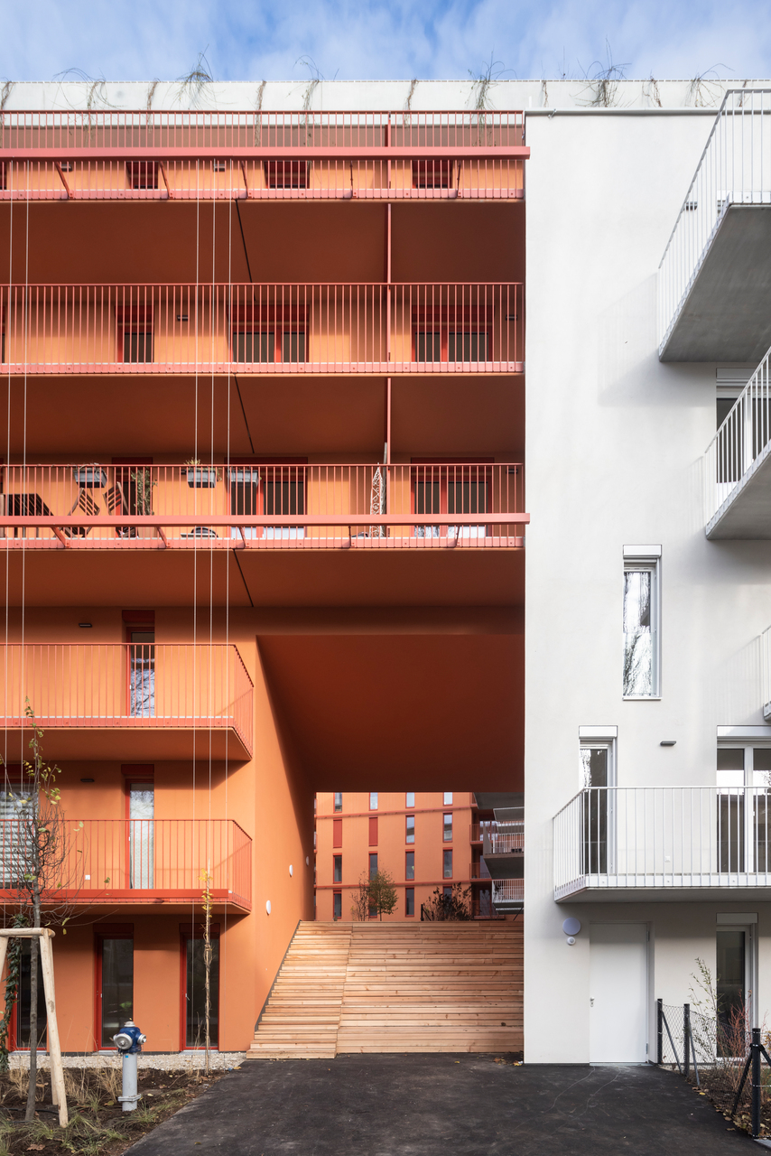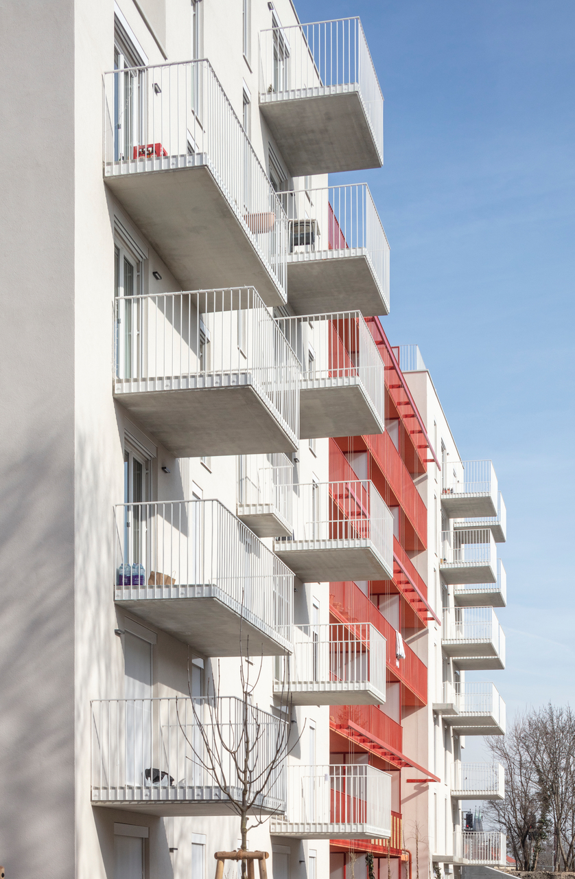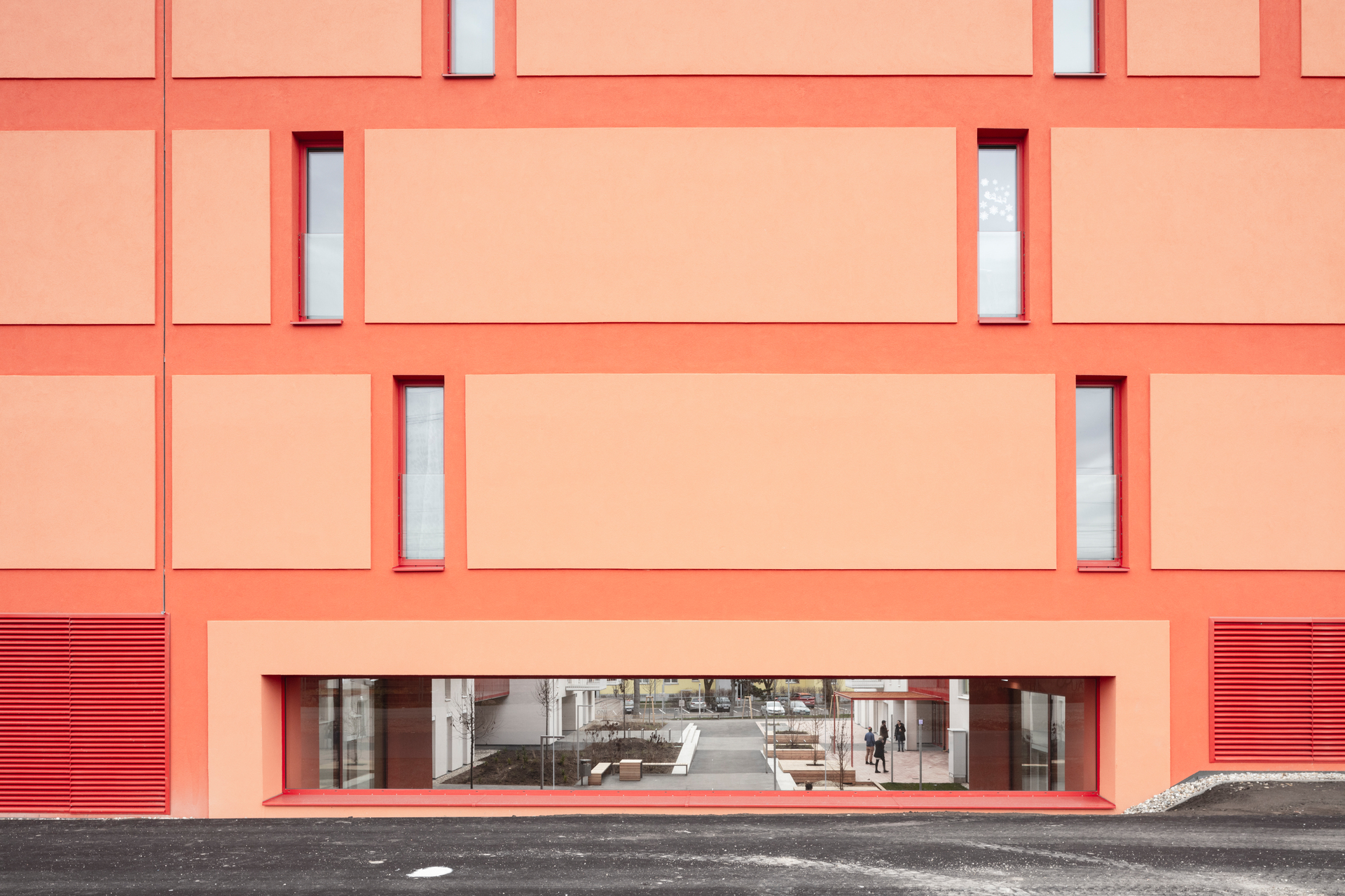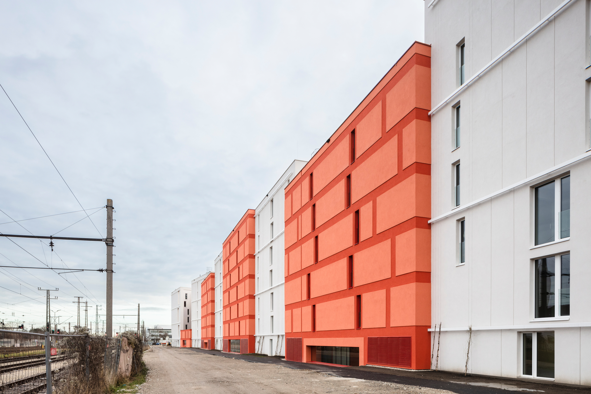 Die wenig bezaubernde Lage am westlichen Stadtrand ist von Schienensträngen der Bahn geprägt, und auch der nahegelegene Wienfluss entfaltet, eingezwängt zwischen Straßen und dem Gleiskörper der offen geführten U-Bahn nicht viel Charme. Das Ensemble besteht aus einer Abfolge von fünf Häusern quer zu Fluss und Verkehrswegen, sowie verbindenden Bauteilen längs des Tals. Die Nordseite zur Bahn zeigt sich als langer, rhythmisierter „Rücken“, mit einzelnen verglasten Öffnungen zu den Innenhöfen hin. Die teils offenen, teils geschlossenen Höfe eignen sich als Herzstück der Anlage für Kommunikation und Interaktion im Freien. Dem leicht abfallenden Gelände folgend sind die Baukörper vom höheren Bahnniveau ausgehend nach Süden und zur bestehenden Wohnbebauung hin abgestuft. Es gibt keine Wohnungen mit Nordausrichtung.