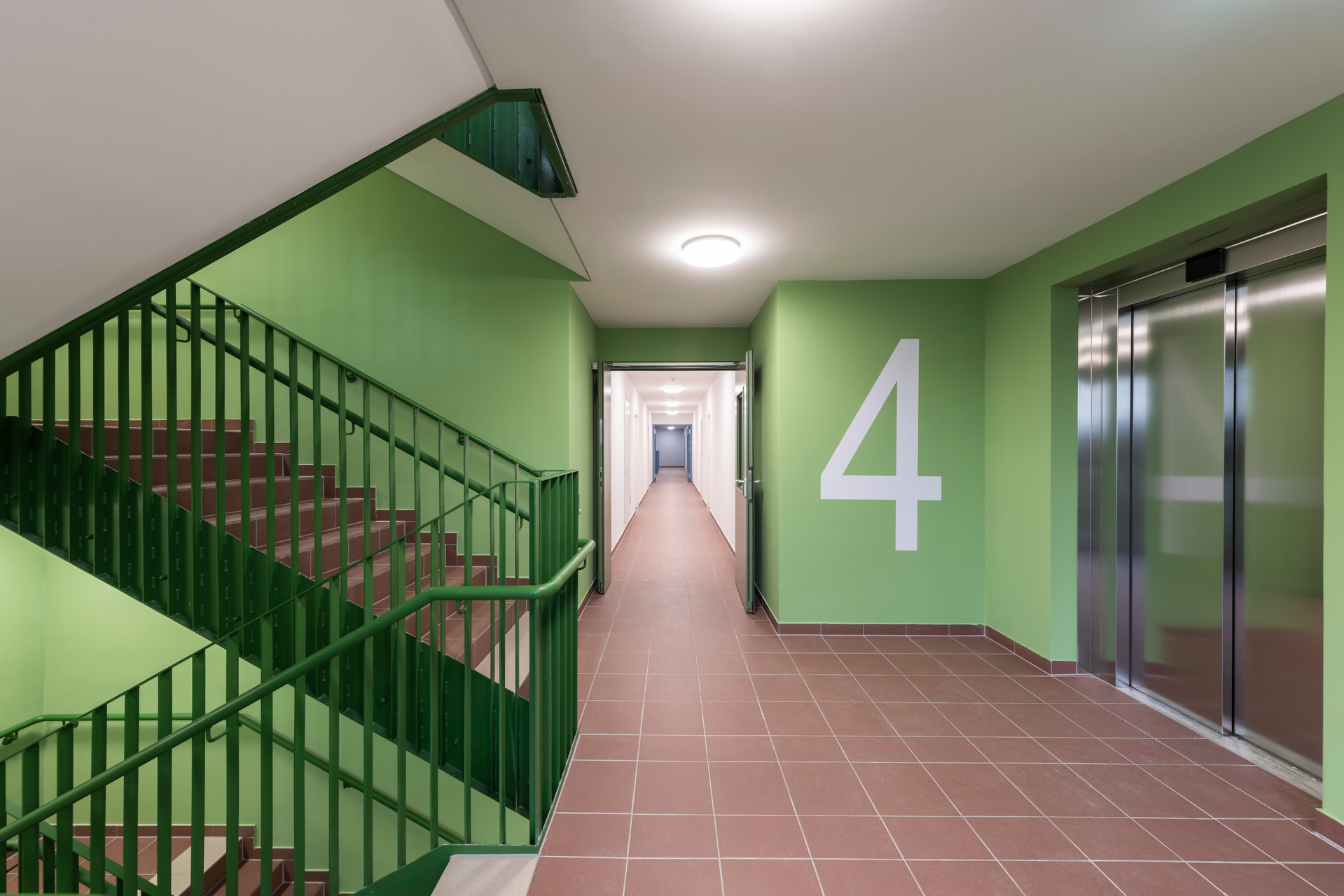 Die Wohnungsgrundrisse sind flexibel konzipiert und vielfältig modulierbar. Sowohl die Möglichkeit zur Aufteilung in kleinere Einheiten als auch zum Anschluss an noch größere Einheiten ist vorgesehen. Größtenteils wurden Elementdecken und vorgefertigte Wandelemente eingesetzt. Tragende Wände und Decken sind in Stahlbeton ausgeführt.