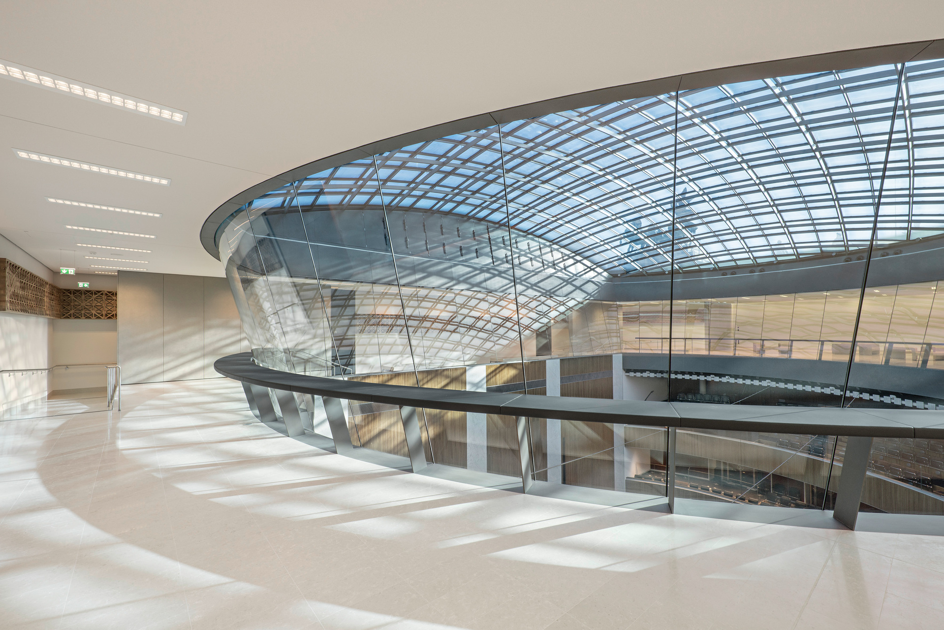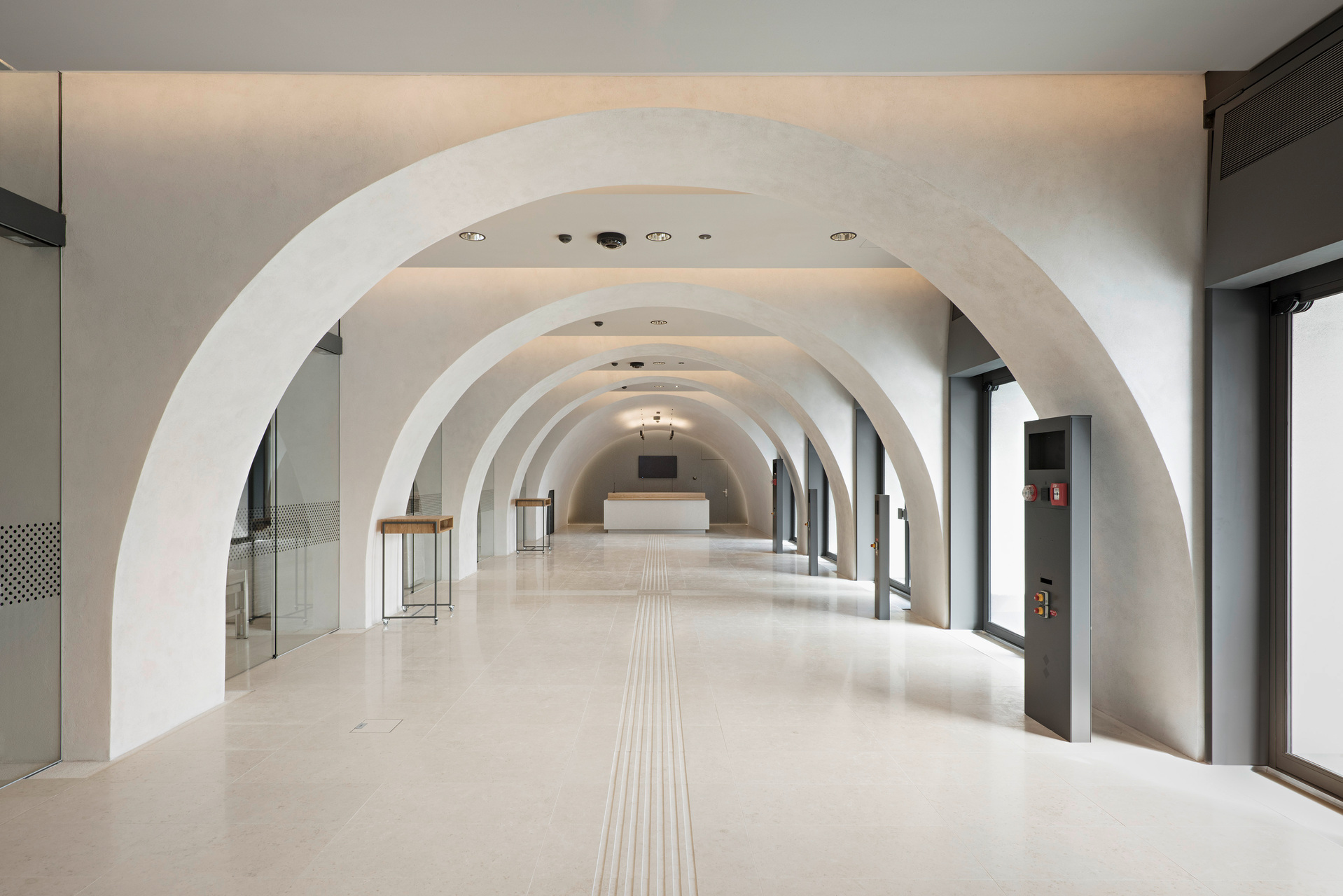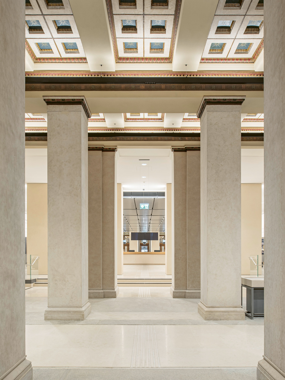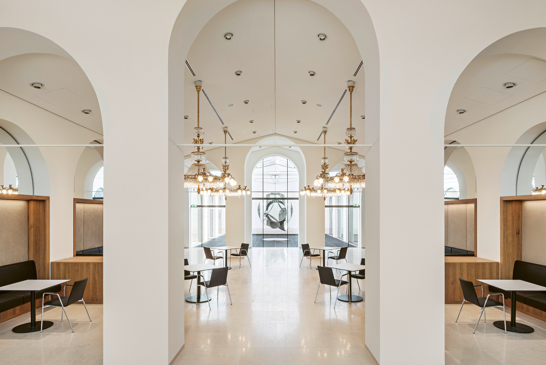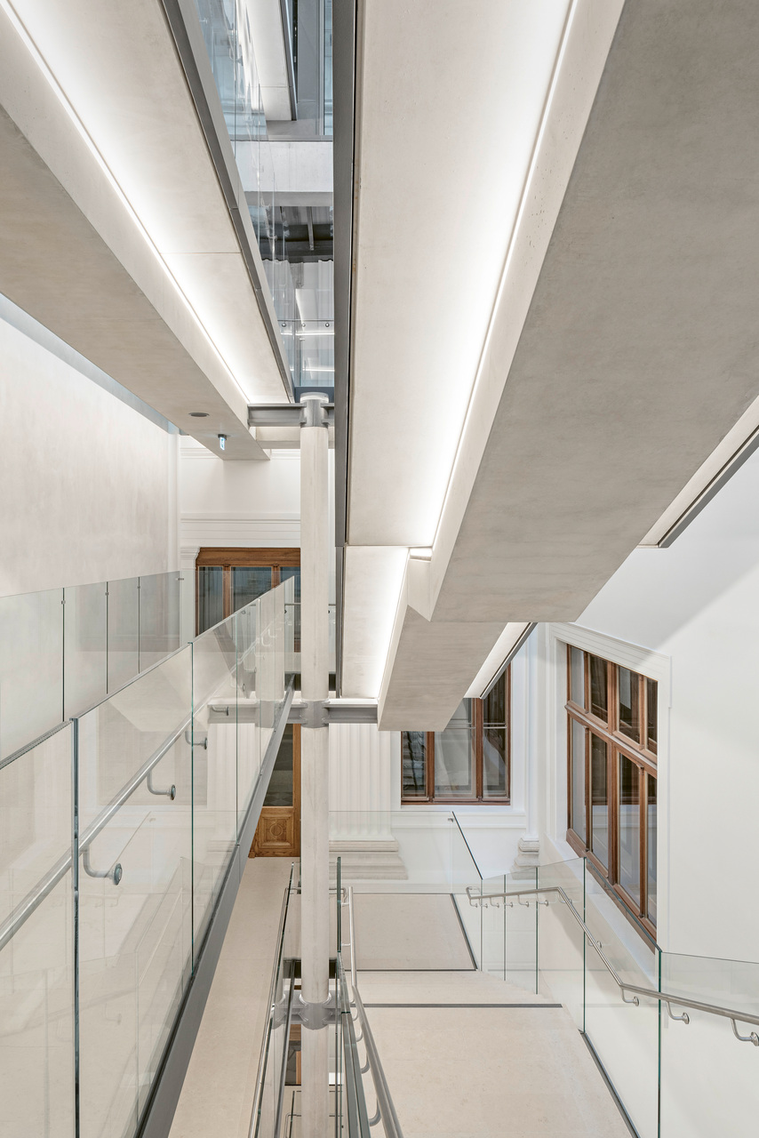 Vier neue, zentrale Treppenhäuser sind wie Tische frei in die Innenhöfe gestellt. Sie entsprechen den geforderten Fluchtwegsdimensionen und verknüpfen sämtliche öffentlich zugänglichen Geschosse auf attraktive Weise miteinander. Zwischen jeweils zwei Treppen ist im obersten Geschoss ein weiterer Saal eingespannt.