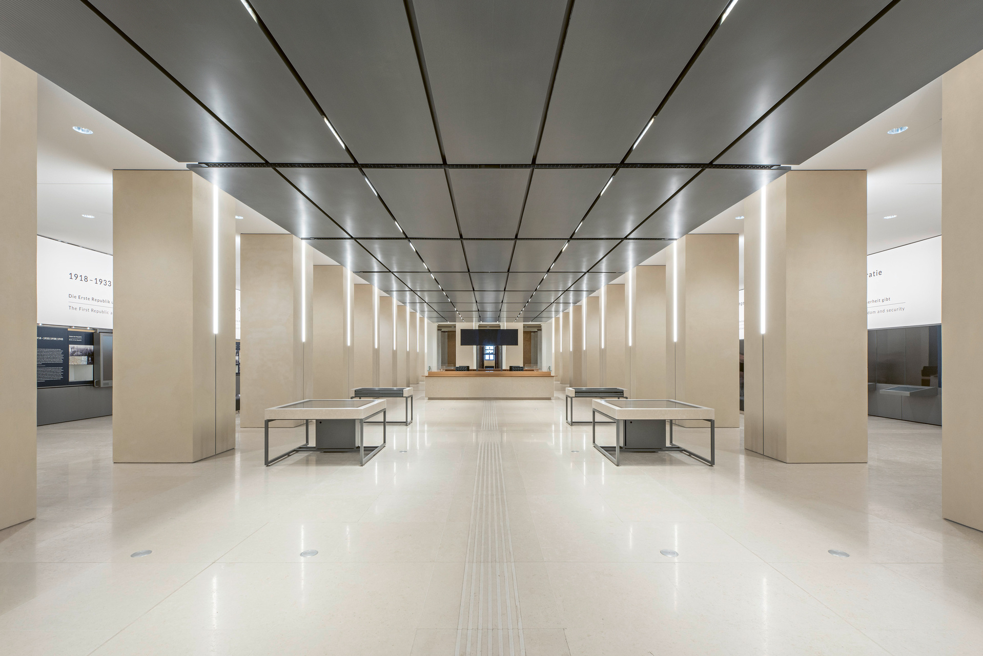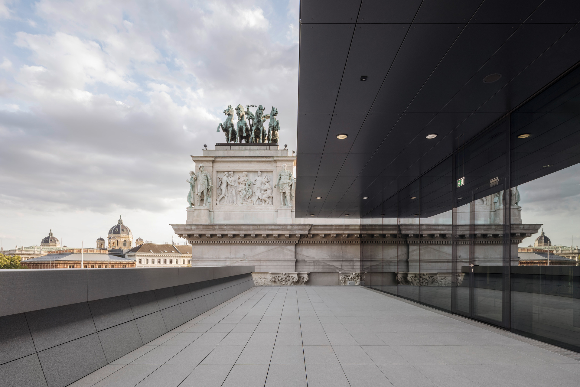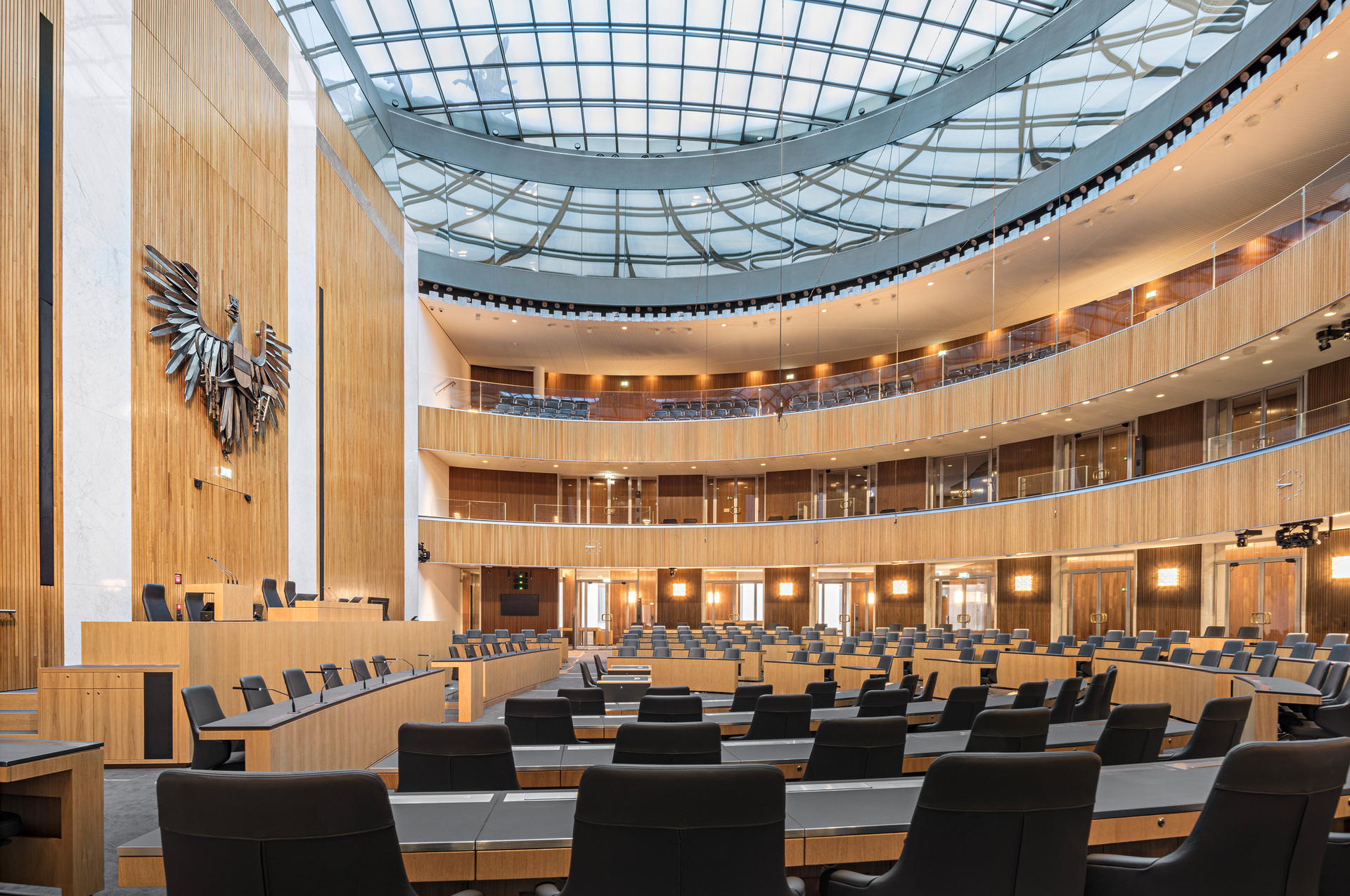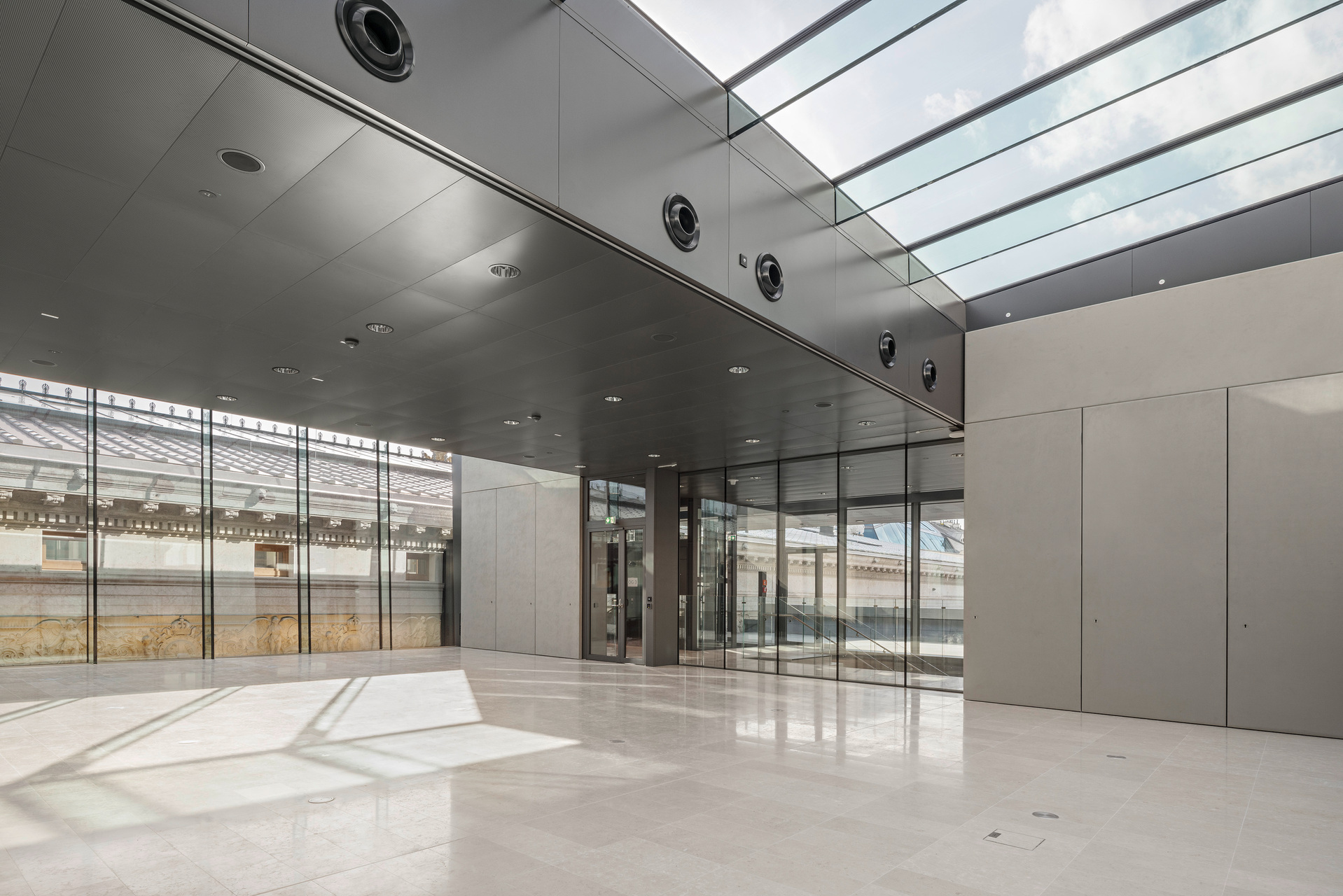 Zusätzliche öffentliche Räume In Erd- und Dachgeschoss erweitern die Möglichkeiten, am parlamentarischen Leben teilzunehmen – in wesentlich größerem Umfang als bisher und für alle Nutzergruppen. Beginnend mit einem Besucherfoyer in ehemaligen Nebenräumen zum Ring hin mit Informationsbereich und angrenzenden Sälen für Wechselausstellungen.