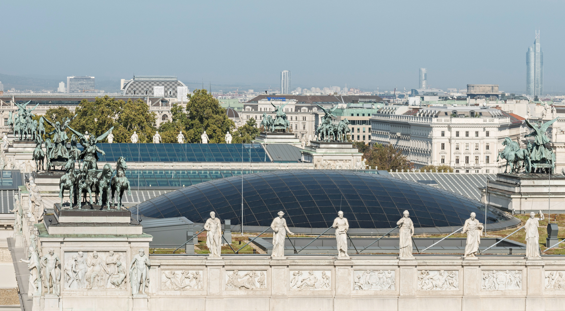 Die neuen Erweiterungsbauten sind so angeordnet, dass sie das historische Erscheinungsbild nicht beeinträchtigen, sondern ergänzen. Die Höhe der vom Stadtraum aus einsehbaren Aufbauten übersteigt an keiner Stelle den Hauptfries des Gebäudes. (Autor: Achim Geissinger, nach einem Text der Architekten)