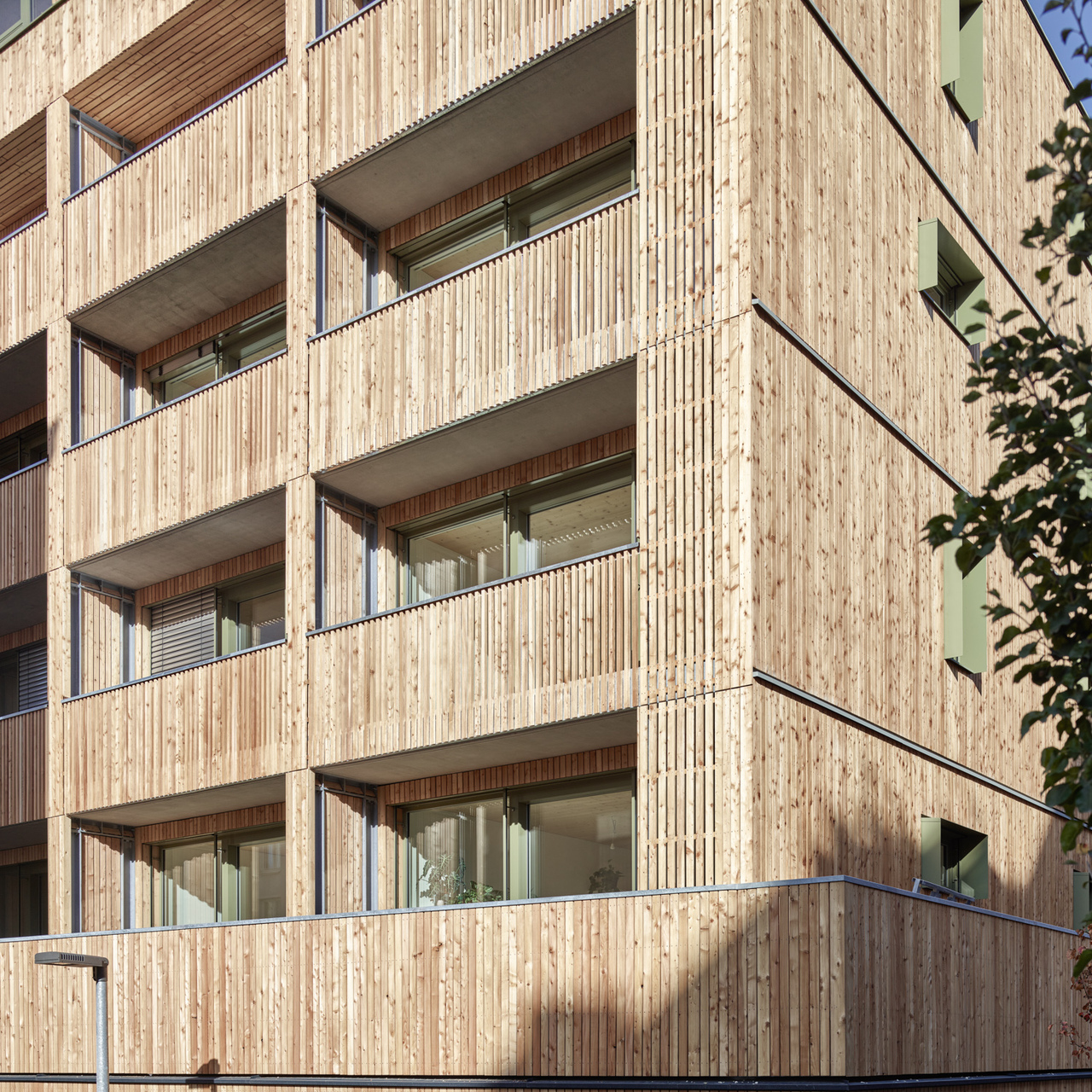 Jedem Holzhaus ist an der einen Längsseite ein Balkongerüst und an der anderen ein Erschließungsgerüst in Form von Laubengängen und einem Liftturm vorgestellt. Der gesamte Baukörper inklusive Betonsockel ist, abgesehen von Erschließungsgerüst, einheitlich mit gehobelten Holzbrettern verkleidet.