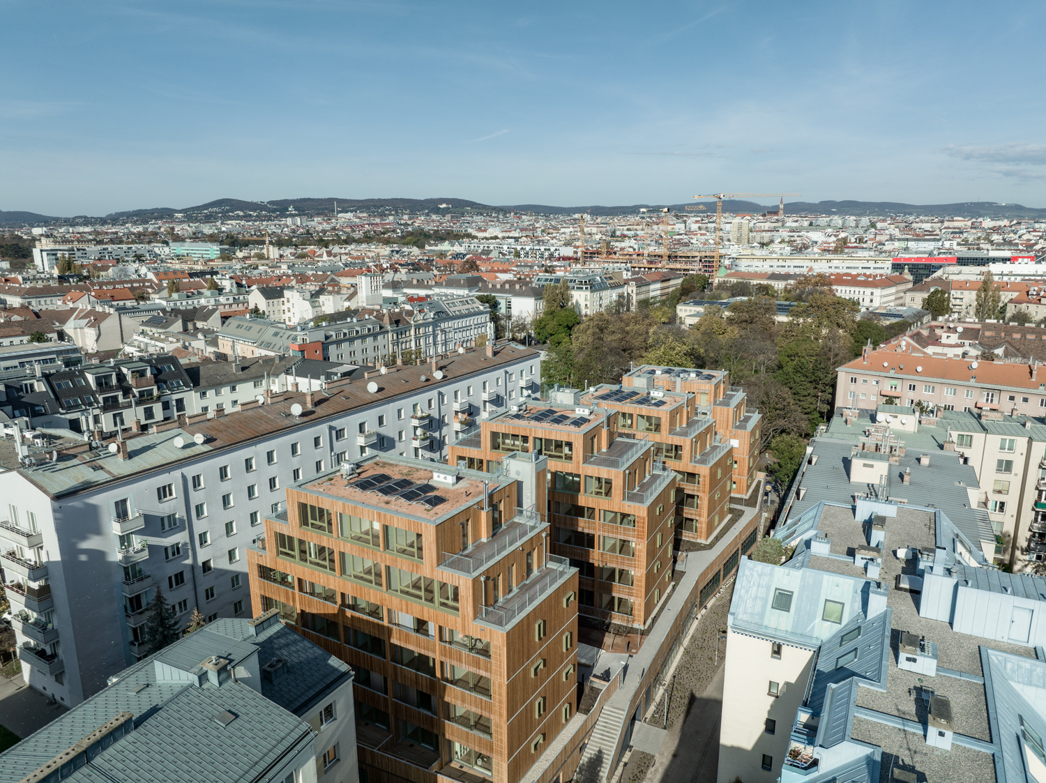 Das Ensemble bildet mit seiner lebendigen Baukörper-Setzung, mit der reichen Begrünung, dem Material Holz sowie der Durchwegung einen neuen Identifikationsort für die Umgebung. (Text: Maria Welzig)