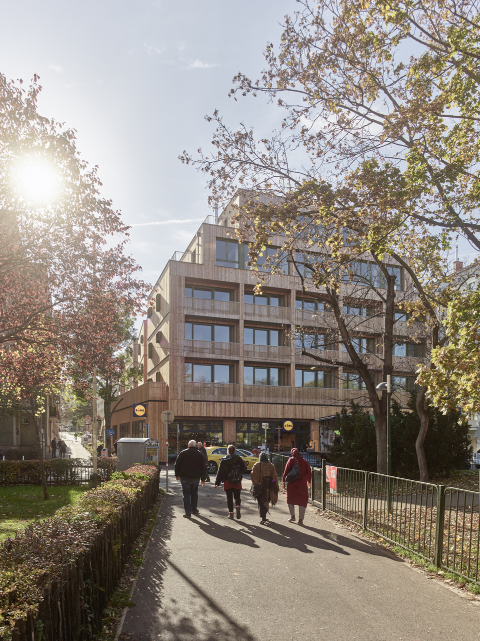 Anstelle von Supermarkt und Parkplatz errichteten Freimüller Söllinger einen Sockelbau und auf diesem, quergestellt zur umgebenden Wohnbebauung, vier locker gesetzte fünf- bzw. sechsgeschossige Wohnhäuser. Die Querstellung der Wohnhäuser ermöglicht vielfältige Durchblicke und freie Sichtachsen für die angrenzenden Wohnbauten aus den 1950er bis 1980er Jahren. Der Sockel, der den Supermarkt und Gemeinschaftseinrichtungen der Wohnanlage aufnimmt, ist zum neuen Durchgangsweg hin als bewegter Körper ausgeformt. Die vier Wohnhäuser sind leicht gegeneinander verschwenkt. Ein urbanistisches Konzept, das Lebendigkeit in den Stadtraum bringt.