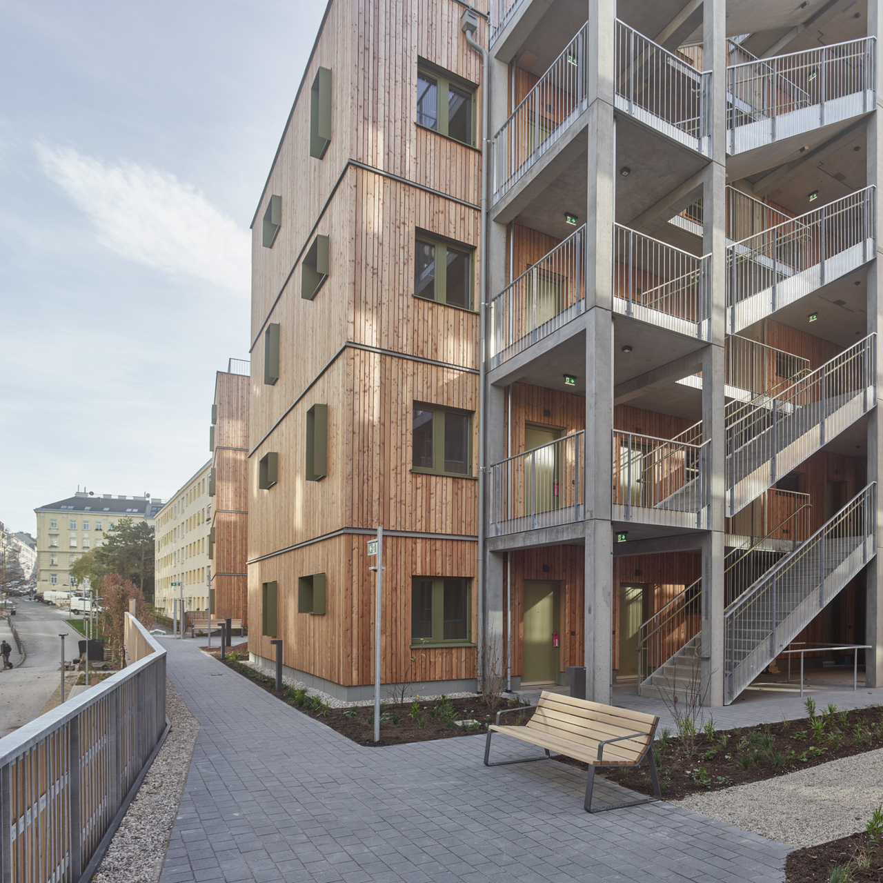 An der Kreuzung zur Bonygasse weitet sich der Geschwister Spitzer Weg zu einem Platz. Eine Freitreppe führt hier auf das Wohnplateau und ebenerdige Zugänge erschließen Gemeinschaftsräume und die Fahrradgarage. Die Geländeneigung von der Bonygasse zur Tivoligasse nahmen die Architekt:innen als gestalterisches Element auf.