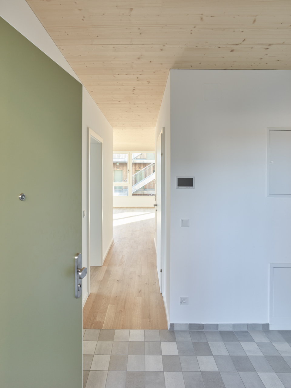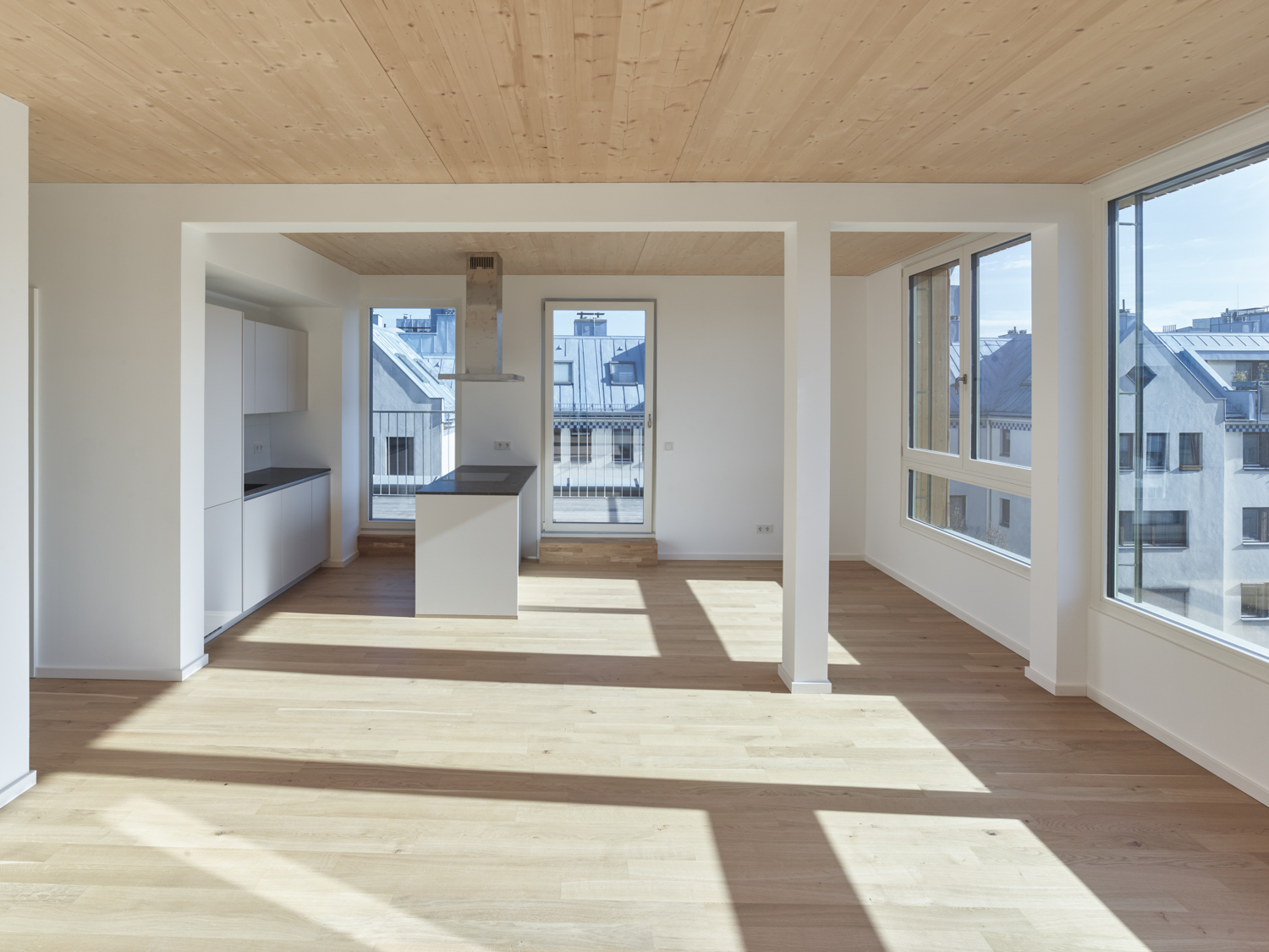 Eine weitere Projekt-Innovation ist die Konstruktion der Wohnbauten aus Holz. Die konstruktiven Teile bestehen aus Brettsperrholz und wurden als Fertigteile von der Firma Theurl aus Osttirol geliefert. Um Material zu sparen nehmen die Deckenstärken, genau den statischen Anforderungen entsprechend, nach oben hin ab. Die Decken sind aus Sichtholz. Brand- und Schallschutz stellten hohe Anforderungen, die es protoypisch zu lösen galt.