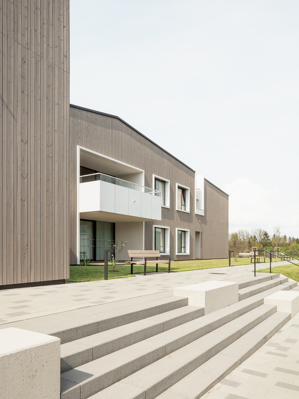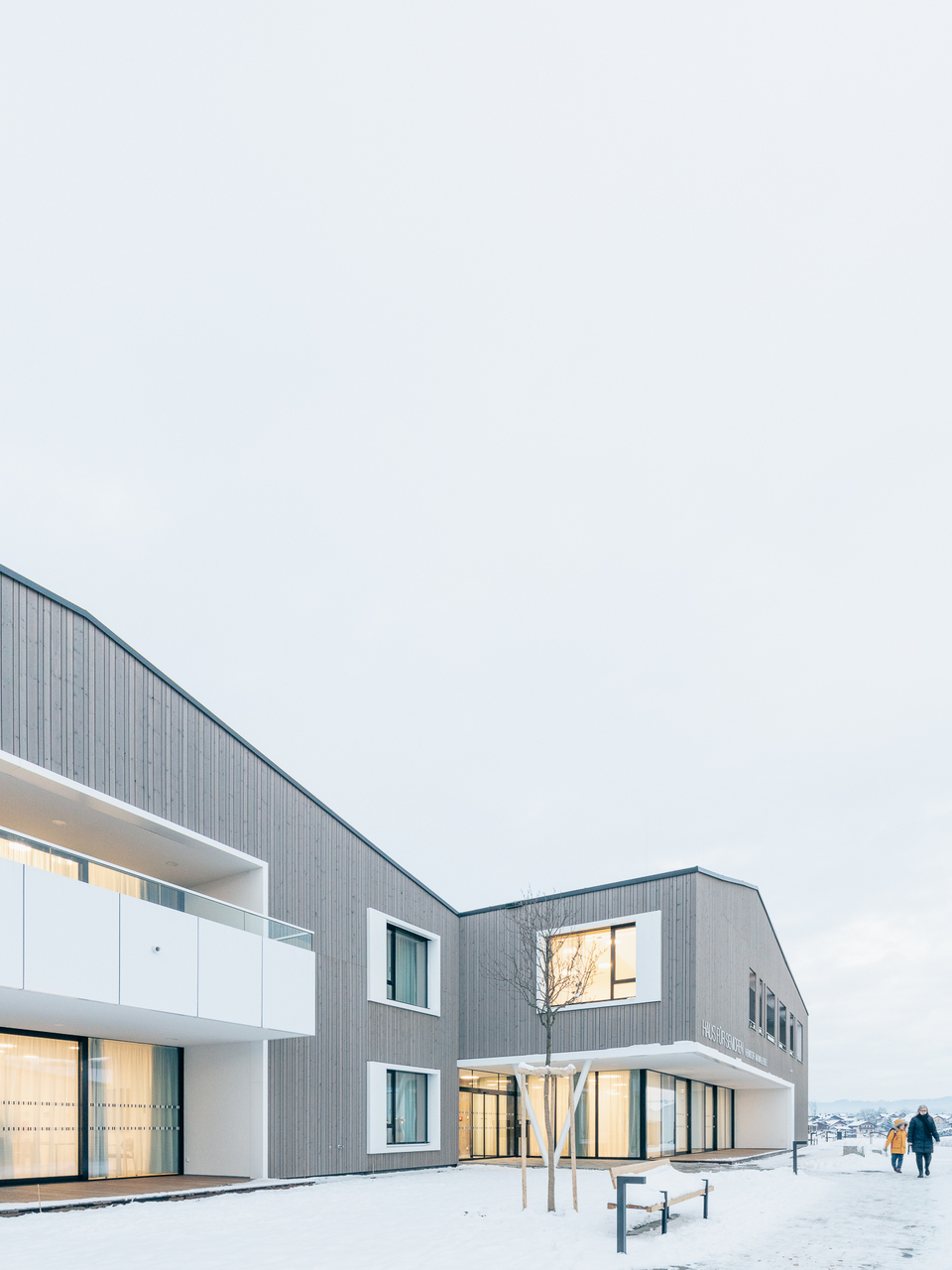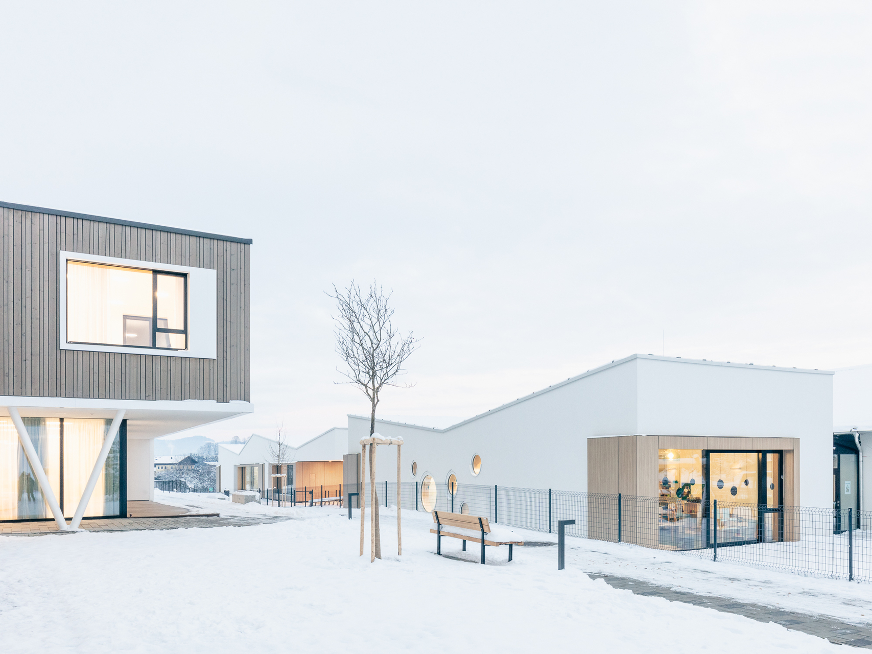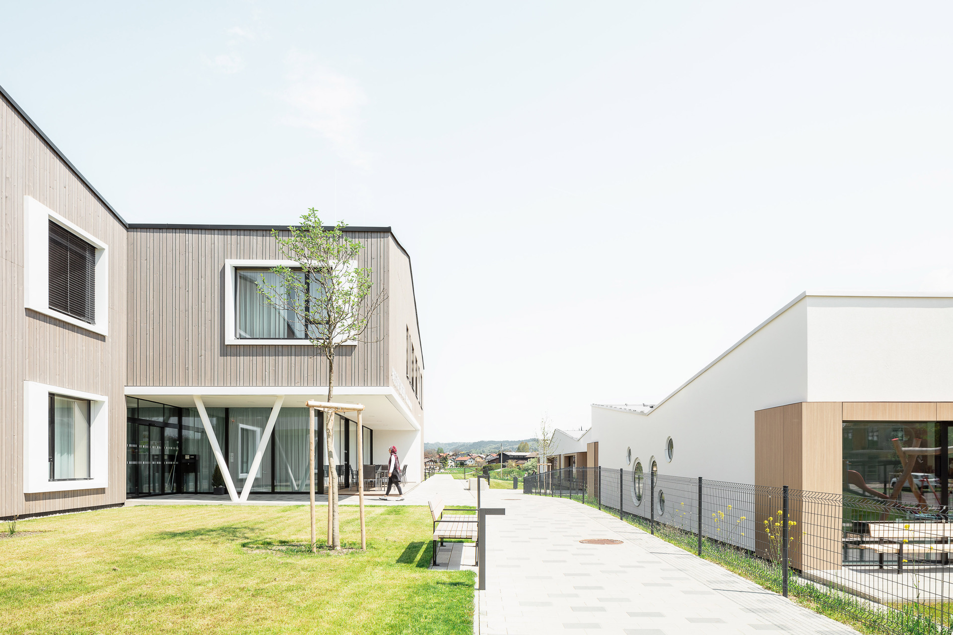 Im Erscheinungsbild sind das Kinder- und das Altenhaus klar voneinander geschieden. Während ersteres mit eine weiße Putzfassade, in der Rundfenster wie aufsteigende Seifenblasen spielerisch eingefügt sind, besitzt, verkleidet den Seniorentrakt eine vertikale Holzschalung. (Text: Roman Höllbacher nach einem Text der Architekten)