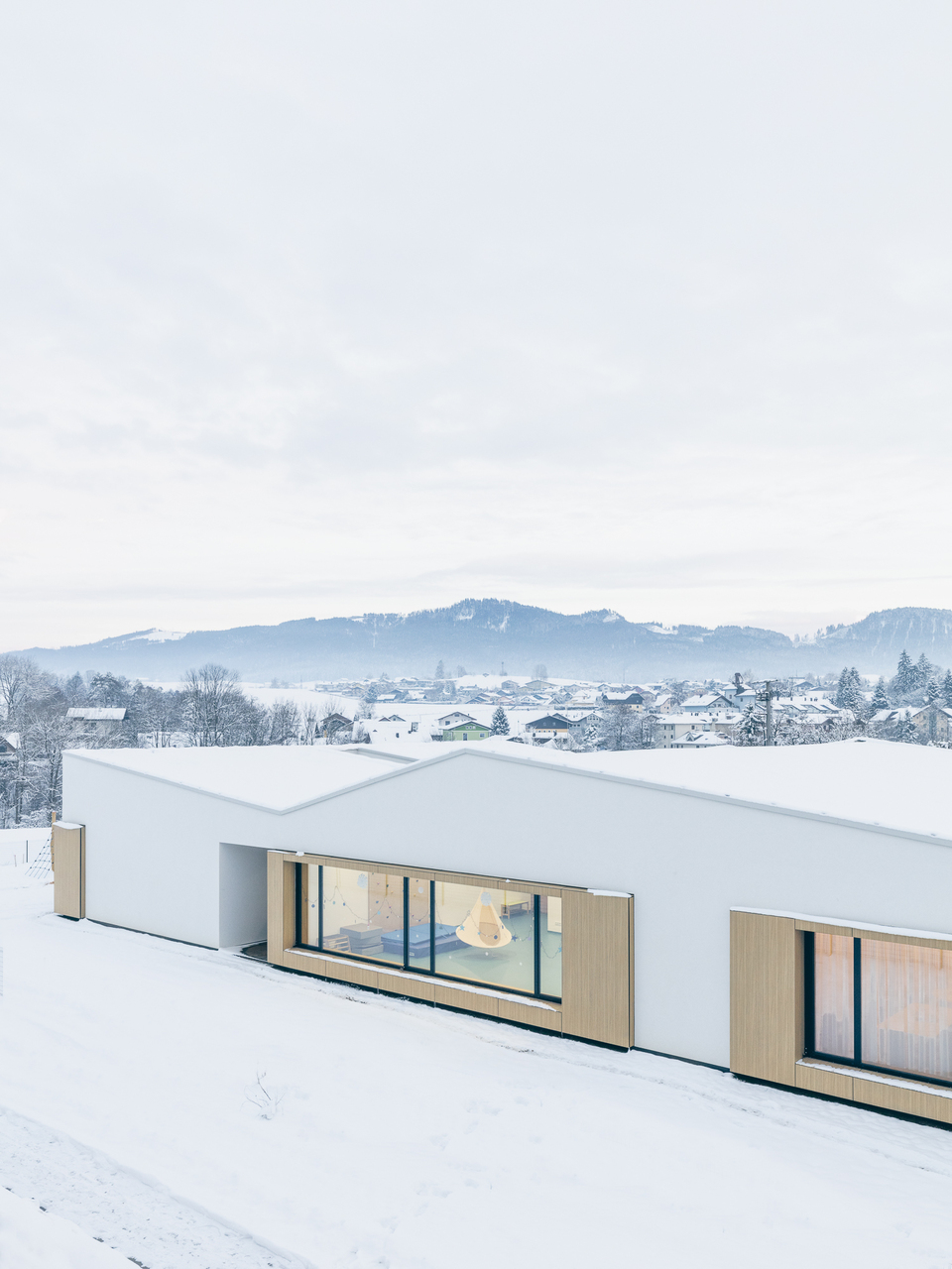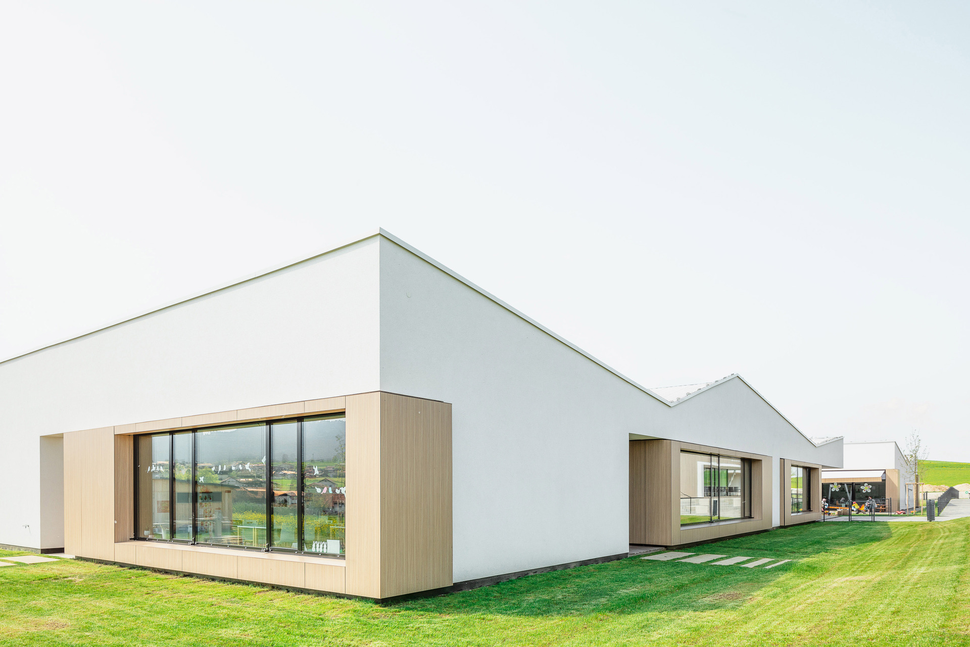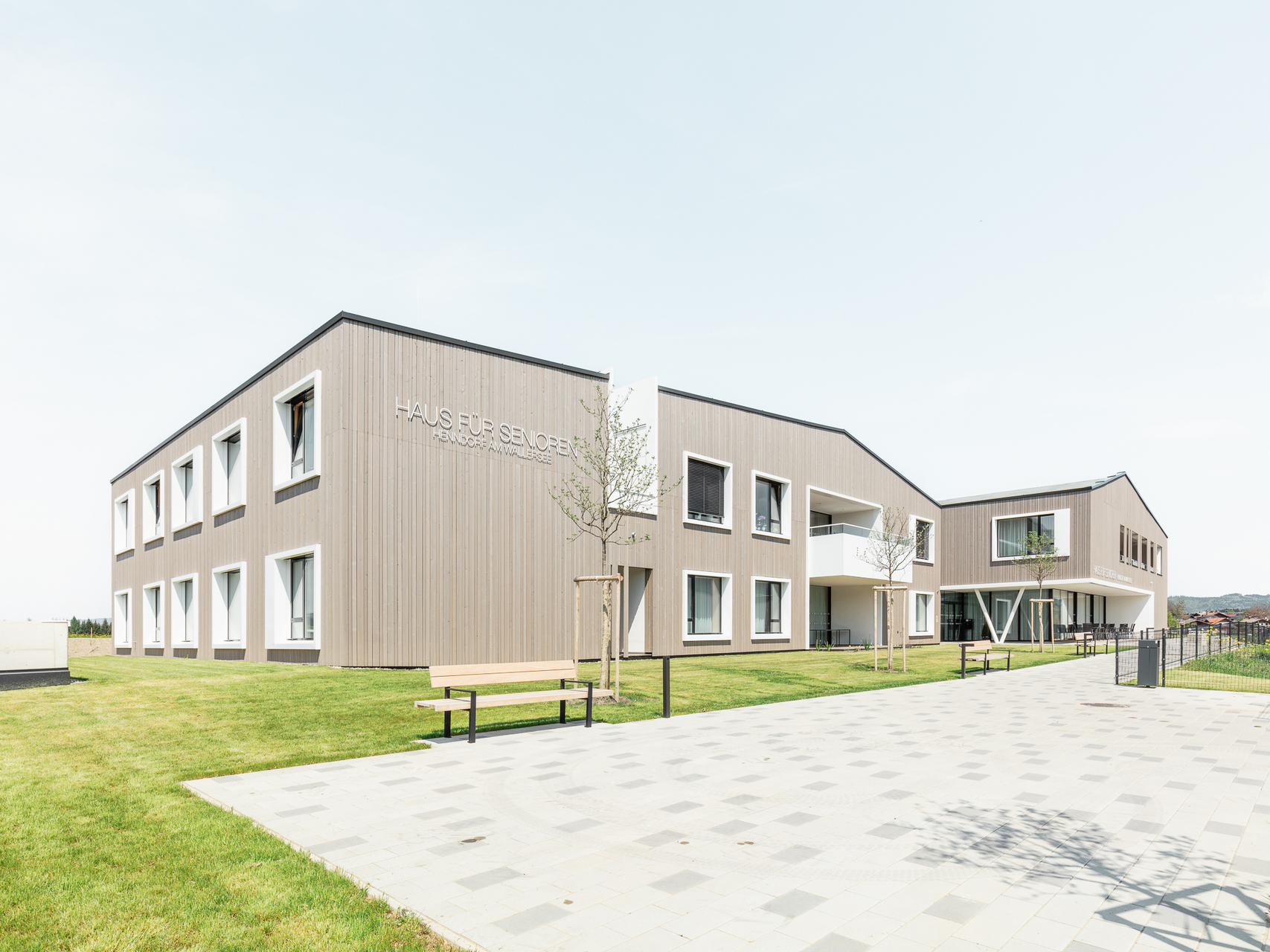 Im Erscheinungsbild sind das Kinder- und das Altenhaus klar voneinander geschieden. Während ersteres mit eine weiße Putzfassade, in der Rundfenster wie aufsteigende Seifenblasen spielerisch eingefügt sind, besitzt, verkleidet den Seniorentrakt eine vertikale Holzschalung. (Text: Roman Höllbacher nach einem Text der Architekten)