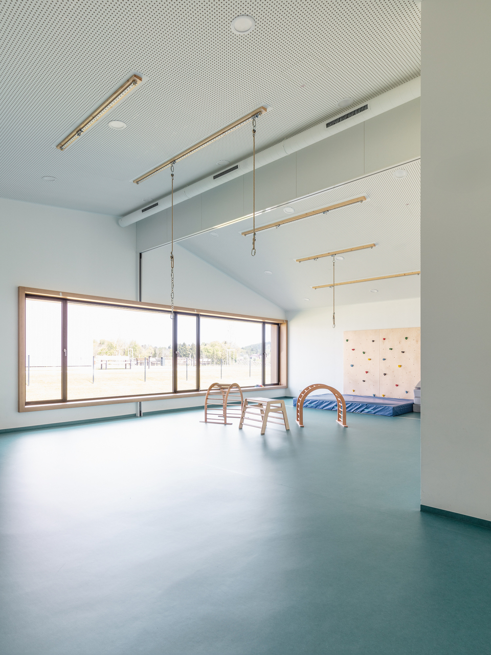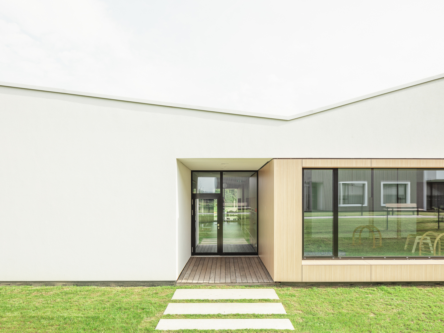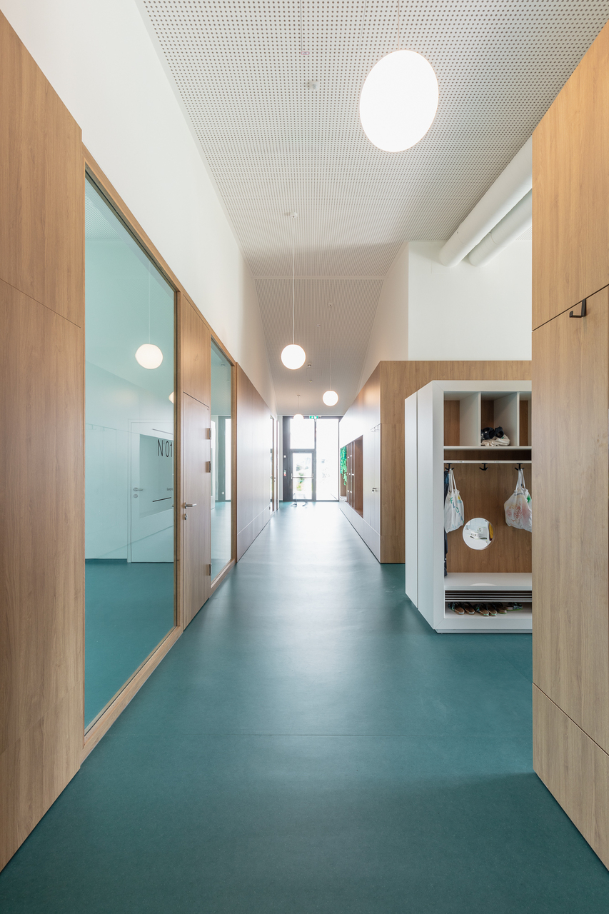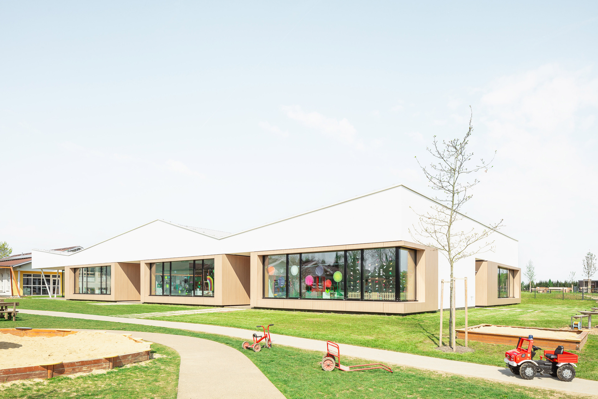 Im Erscheinungsbild sind das Kinder- und das Altenhaus klar voneinander geschieden. Während ersteres mit eine weiße Putzfassade, in der Rundfenster wie aufsteigende Seifenblasen spielerisch eingefügt sind, besitzt, verkleidet den Seniorentrakt eine vertikale Holzschalung. (Text: Roman Höllbacher nach einem Text der Architekten)