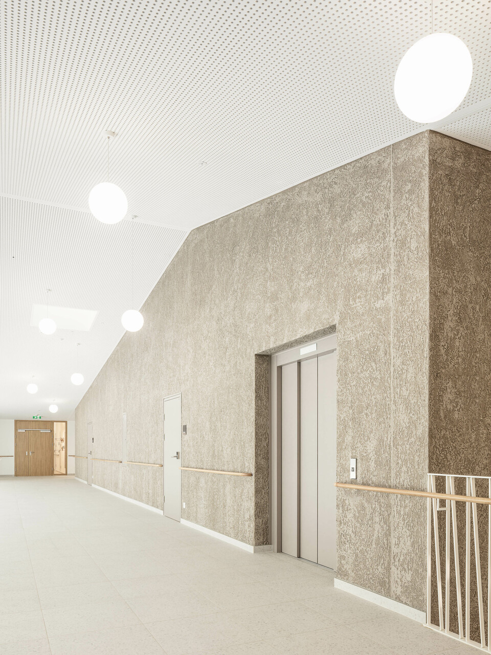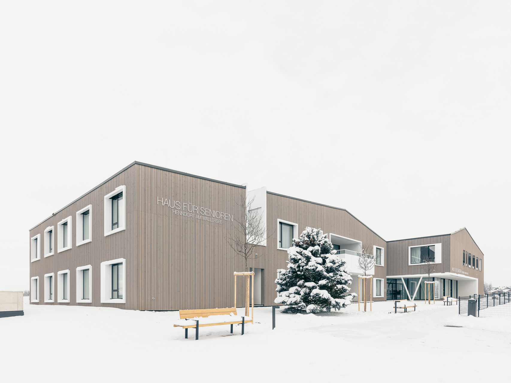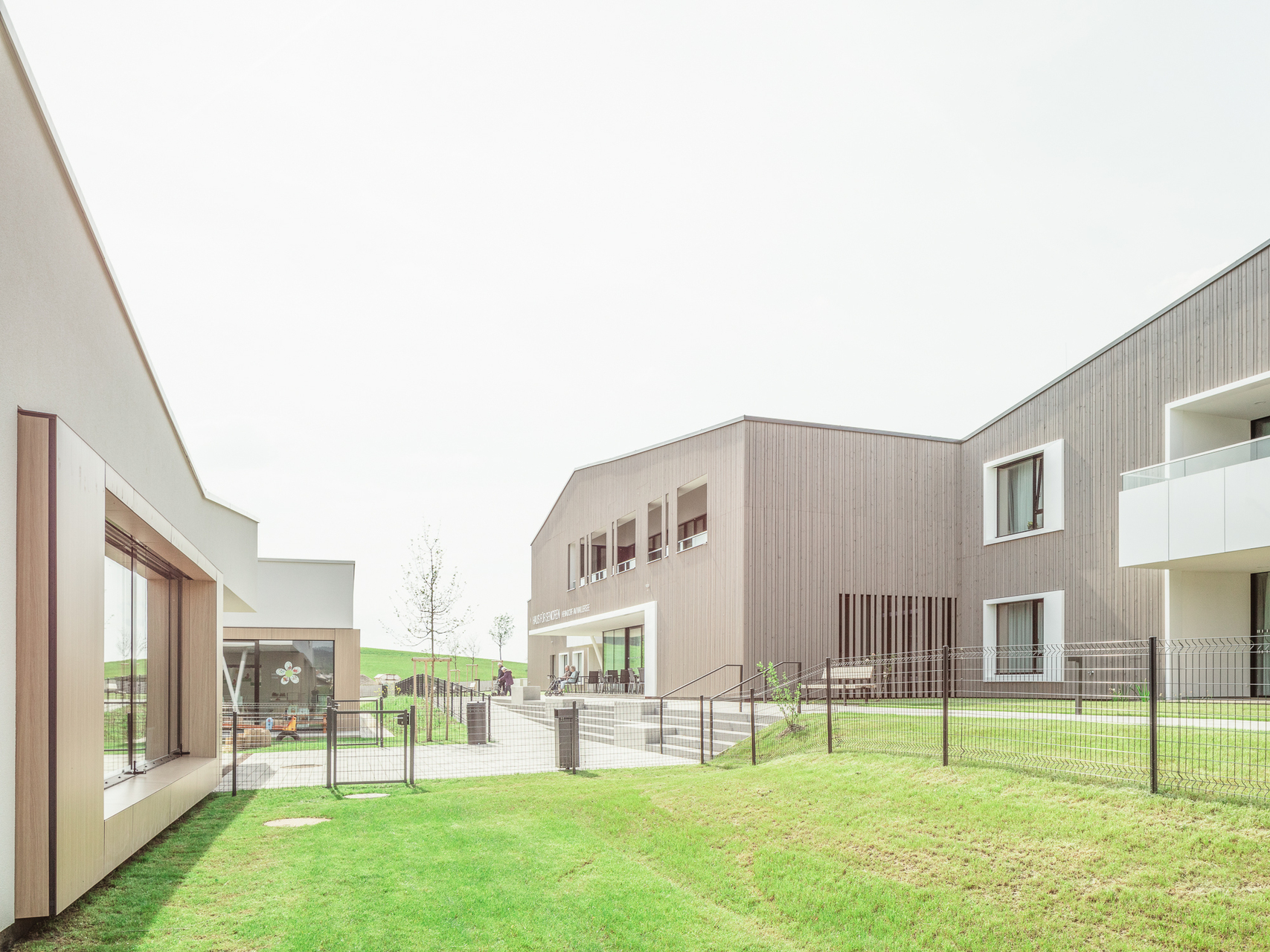 Das Senior:innenwohnheim besteht aus drei miteinander verbundenen, zweigeschossigen Baukörpern, die durch ihre Gliederung optimale Belichtungsverhältnisse besitzen. Im mittleren Bauteil des Seniorenhauses befinden sich im Erdgeschoss neben dem Foyer, den zentralen Versorgungseinrichtungen und einem Andachtsraum auch die gemeinschaftlichen Funktionen des Wohnheims. Im Obergeschoss liegen die Räumlichkeiten für die Verwaltung. Die beiden äußeren Baukörper beherbergen pro Geschoss jeweils eine Hausgemeinschaft. Die Freiräume sind in öffentliche, halböffentliche und private Bereiche zoniert. Es gibt eigene Wege für demente Bewohner:innen, aber auch Gemeinschaftsgärten mit Hochbeeten, Obstbäumen sowie private Freiflächen, die Wohnräumen zugeordnet sind. Großer Wert wurde sowohl auf die Sichtbeziehungen im Haus auch auf jene die Umgebung gelegt. Von den privaten Zimmern, den gemeinschaftlichen Innenräumen und den gedeckten Freibereichen eröffnen sich die Blicke ins Freie und zwar auch dann, wenn man nur mehr eingeschränkt mobil ist. Die Kinderbetreuungseinrichtungen und die Krabbelgruppe sind zum Garten hin orientiert und lassen durch die große Verglasung das Äußere mit dem Inneren verschmelzen. Die Gangbereiche sind in Sitznischen und Spielecken aufgelöst und schaffen zusätzliche Aufenthalts- und Spielzonen.
