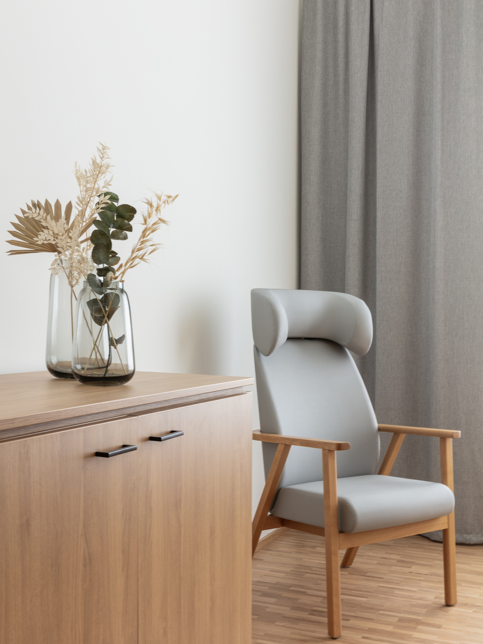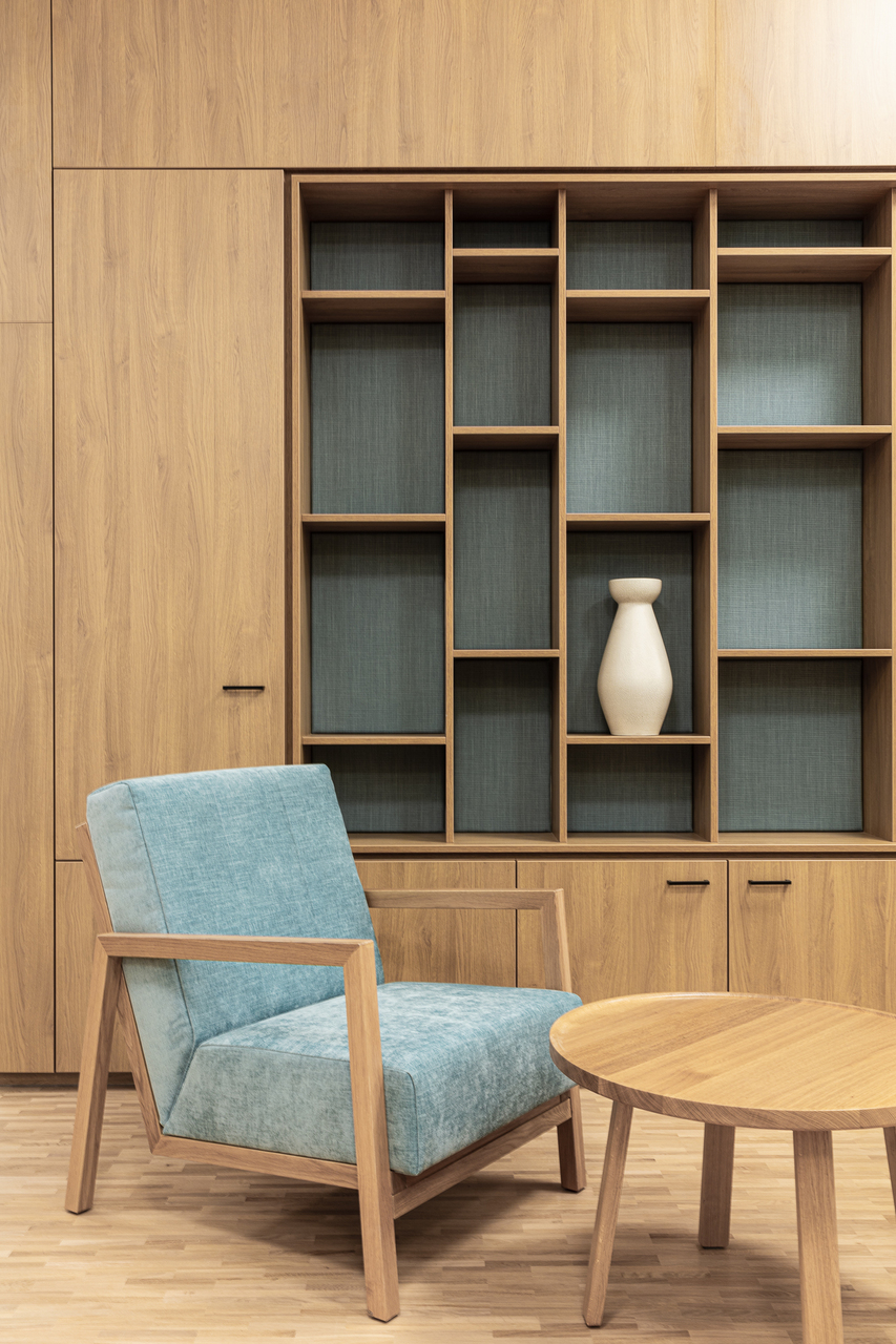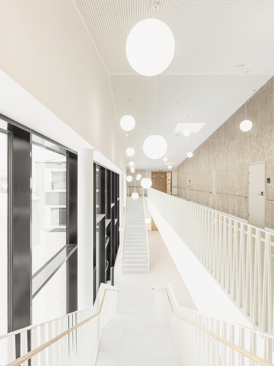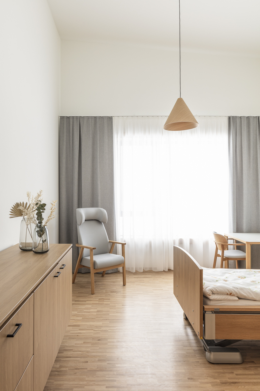 Das Senior:innenwohnheim besteht aus drei miteinander verbundenen, zweigeschossigen Baukörpern, die durch ihre Gliederung optimale Belichtungsverhältnisse besitzen. Im mittleren Bauteil des Seniorenhauses befinden sich im Erdgeschoss neben dem Foyer, den zentralen Versorgungseinrichtungen und einem Andachtsraum auch die gemeinschaftlichen Funktionen des Wohnheims. Im Obergeschoss liegen die Räumlichkeiten für die Verwaltung. Die beiden äußeren Baukörper beherbergen pro Geschoss jeweils eine Hausgemeinschaft. Die Freiräume sind in öffentliche, halböffentliche und private Bereiche zoniert. Es gibt eigene Wege für demente Bewohner:innen, aber auch Gemeinschaftsgärten mit Hochbeeten, Obstbäumen sowie private Freiflächen, die Wohnräumen zugeordnet sind. Großer Wert wurde sowohl auf die Sichtbeziehungen im Haus auch auf jene die Umgebung gelegt. Von den privaten Zimmern, den gemeinschaftlichen Innenräumen und den gedeckten Freibereichen eröffnen sich die Blicke ins Freie und zwar auch dann, wenn man nur mehr eingeschränkt mobil ist. Die Kinderbetreuungseinrichtungen und die Krabbelgruppe sind zum Garten hin orientiert und lassen durch die große Verglasung das Äußere mit dem Inneren verschmelzen. Die Gangbereiche sind in Sitznischen und Spielecken aufgelöst und schaffen zusätzliche Aufenthalts- und Spielzonen.