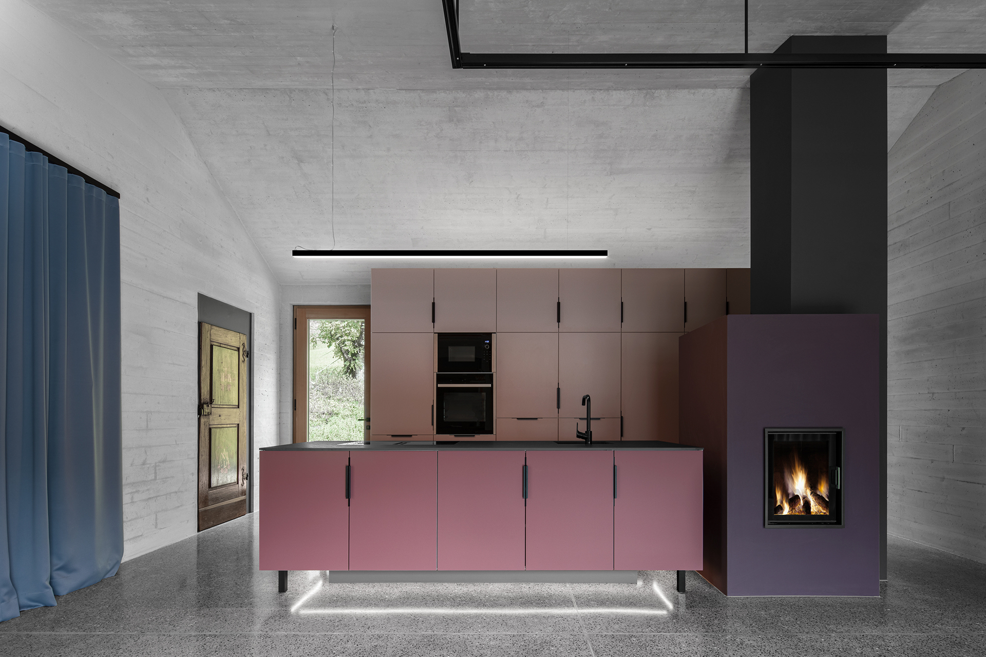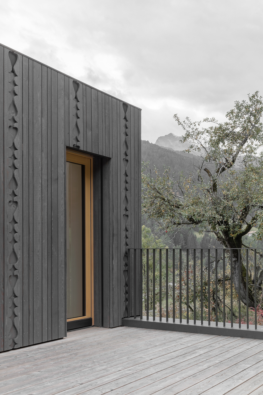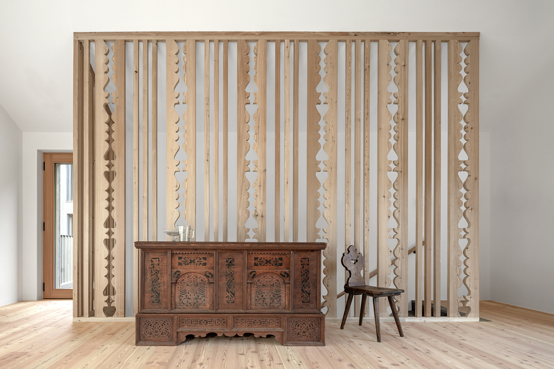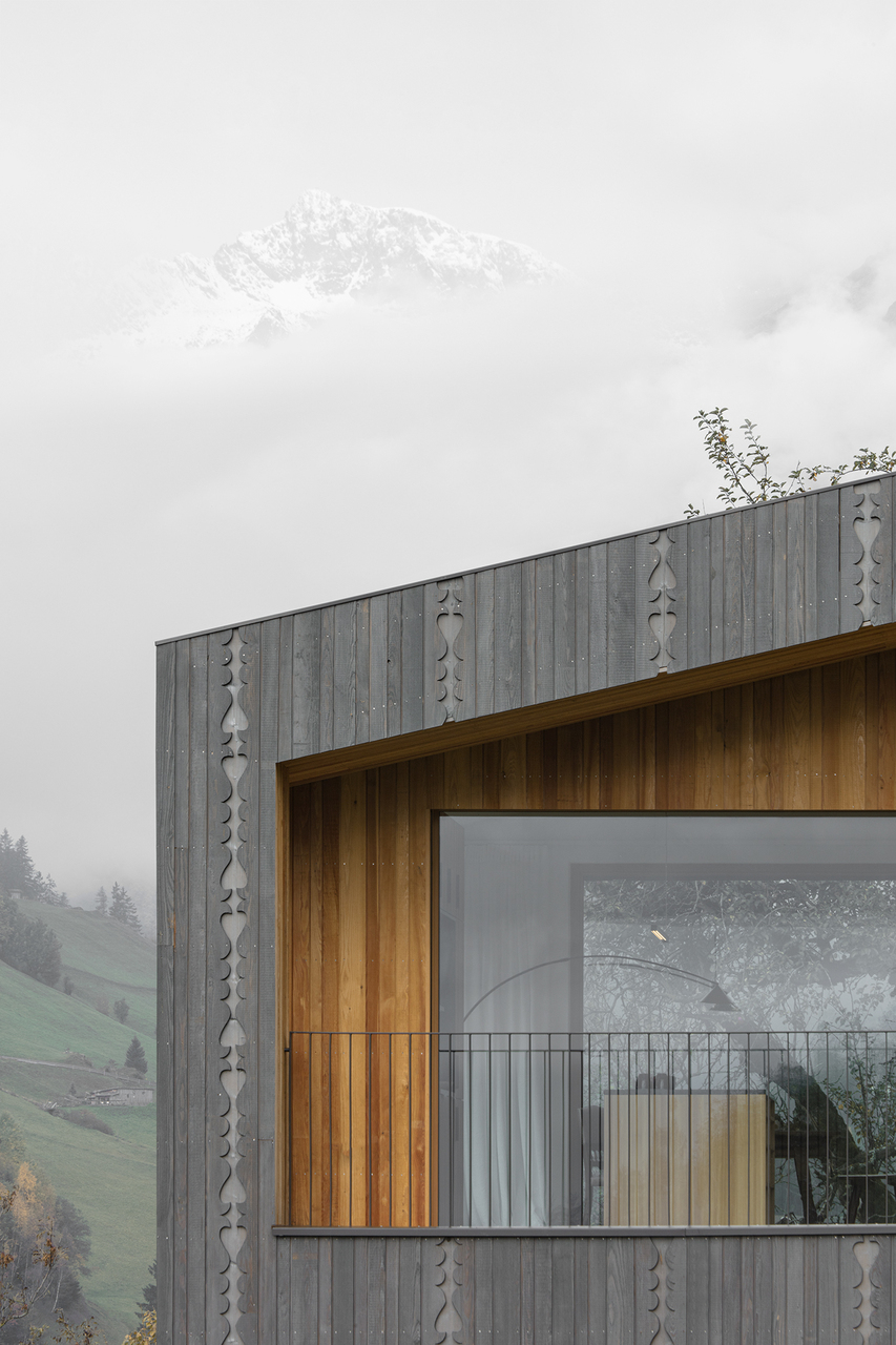 So harmonisch sich beide Gebäude von außen über die einheitliche Gestaltung mit dunkel lasierter Lärchen-Holz-Bekleidung und durch naturbelassenes Lärchenholz hell kontrastierenden Loggien präsentieren, so unterschiedlich zeigen sie sich im Innern: Der tiefer liegende Baukörper zeigt einen modern interpretierten alpinen Stil mit eher traditioneller Material- und Farbpalette, vorwiegend mit Lärche, lokalem Naturstein und Leinenstoff. Der obere Baukörper entwickelt im Innern indes aus brettgeschaltem Sichtbeton und farbigen Dekorplatten ein städtisch wirkendes Gegenbild zur bäuerlichen Stube.