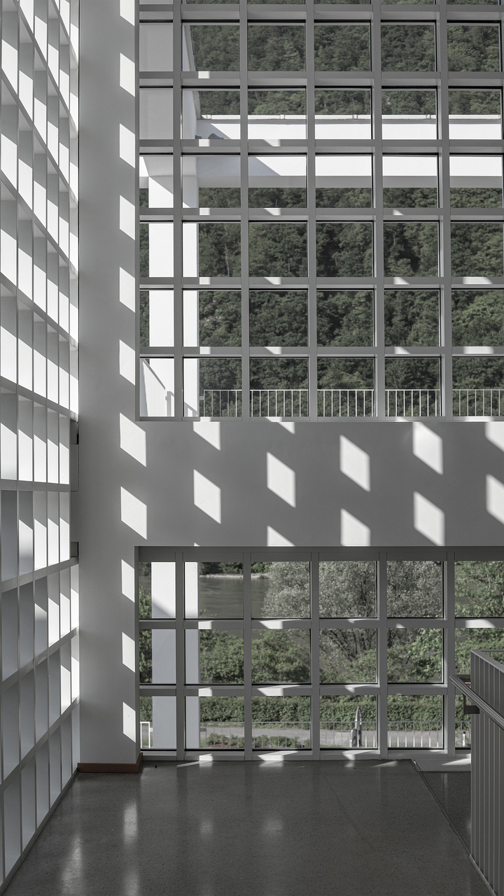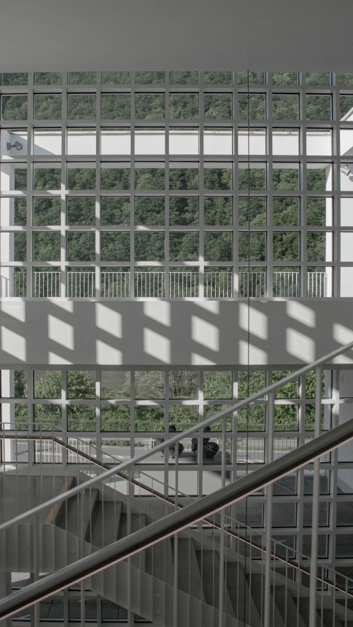 Das Gebäude ist streng nach diesem Raster aufgebaut, das somit insgesamt auf der Zahl 9 beruht. Die Neun ist in der Chinesischen Numerologie von sehr hoher Bedeutung und steht für Vollendung, Ruhm und Anerkennung. Jeder Grundriss und jede Ansicht besteht aus diesem Raster, von dem jedes Feld 9 x 9 m misst. Die einzelnen Rasterfelder wurden durch die Teilungen der Glasfassaden wiederum in neun Teile geteilt. Die Zahlensymbolik zieht sich durch bis hin zur Geländerkonstruktion der Treppe. (Text: Architekten, bearbeitet)