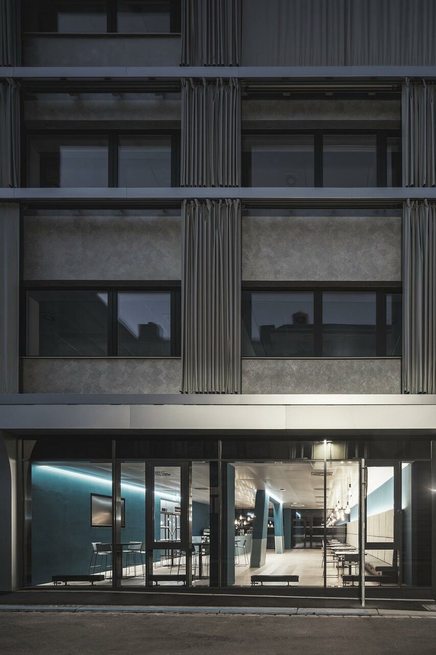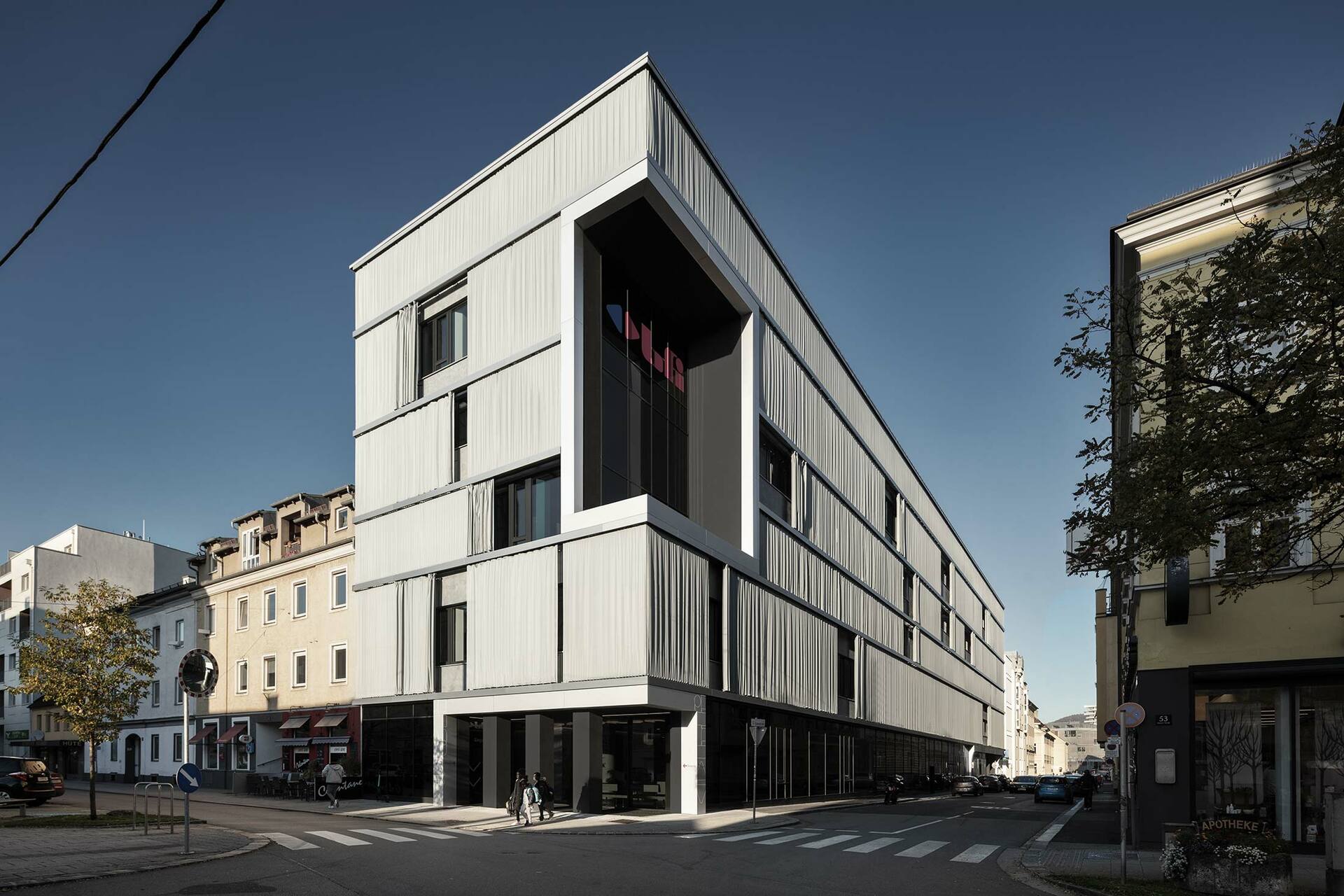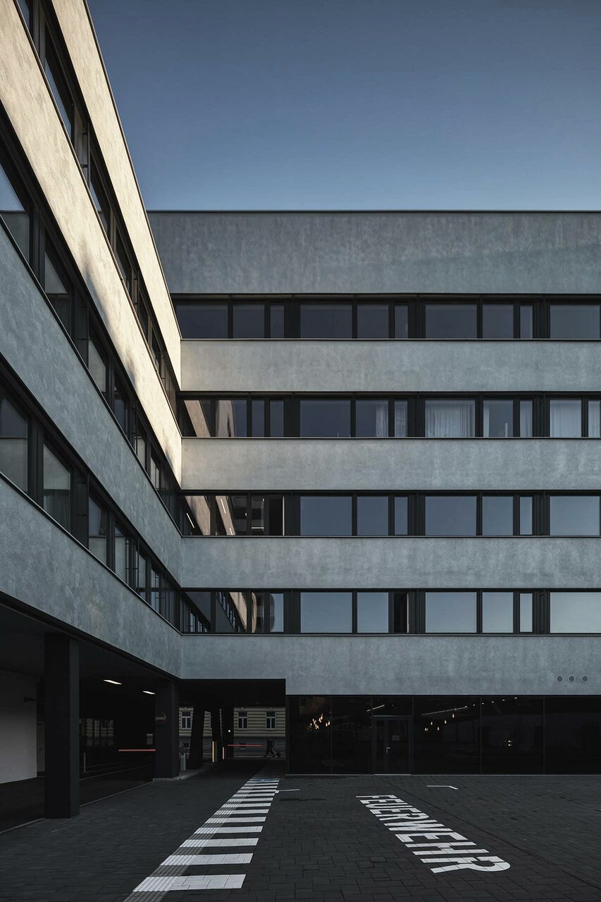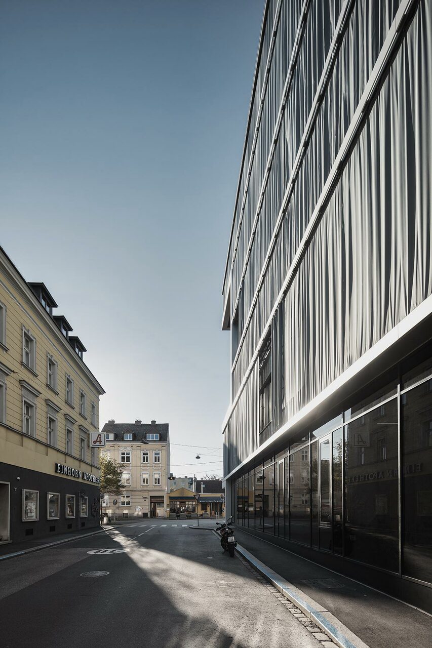 Vorhänge kleiden das neue BFI ein. Sie sind mehr als nur Beschattung der Fensterbänder. Sie verleihen dem Haus einen unverwechselbaren und lebendigen Auftritt, nehmen der langen Fassade Monotonie und Härte. Als weiche Hülle, die sich im Wind bewegt und je nach Bedarf auf- oder zugezogen werden kann, tragen sie den Inhalt des Gebäudes nach außen. Drei von Aluminiumbändern gerahmte Öffnungen durchbrechen die spielerische Anmutung, mit eindeutigen Botschaften für die Besucher:innen des Hauses: Sie zeigen den Haupteingang ins Foyer an der Wiener Straße an, darüber eine Loggia über drei Etagen an der Straßenecke, dahinter die Cafeteria der Verwaltung; am anderen Ende führt ein Durchgang in den begrünten Innenhof, flankiert vom Bistro, das sich Straße und Hof zuwendet.
