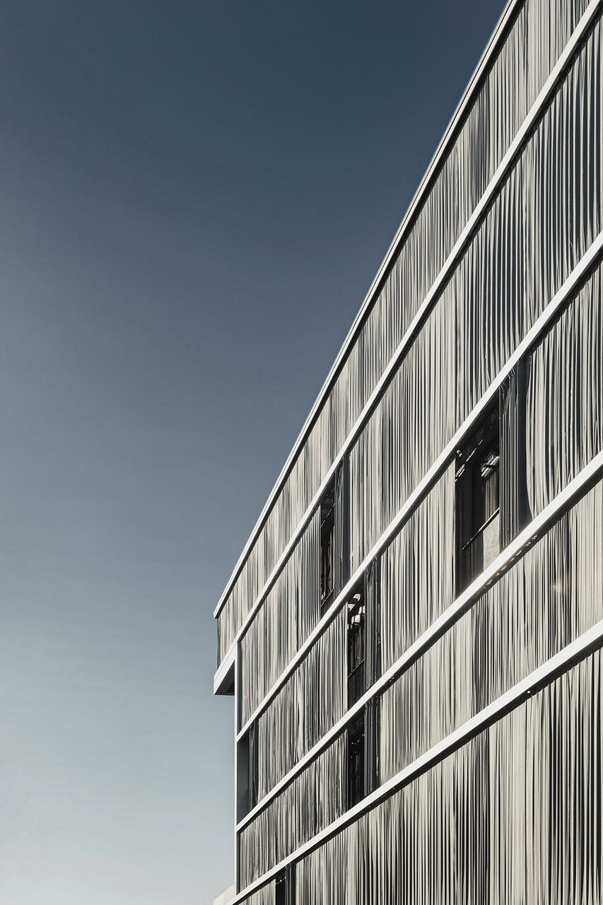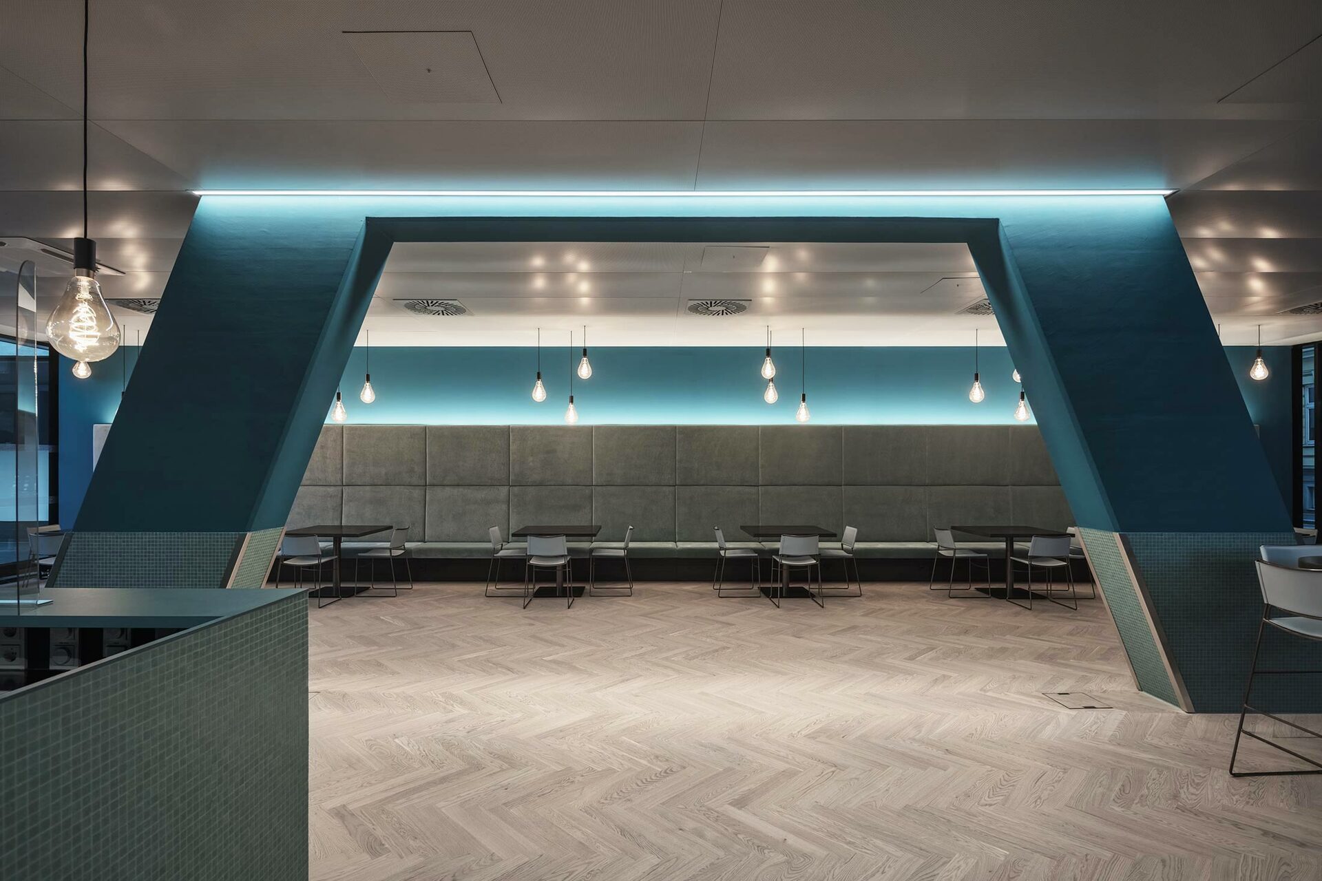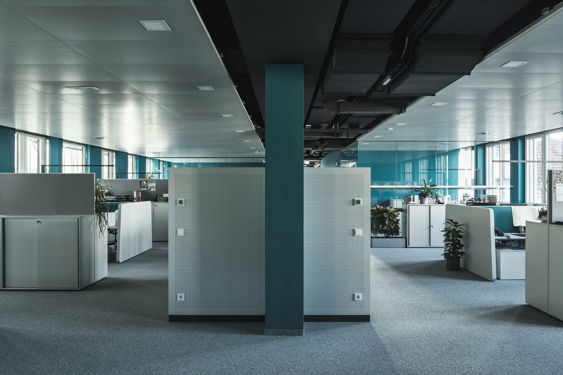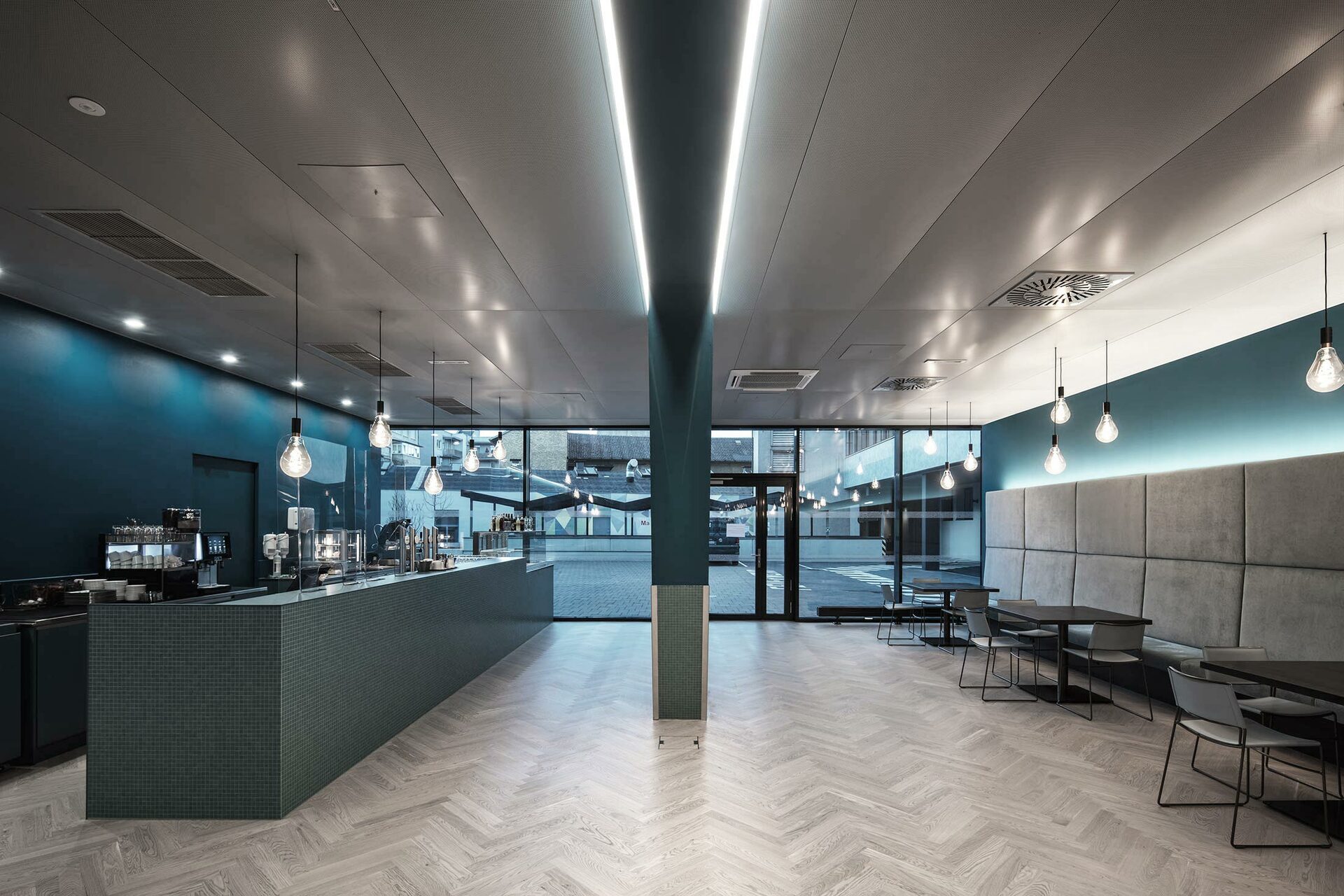 Vorhänge kleiden das neue BFI ein. Sie sind mehr als nur Beschattung der Fensterbänder. Sie verleihen dem Haus einen unverwechselbaren und lebendigen Auftritt, nehmen der langen Fassade Monotonie und Härte. Als weiche Hülle, die sich im Wind bewegt und je nach Bedarf auf- oder zugezogen werden kann, tragen sie den Inhalt des Gebäudes nach außen. Drei von Aluminiumbändern gerahmte Öffnungen durchbrechen die spielerische Anmutung, mit eindeutigen Botschaften für die Besucher:innen des Hauses: Sie zeigen den Haupteingang ins Foyer an der Wiener Straße an, darüber eine Loggia über drei Etagen an der Straßenecke, dahinter die Cafeteria der Verwaltung; am anderen Ende führt ein Durchgang in den begrünten Innenhof, flankiert vom Bistro, das sich Straße und Hof zuwendet.