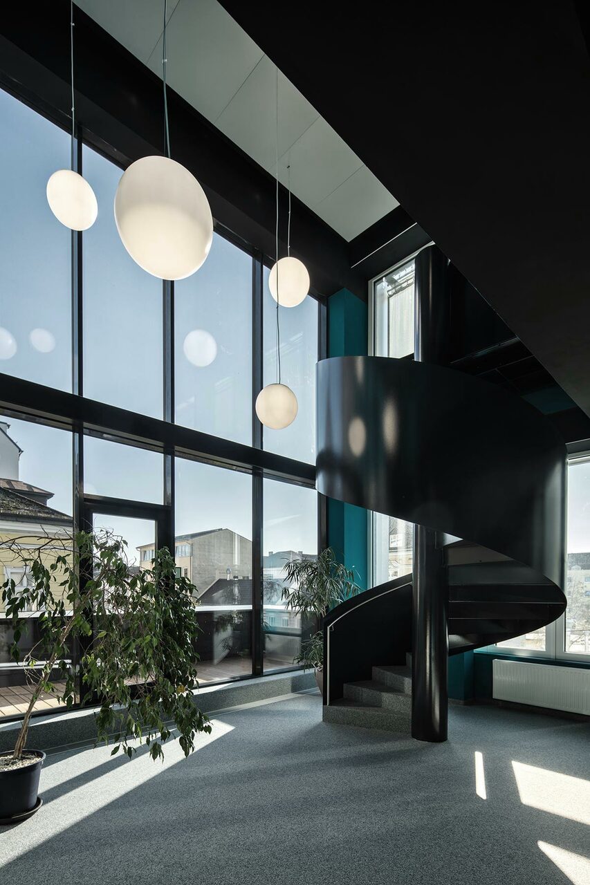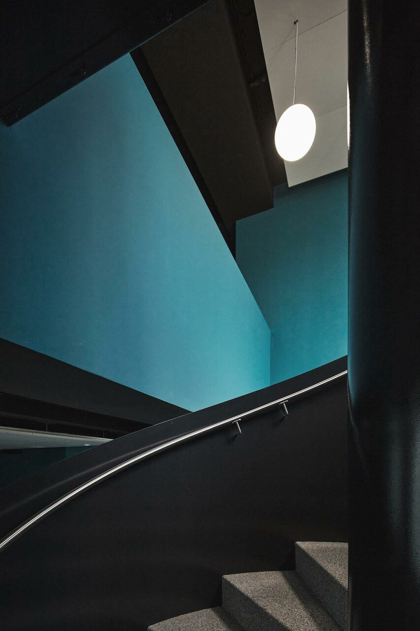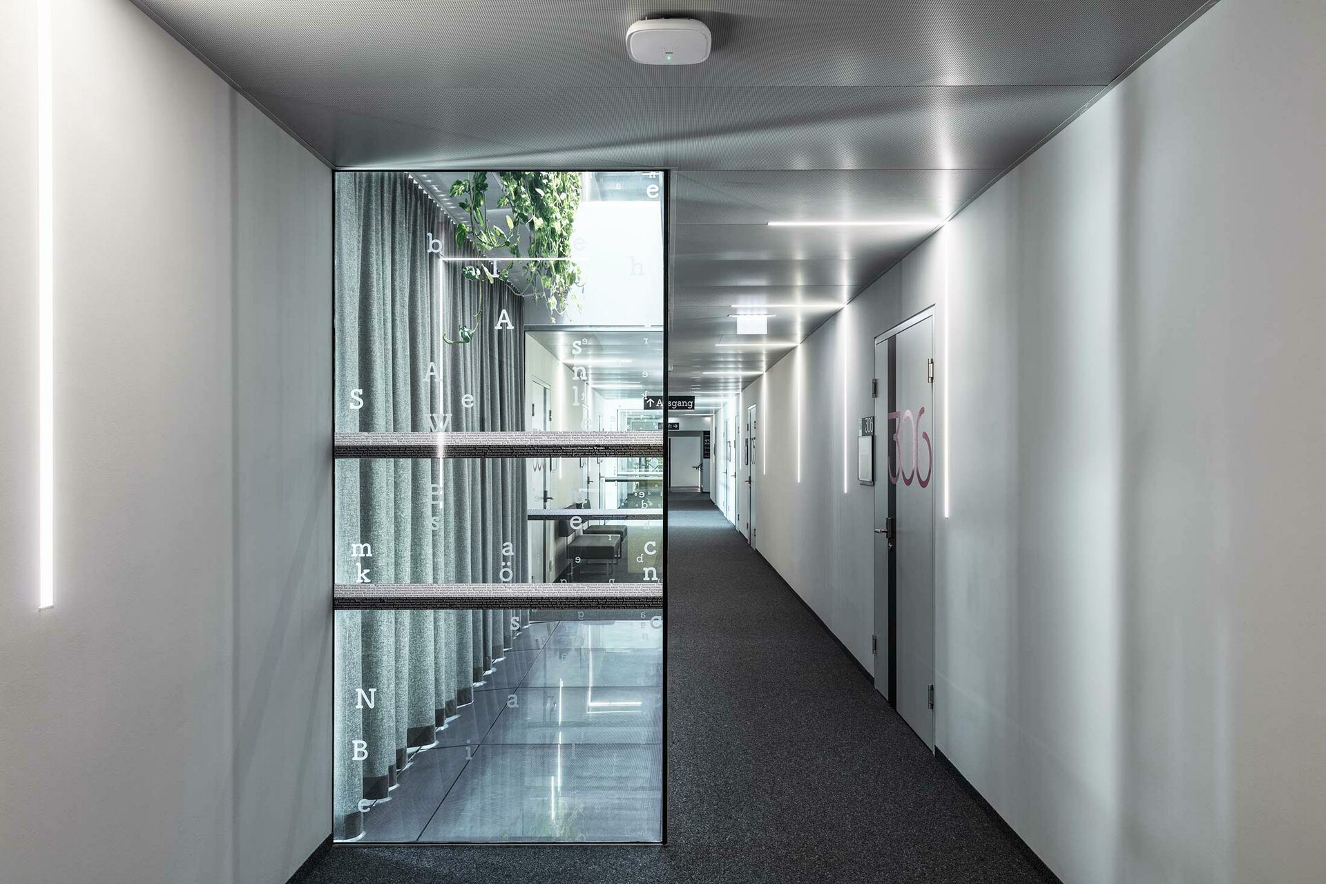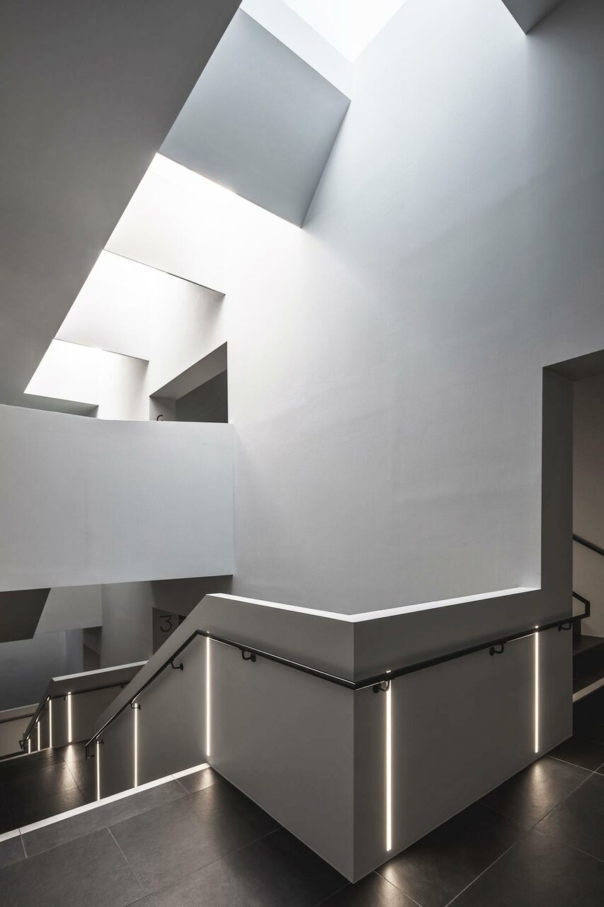 Ein Scherentreppenhaus wird zum Erlebnisraum in der Mitte des Hauses. Eine Vielzahl von Lufträumen führt Tageslicht zwischen den beiden gegenläufigen Stiegenanlagen bis ins Erdgeschoss. Sie vermitteln – ebenso wie die Patios im Mittelgang – zwischen den Etagen und rhythmisieren die Wegstrecke. Zwischen den Patios entstehen Gangnischen, die zum Verweilen, Tratschen oder Vorbereiten einladen. Entlang der Erschließungsmagistrale reihen sich insgesamt 34 Seminarräume. Für Ausbildungen in den Gesundheitsberufen sind hier Simulationsmöglichkeiten geschaffen, die dem Schwerpunkt „Gesundheit und Soziales“ Einzigartigkeit verleihen – in einer Atmosphäre der Geborgenheit, in der konzentriert gearbeitet und gelernt werden kann. (Text: Architekten, bearbeitet)
