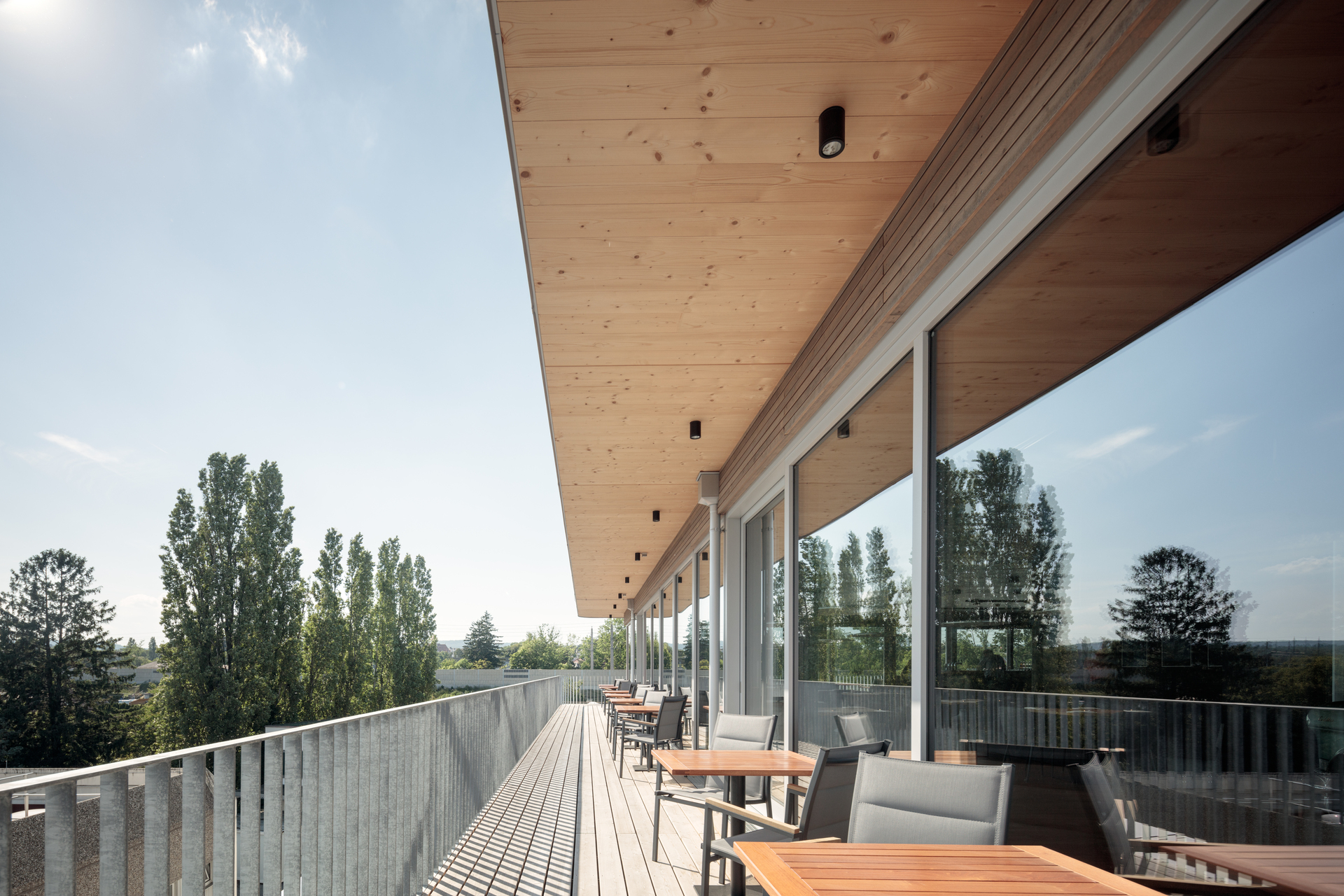 Die Eventlocation ist an drei Seiten von Terrassen umgeben, ergänzt durch eine großzügige Terrassenfläche auf dem Flachdach.