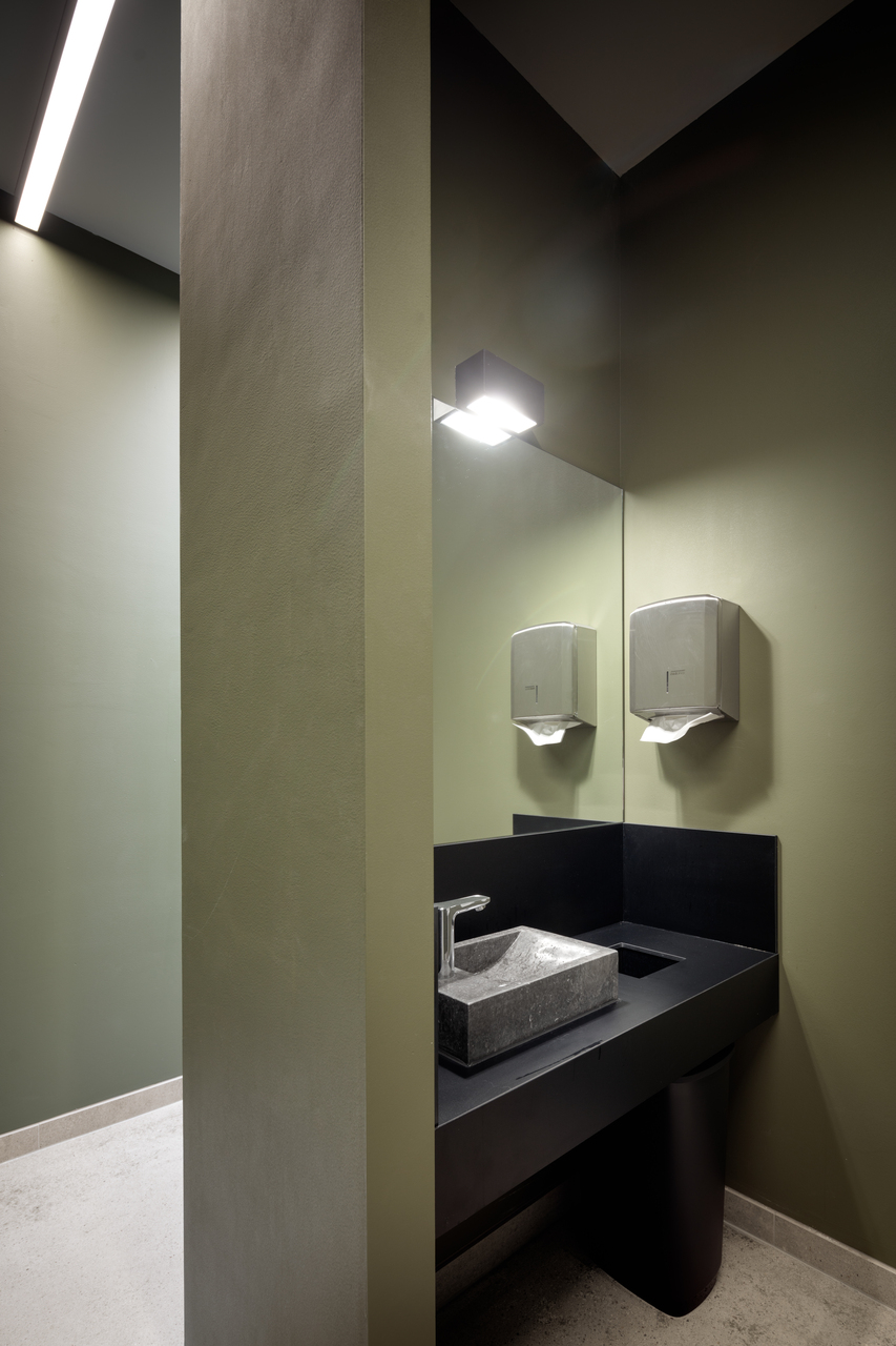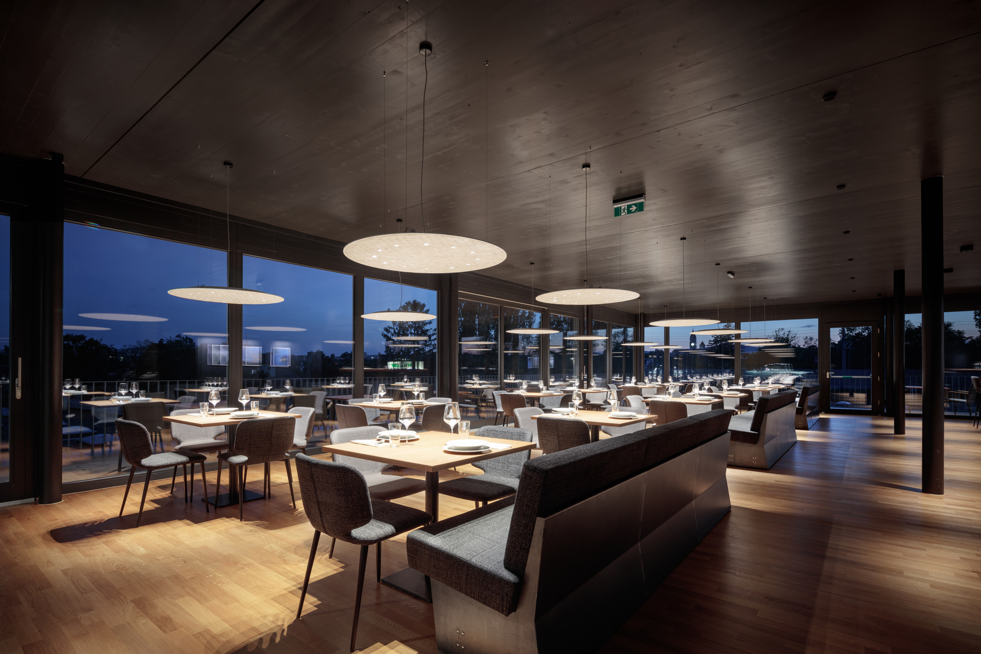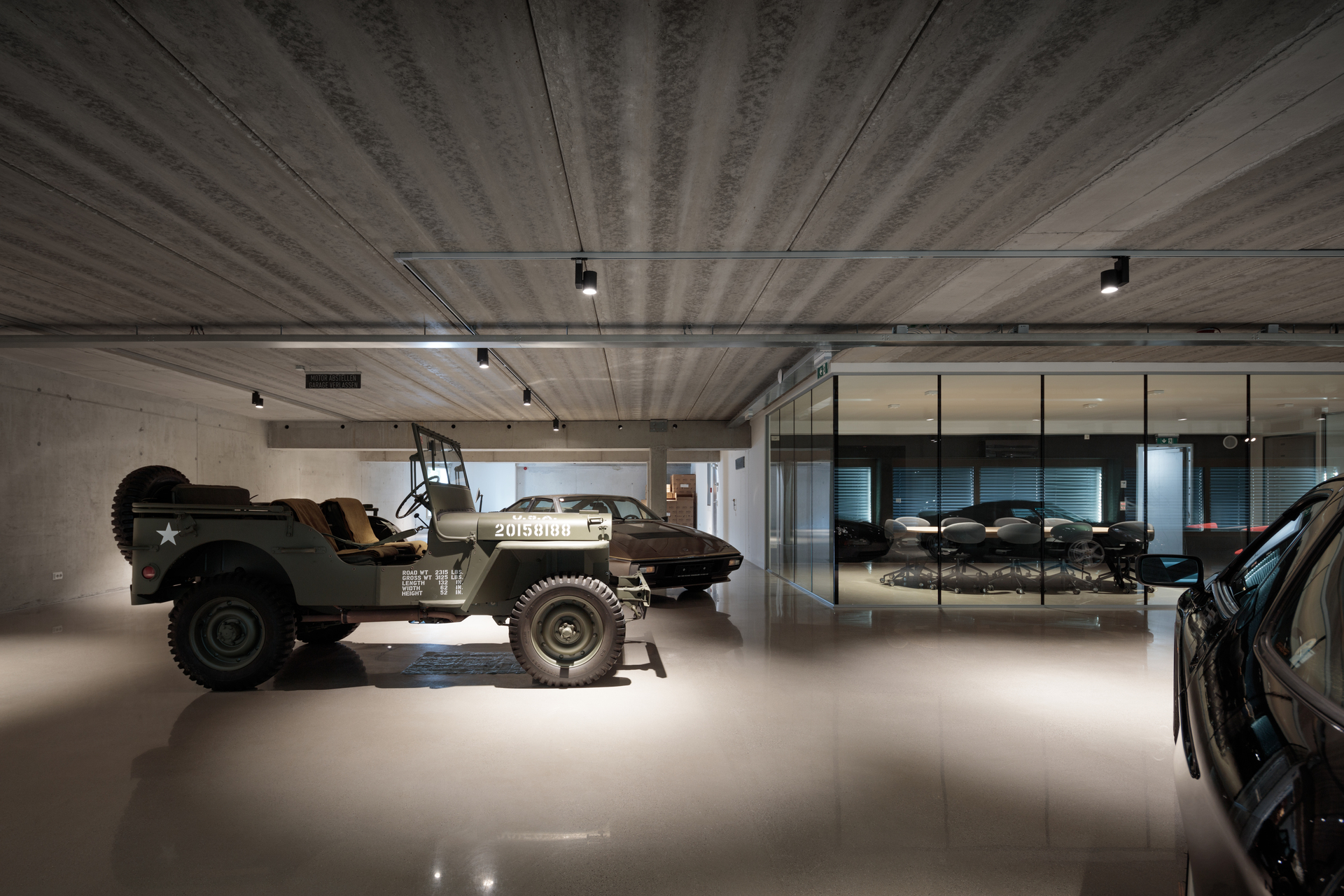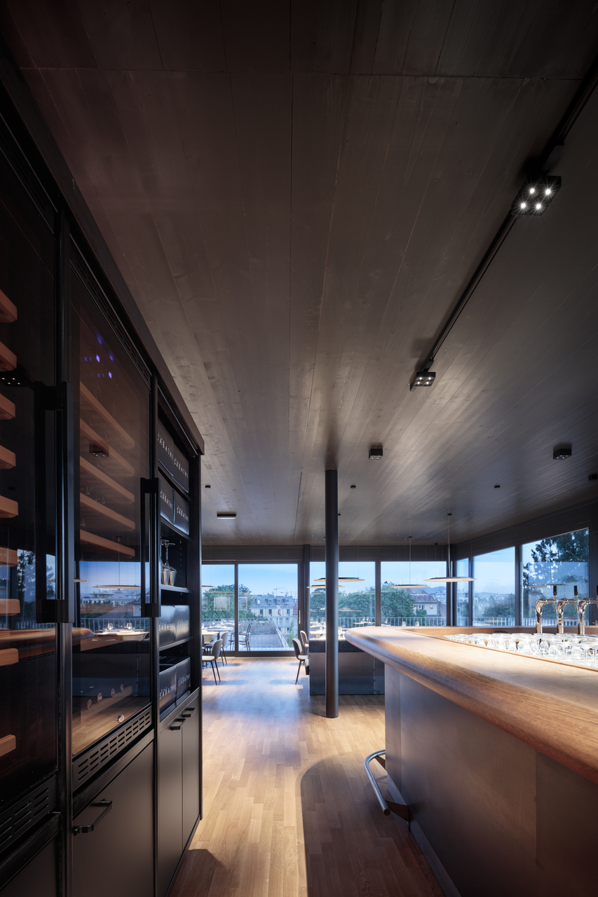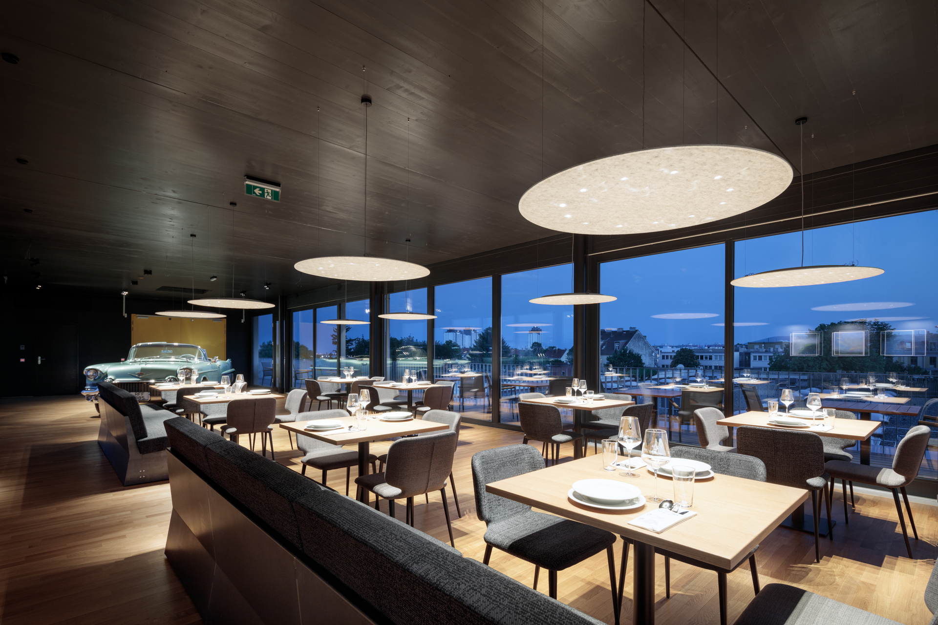 Im obersten Geschoss befinden sich Büroflächen und eine Eventlocation mit integrieter Bar und mehreren Terrassen auf zwei Ebenen. Das Staffelgeschoss ist aus gewichtsgründen in Leichtbauweise konstruiert (Pfosten-Riegelkonstruktion und Brettsperrholzplattendecken) und in dieser Eigenschaft in Fassade und hölzernem Vordach ablesbar. Entsprechend dem industriell-technischen Automobil-Thema sind die Innenoberflächen weitgehend in Schwarz gehalten, mit Ausnahme von Holzboden und metallener Bar. Besonders wichtig deshalb: die Belichtung. Über den Tischen wurden „Lighting Pads“ verwendet, durch deren Lichtlinsen die Lichtquelle nicht als solche direkt ersichtlich ist. Das Licht wird auf den belichteten Oberflächen, also Tischen und Speisen, sichtbar. Die textilen Unterseiten der Leuchten sind zudem akustisch wirksam.